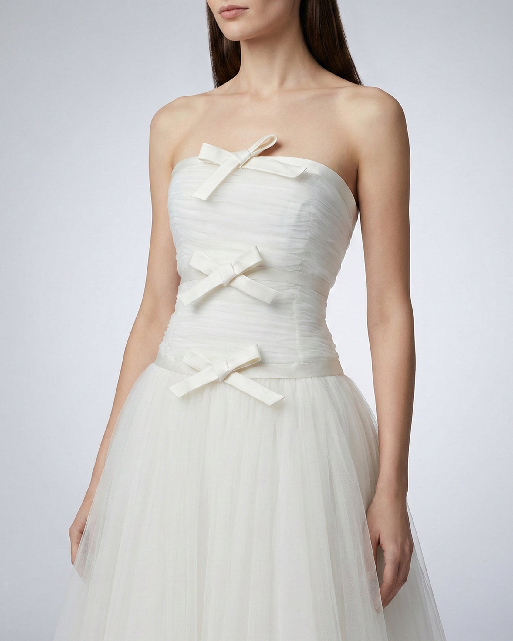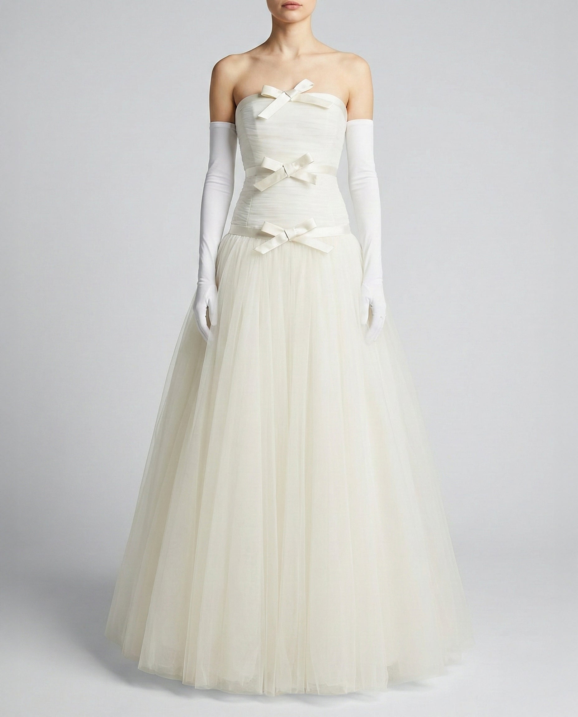- Strapless tulle gown with bow accents and matching gloves