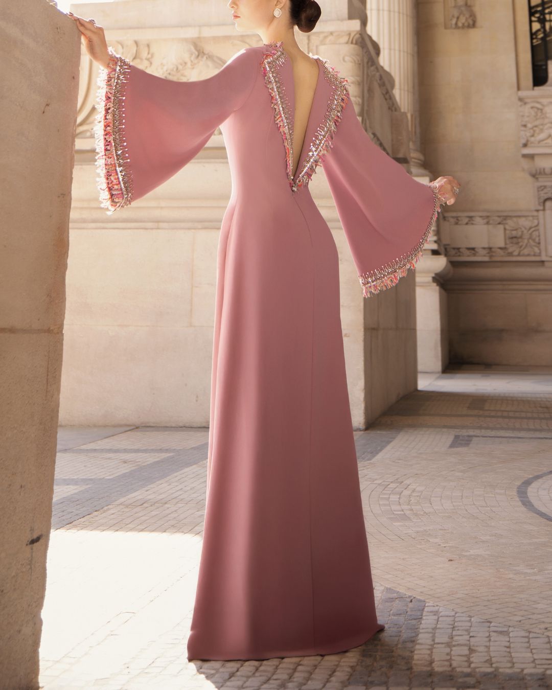 Crafted from luxurious crepe, this timeless gown drapes elegantly in an A-line silhouette. The bell sleeves and neckline are embellished with delicate floral details, adding a touch of whimsical charm. Perfect for a sophisticated evening affair or special occasion.
