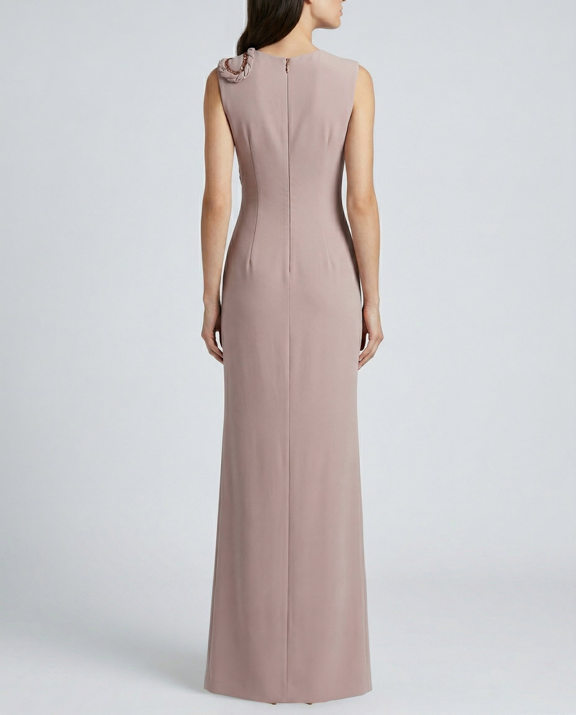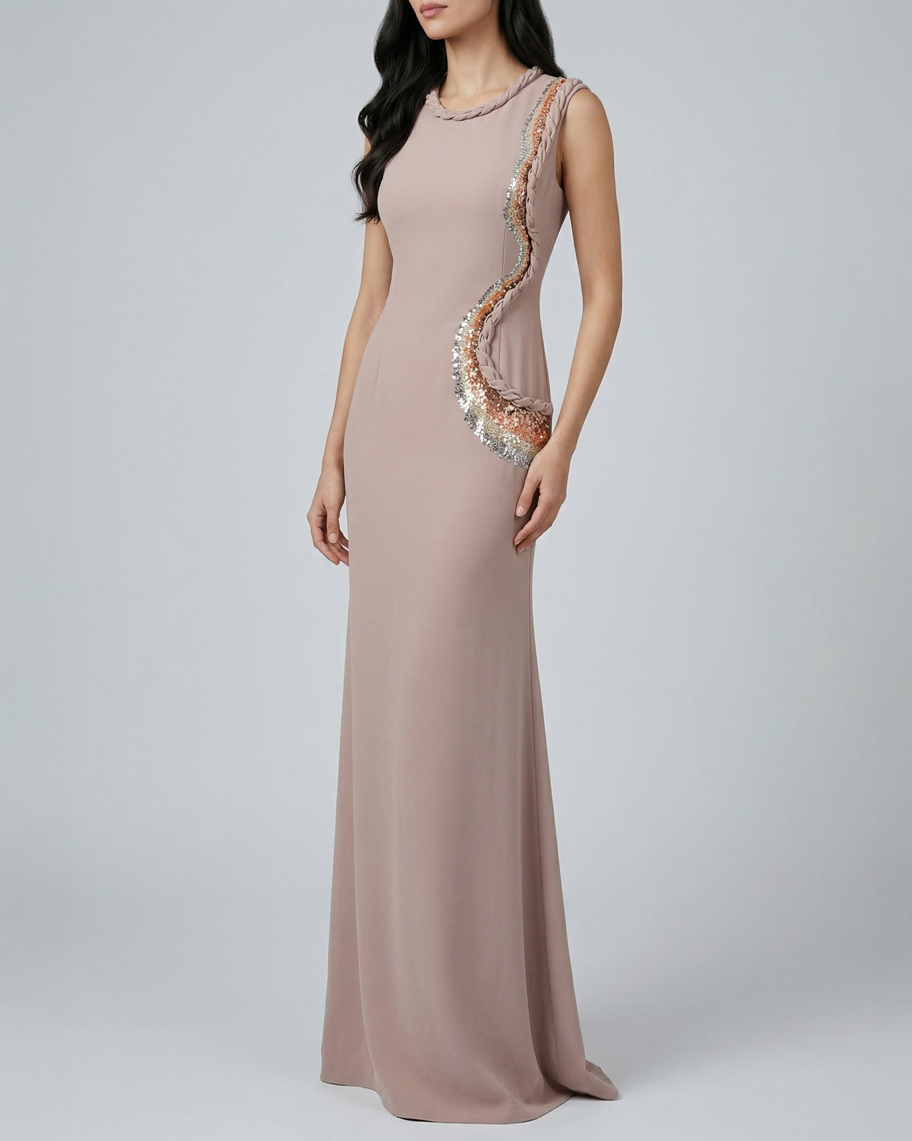 - This sophisticated floor-length gown features a refined sheath silhouette and exquisite braided detailing. Glistening sequined accents flow gracefully down the side, offering a touch of opulence and glamour for high-profile evening events.