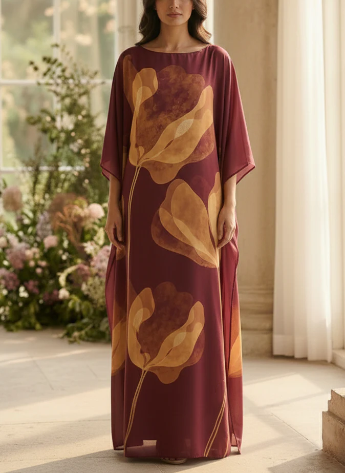 An ethereal kaftan made in flowing georgette, showcasing a rich burgundy base adorned with oversized peach tulip motifs in an all-over artistic print. Styled with a refined boat neckline and elegant full sleeves, the silhouette drapes effortlessly for a graceful, elongated effect.