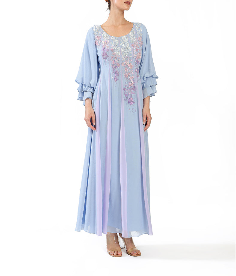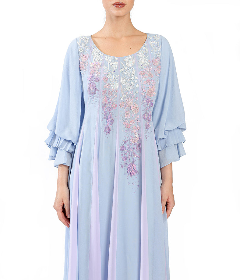 Flowing, light blue maxi dress with embroidered detailing and ruffled sleeves, with light purple panels on the skirt