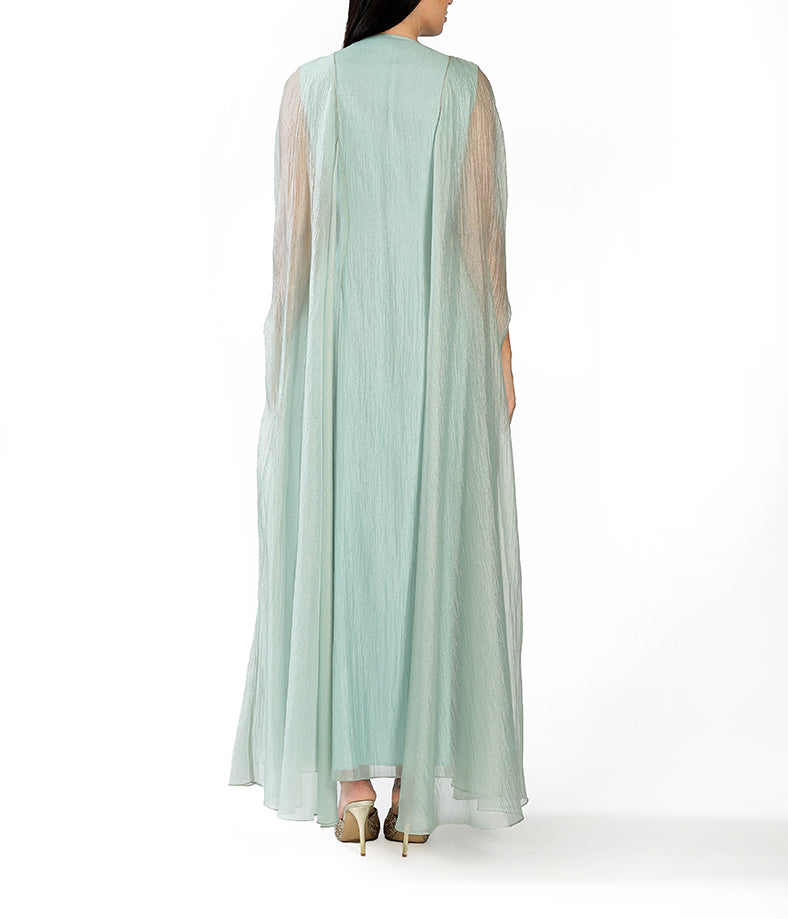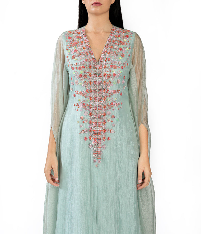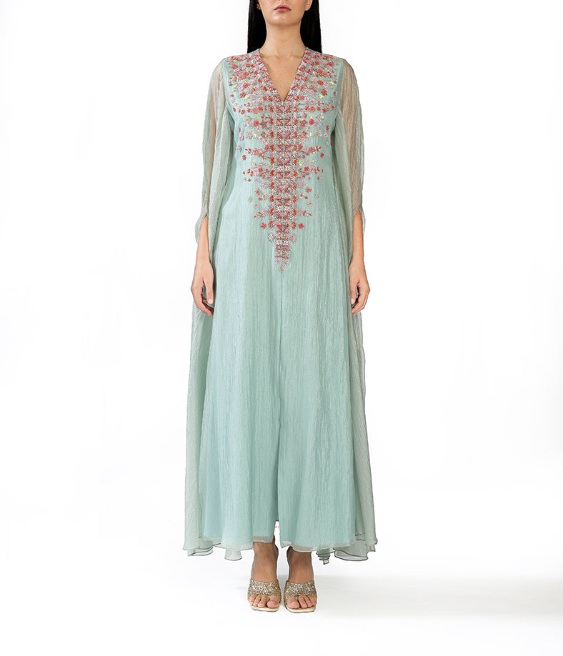 - Light blue maxi dress with multicolor floral embroidery on the bodice and sheer cape sleeves.