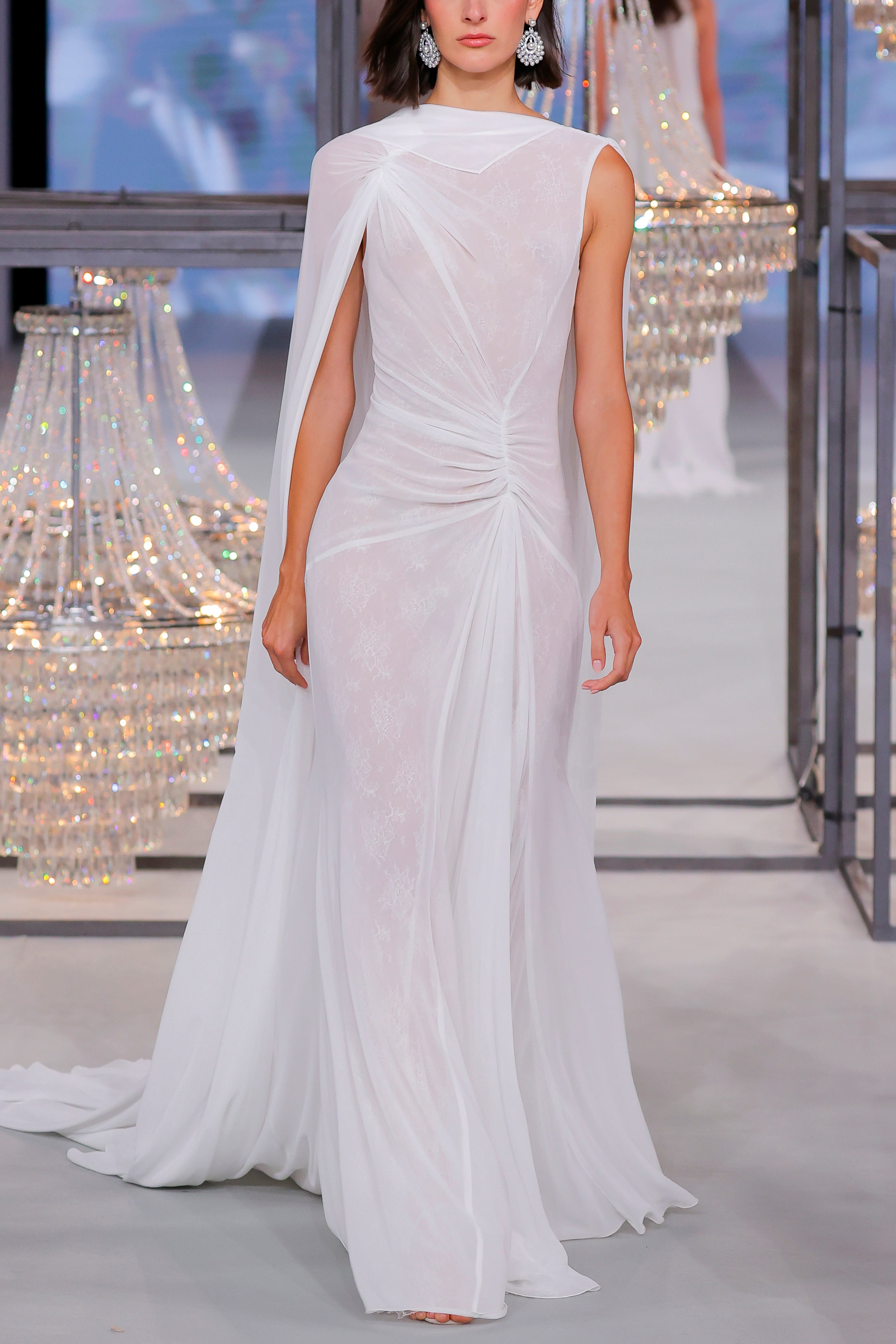 Sheer, white, floor length gown with a lace underlay and chiffon overlay. Includes a shoulder accent with a flowing back detail.