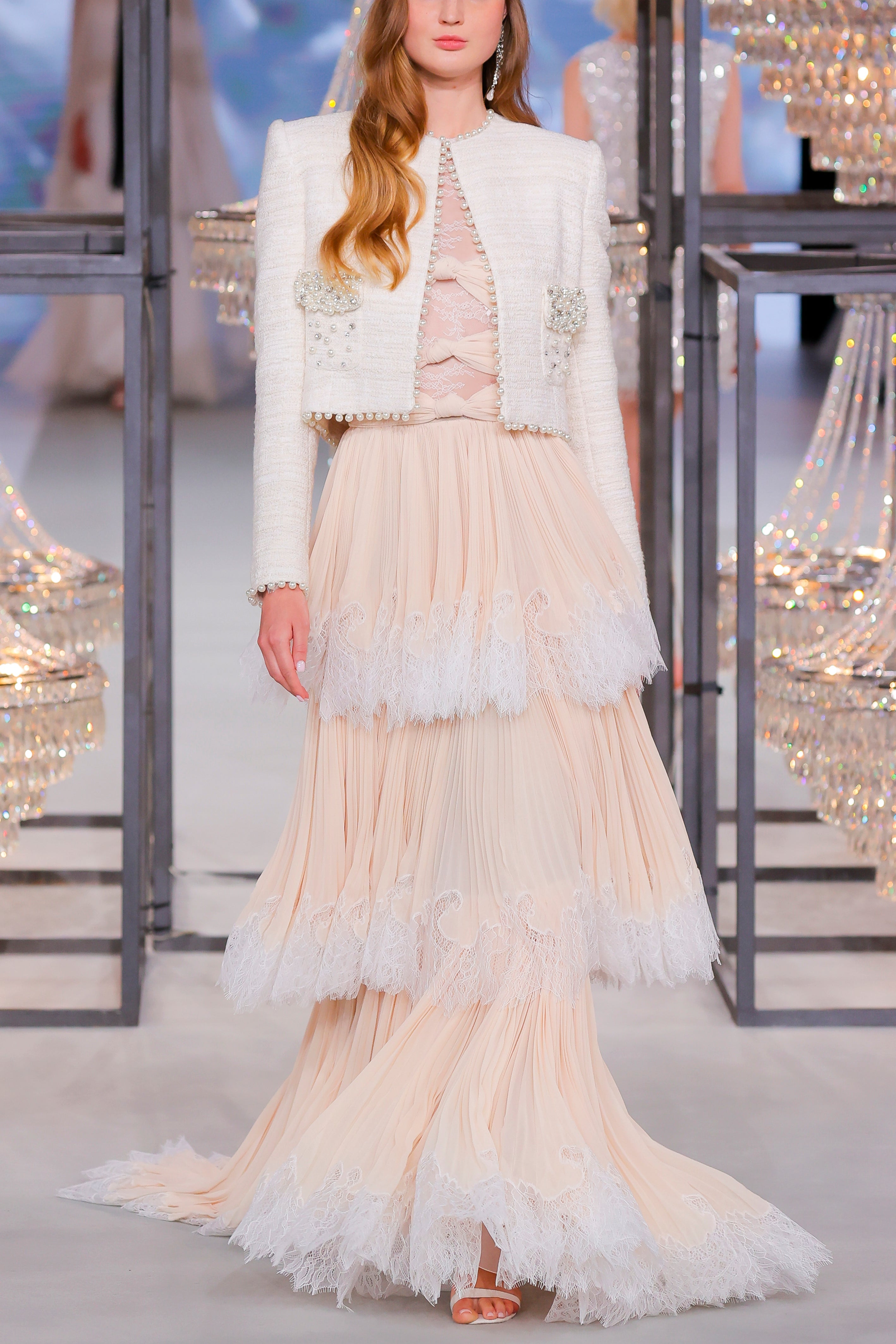 - A blush, tiered chiffon gown paired with a cropped, embellished jacket.