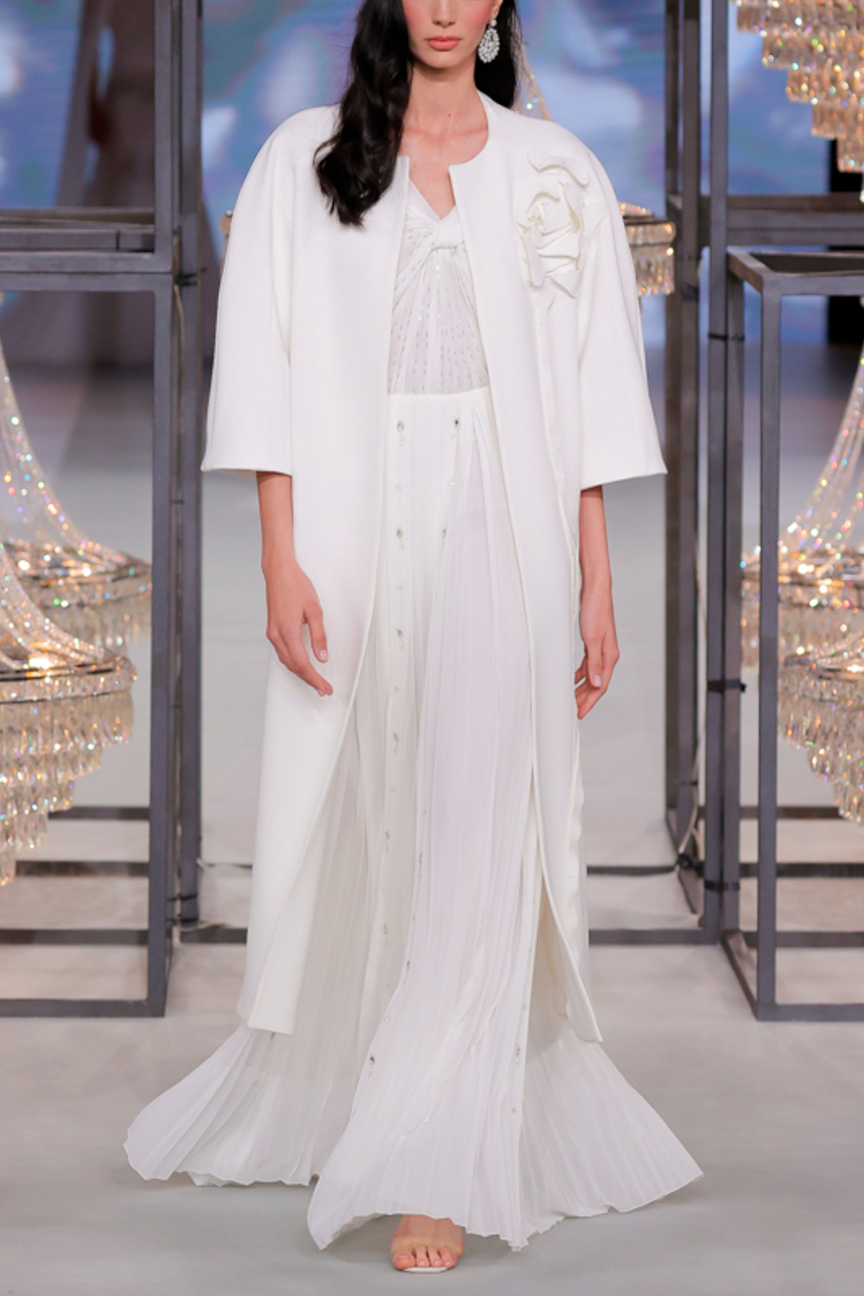 A crisp white coat detailed with a floral embellishment paired with a matching pleated dress adorned with subtle beadwork.