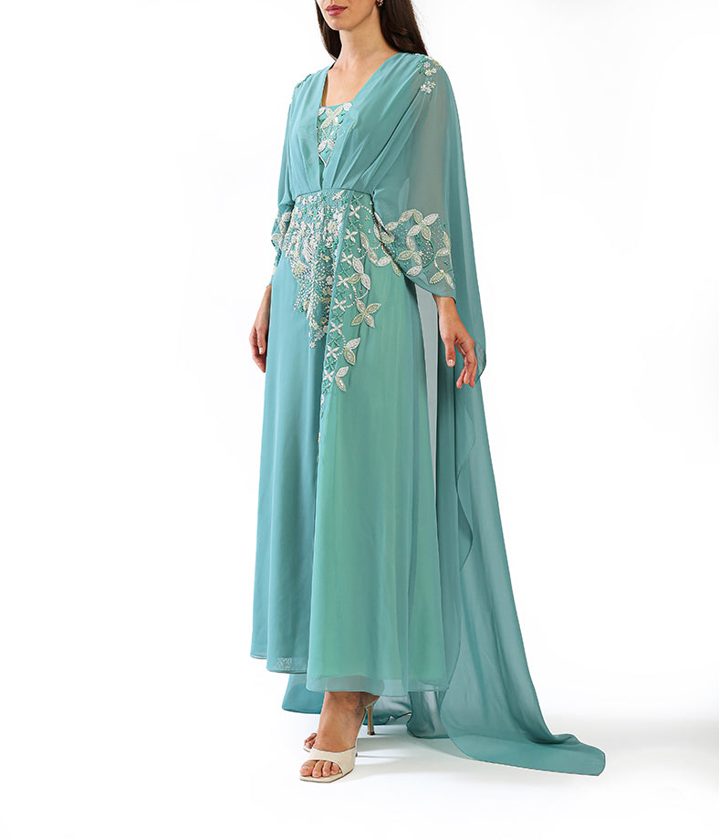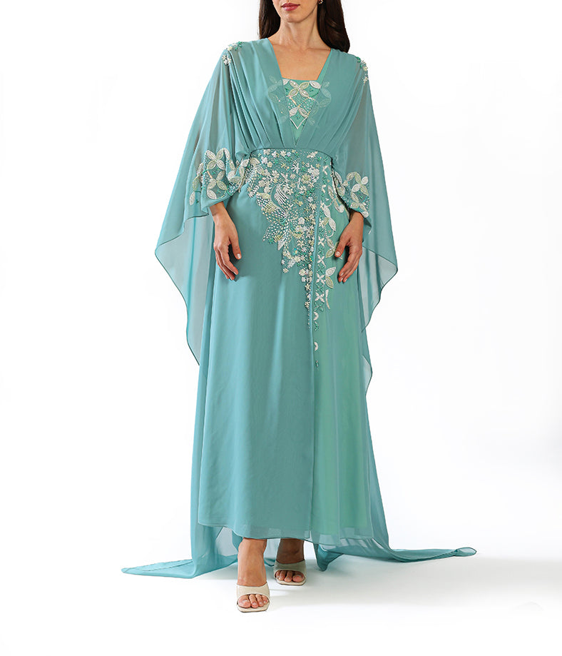 - Teal flowing chiffon abaya with delicate floral beadwork