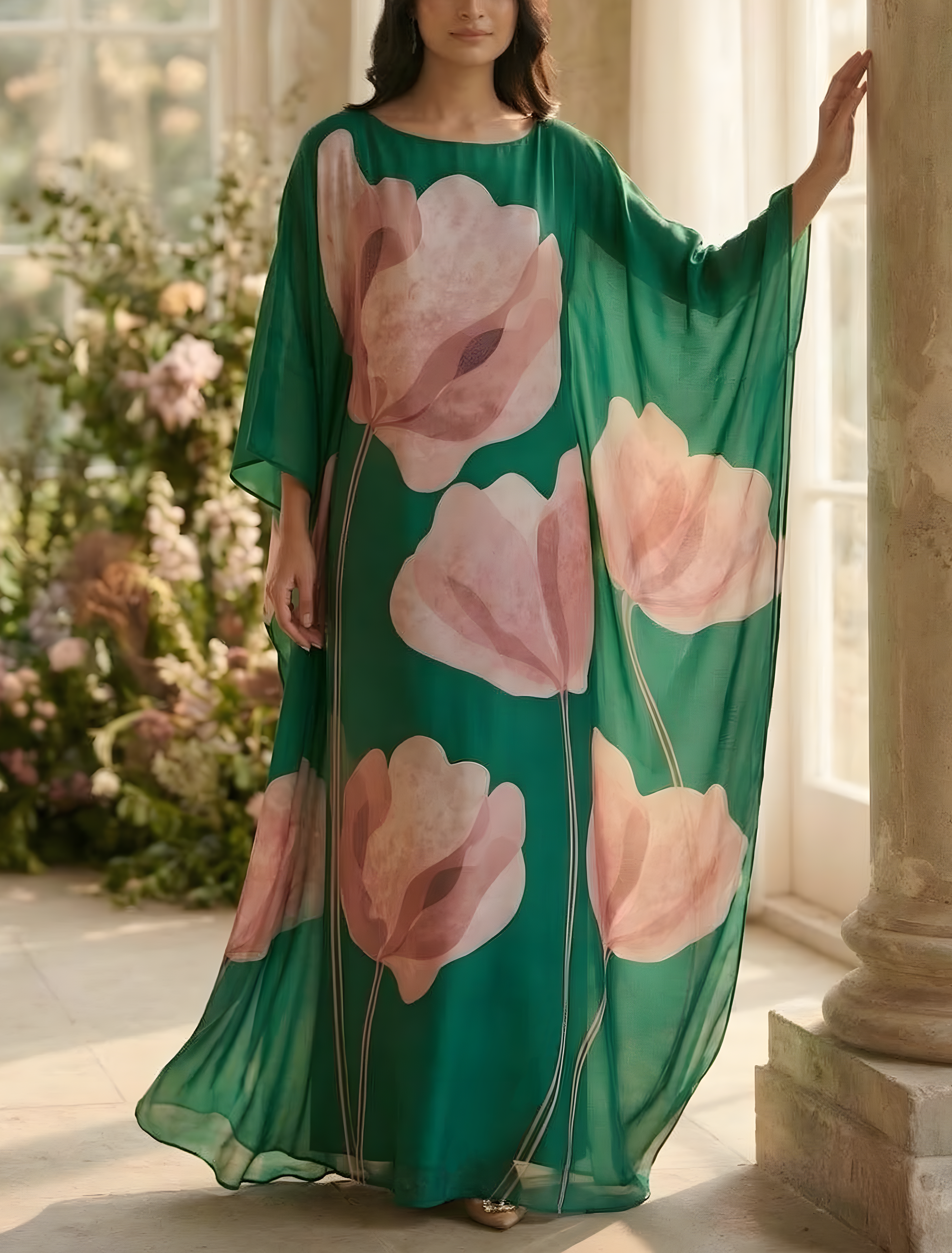 An ethereal kaftan made in flowing georgette, showcasing a soft dusty pink base adorned with oversized mauve tulip motifs in an all-over artistic print. Styled with a refined boat neckline and elegant full sleeves, the silhouette drapes effortlessly for a graceful, elongated effect.