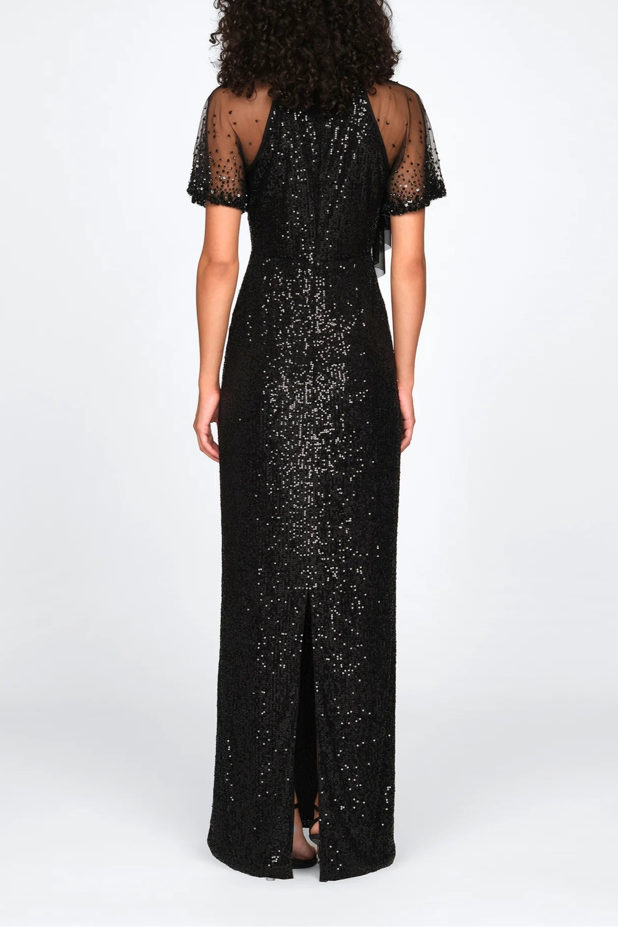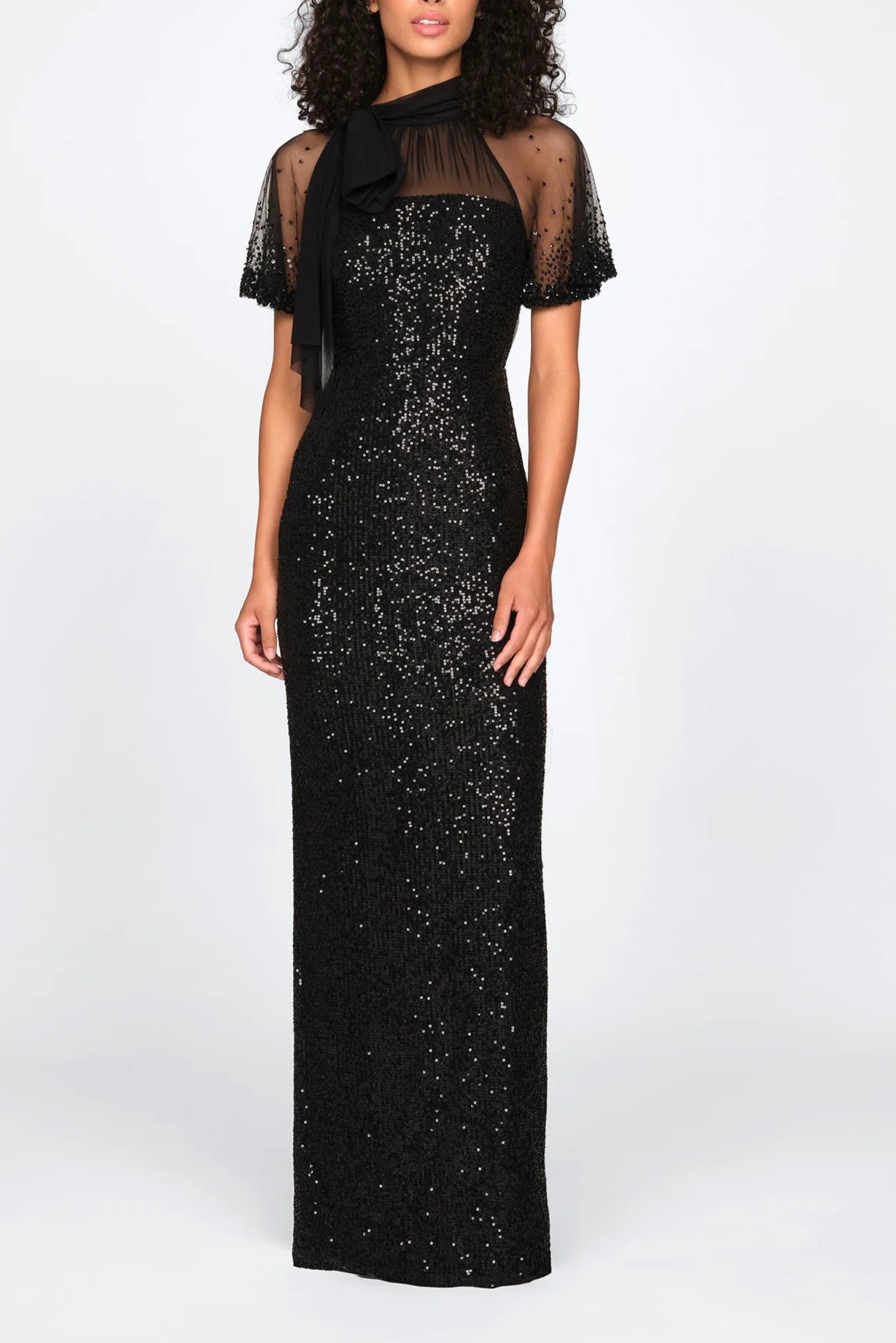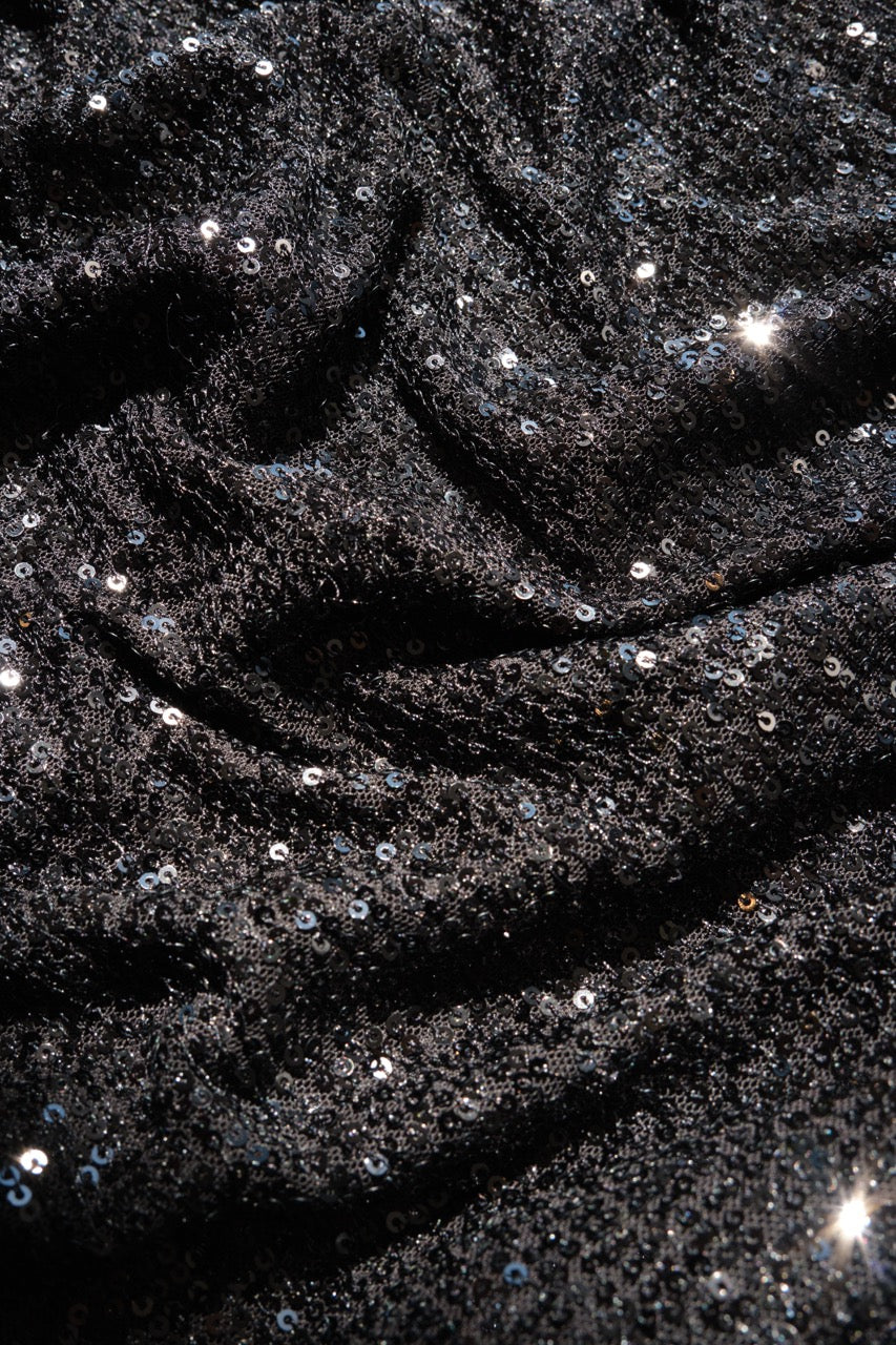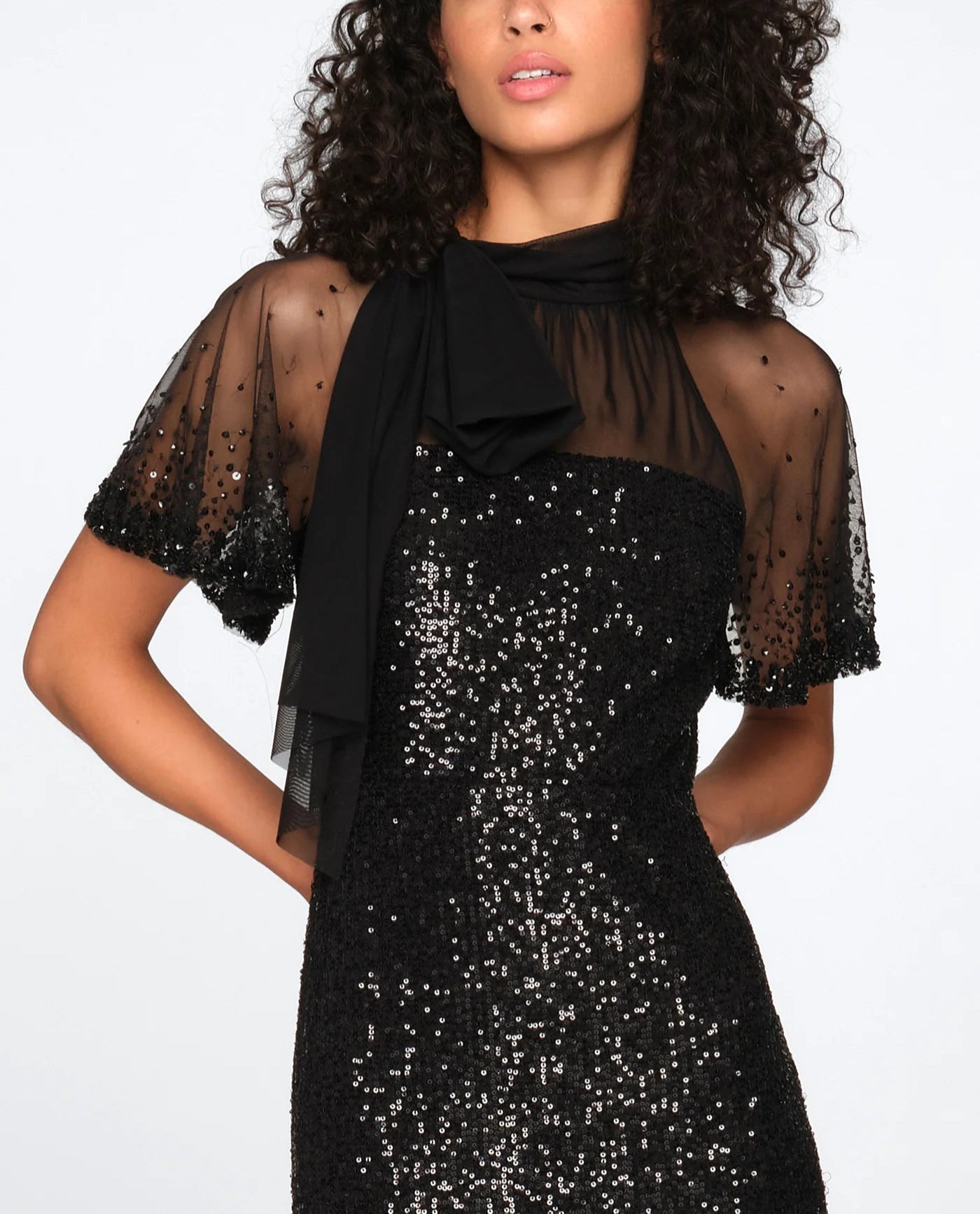 Allover stretch sequins catch the light with every move. Velvet lace cutouts and subtle shimmer add moody texture—tres chic for black-tie evenings.