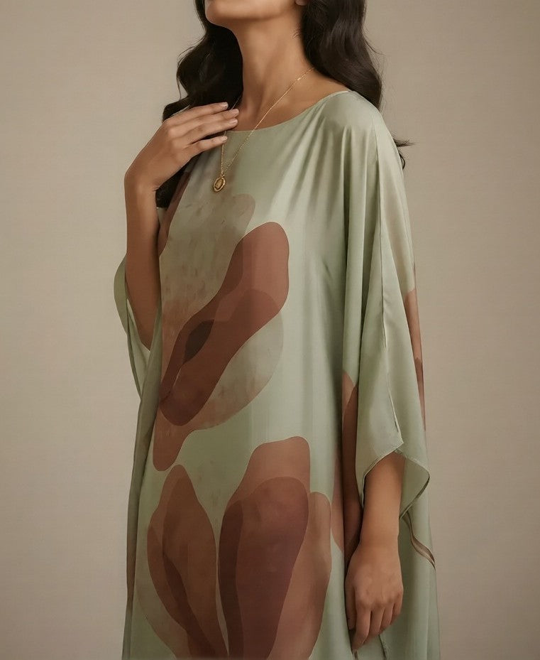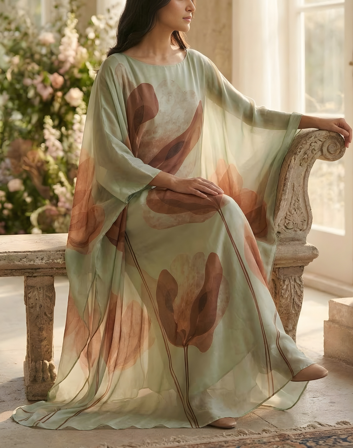 An ethereal kaftan made in flowing georgette, showcasing a pistachio green base adorned with oversized mauve tulip motifs in an all-over artistic print. Styled with a refined boat neckline and elegant full sleeves, the silhouette drapes effortlessly for a graceful, elongated effect.