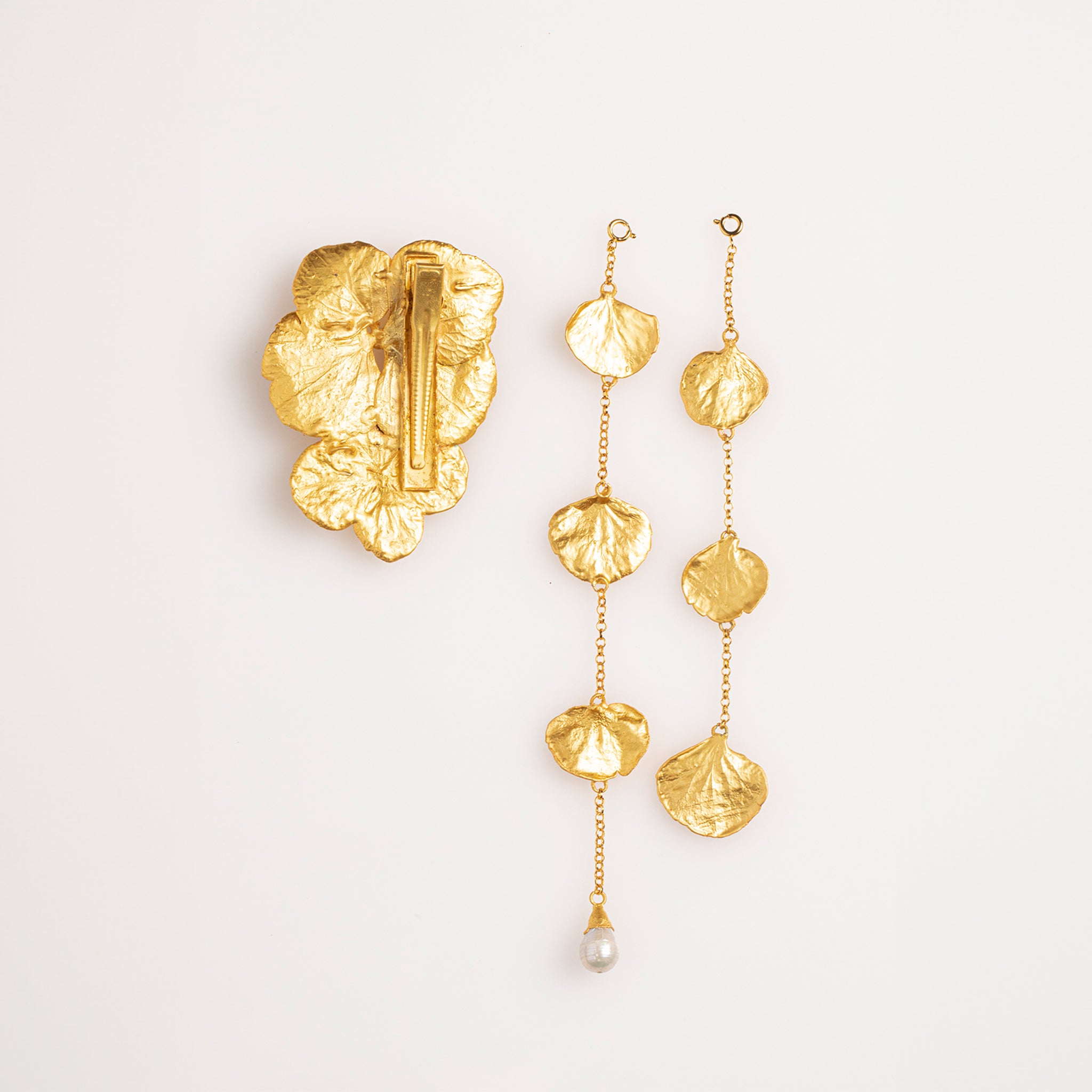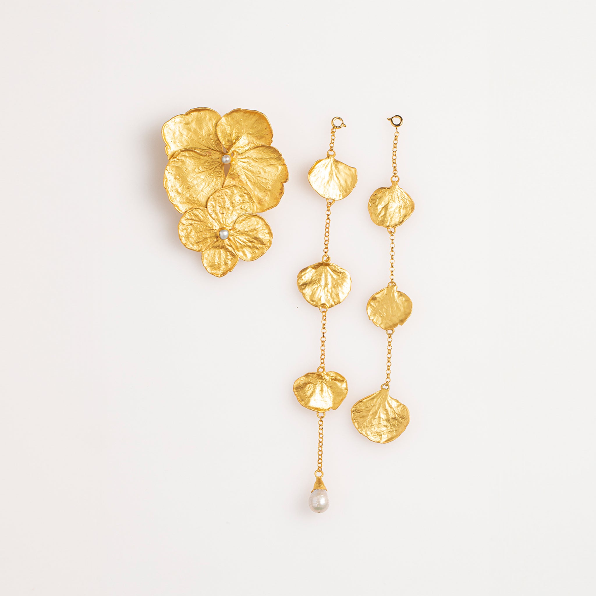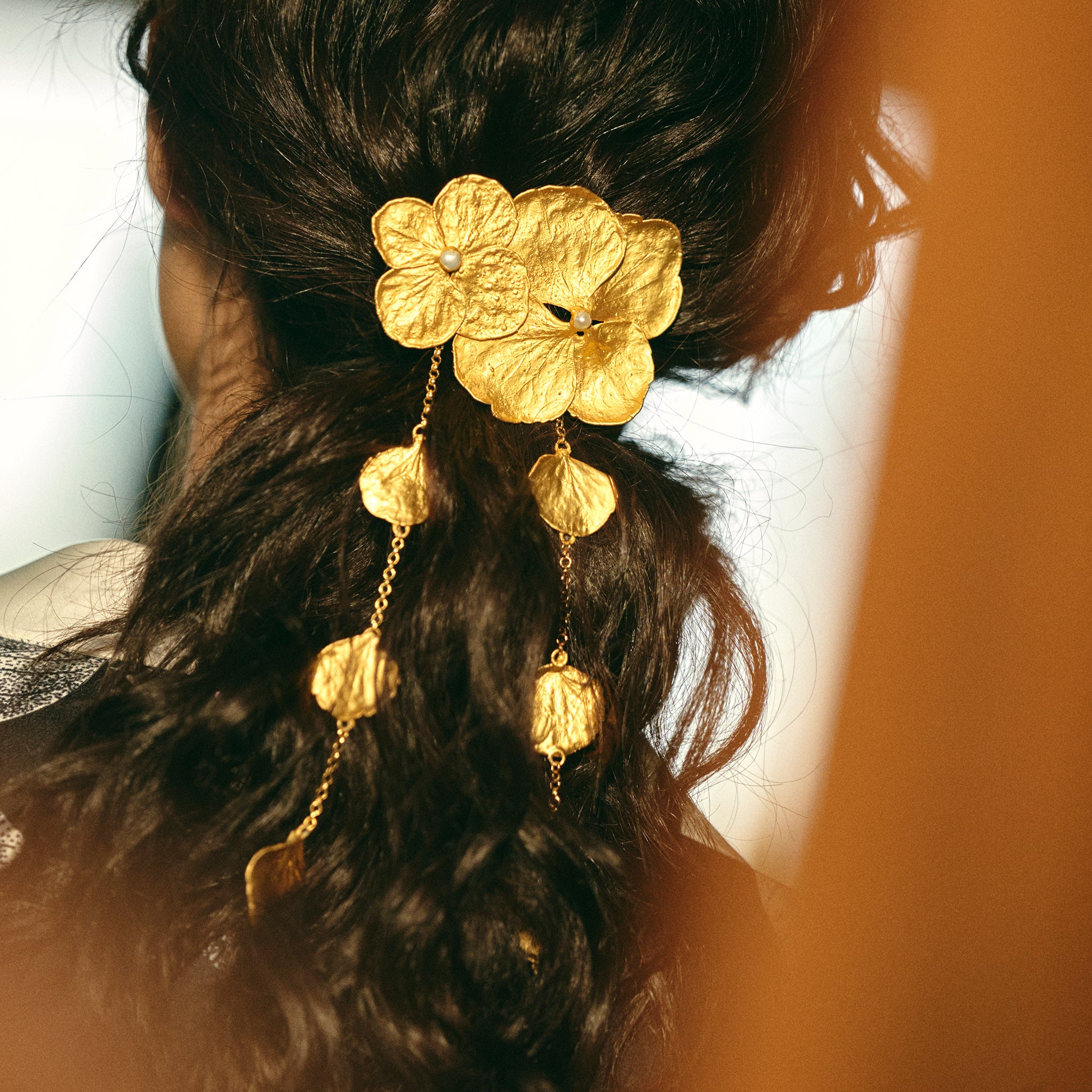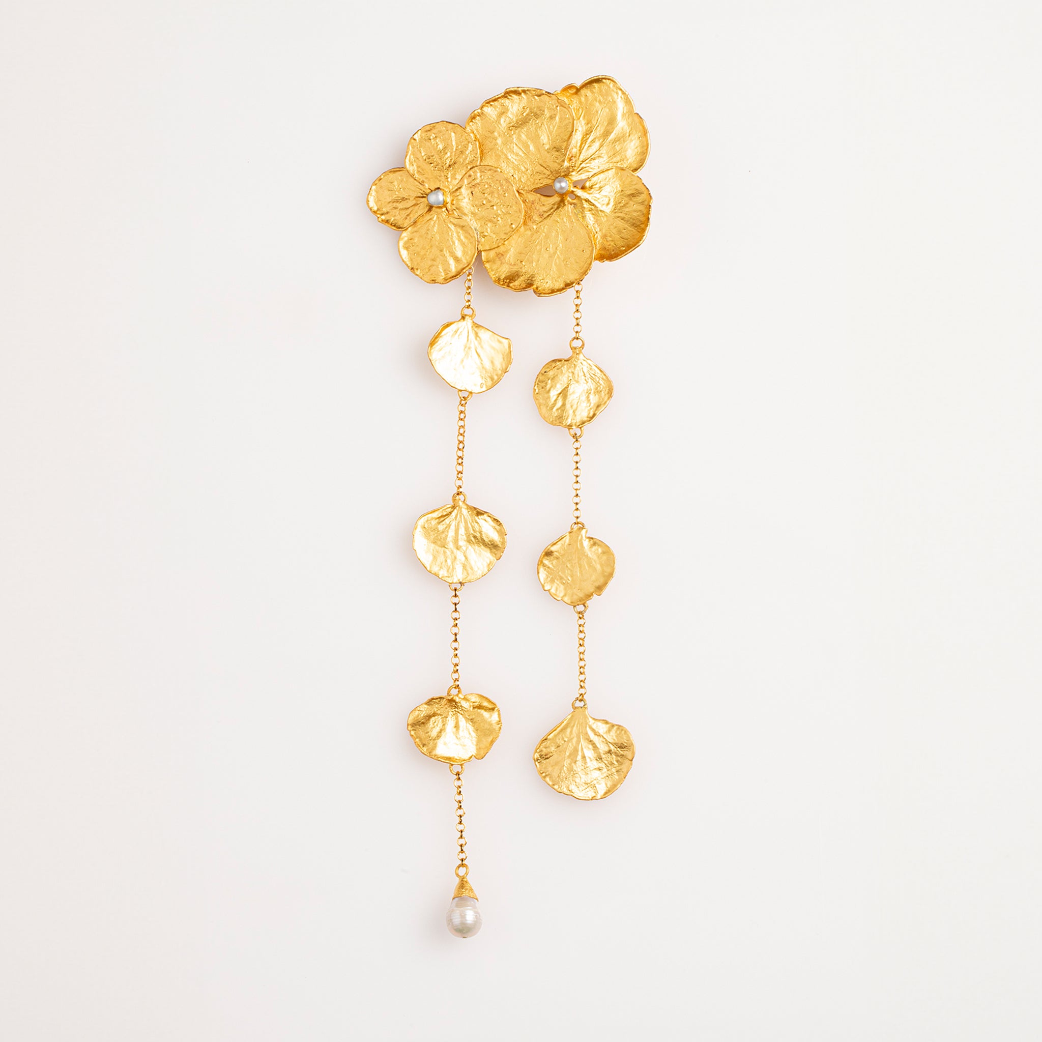 - The Double Hydrangea And Pearl Bead Pin Features Two Dried Hydrangea Flowers, Gold-Metallized To Highlight Their Natural Texture, And Accented With Pearls For A Unique, Elegant Touch.