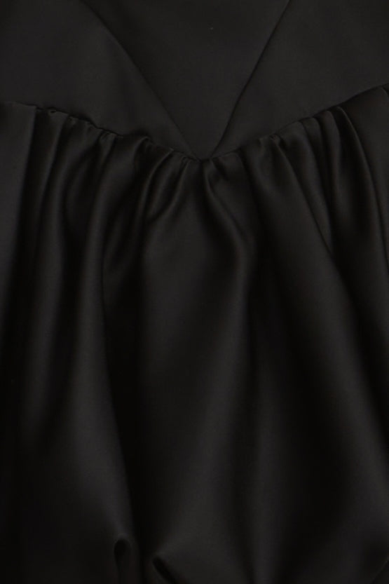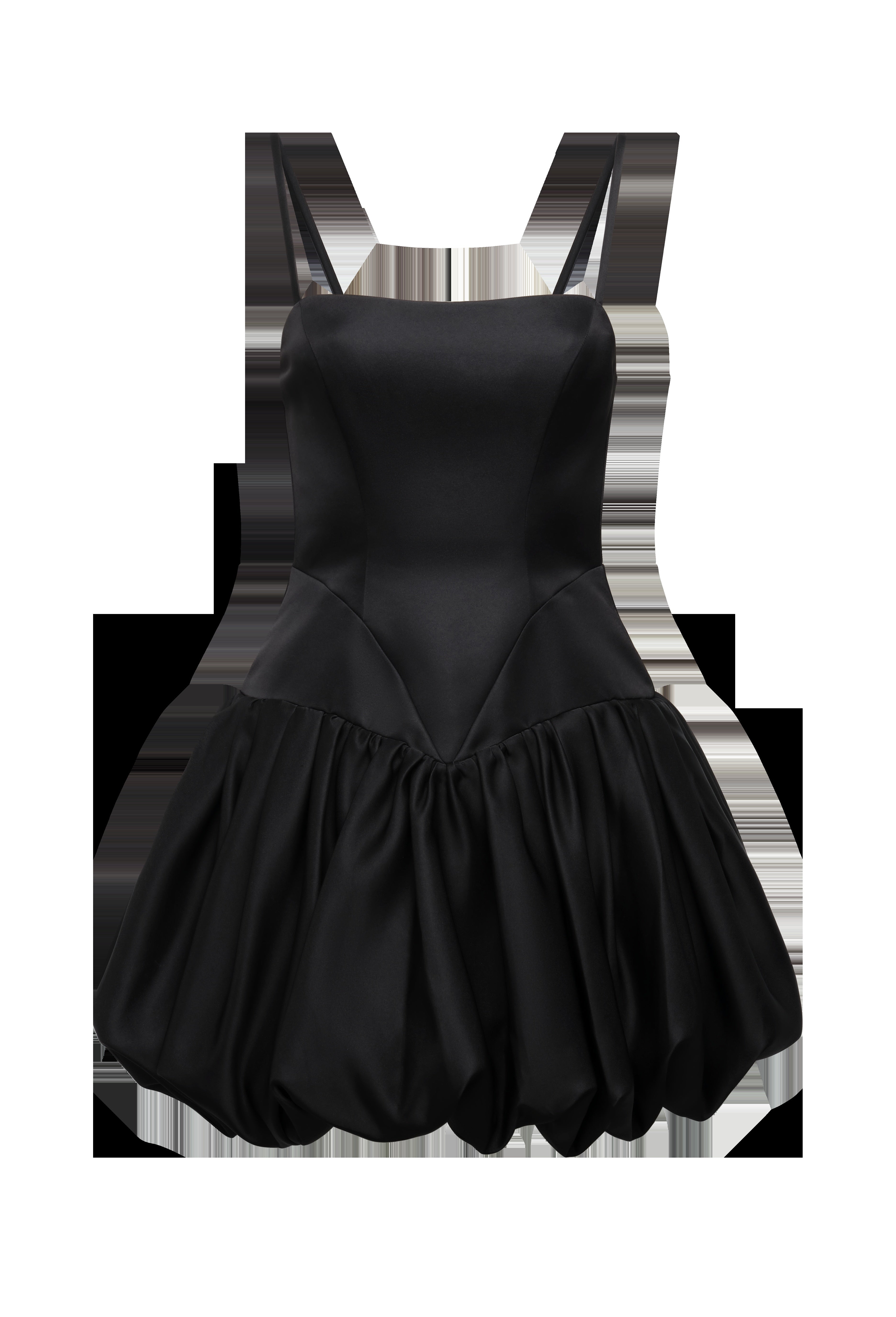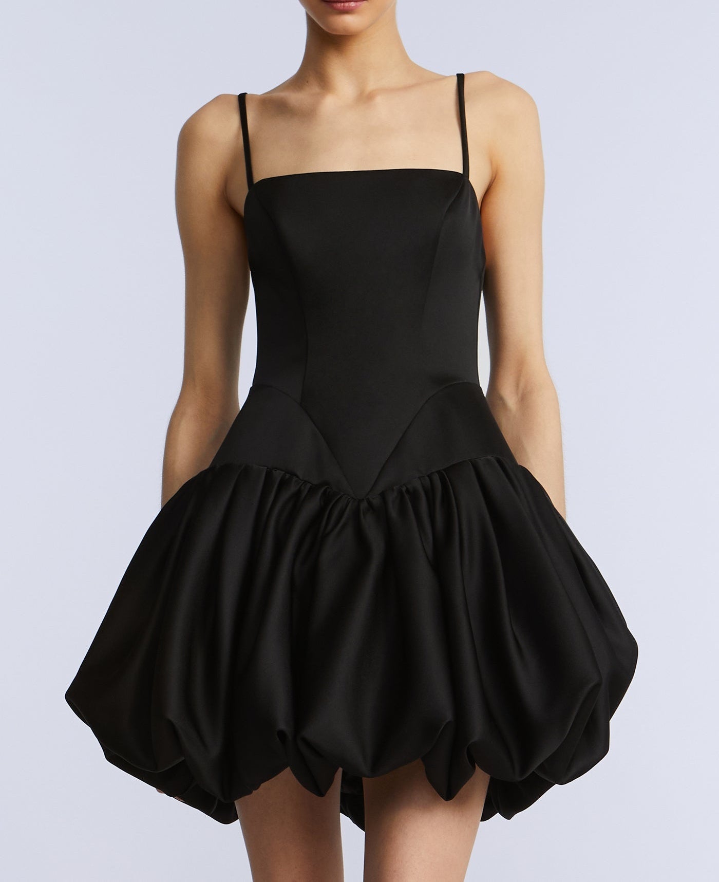 Satin mini dress with a sculpted bodice and voluminous gathered skirt. Finished with princess seams and skinny straps for a modern ballerina feel. A playful pick for cocktail parties, birthday dinners, or NYE nights out.