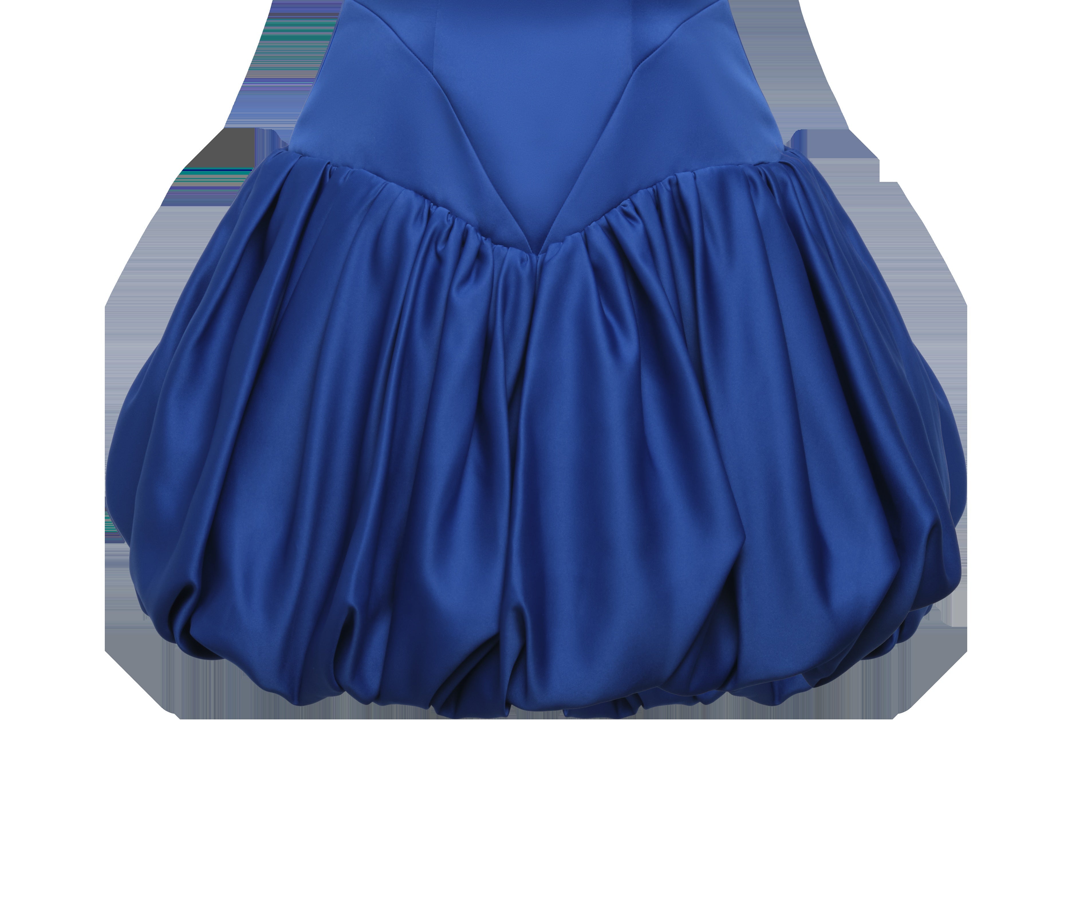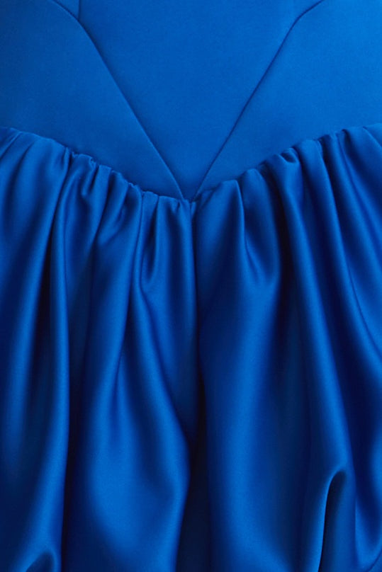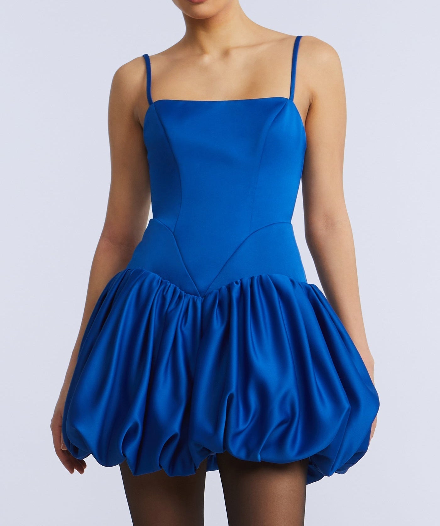 Satin mini dress with a sculpted bodice and voluminous gathered skirt. Finished with princess seams and skinny straps for a modern ballerina feel. A playful pick for cocktail parties, birthday dinners, or NYE nights out.