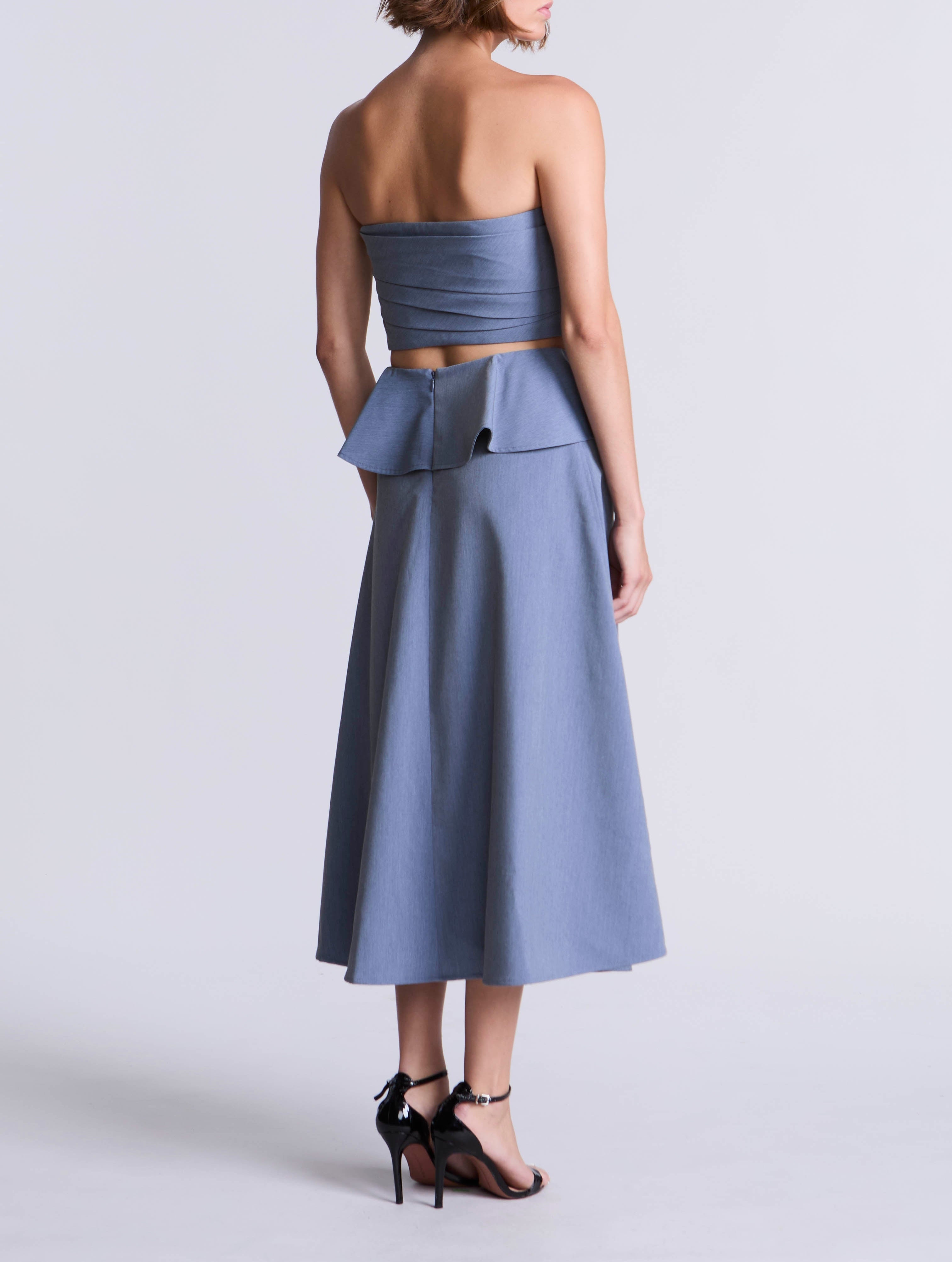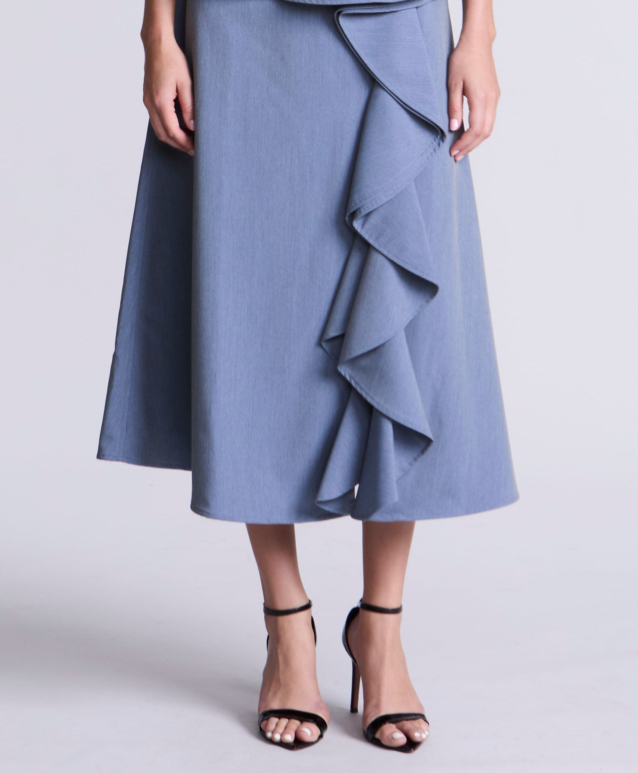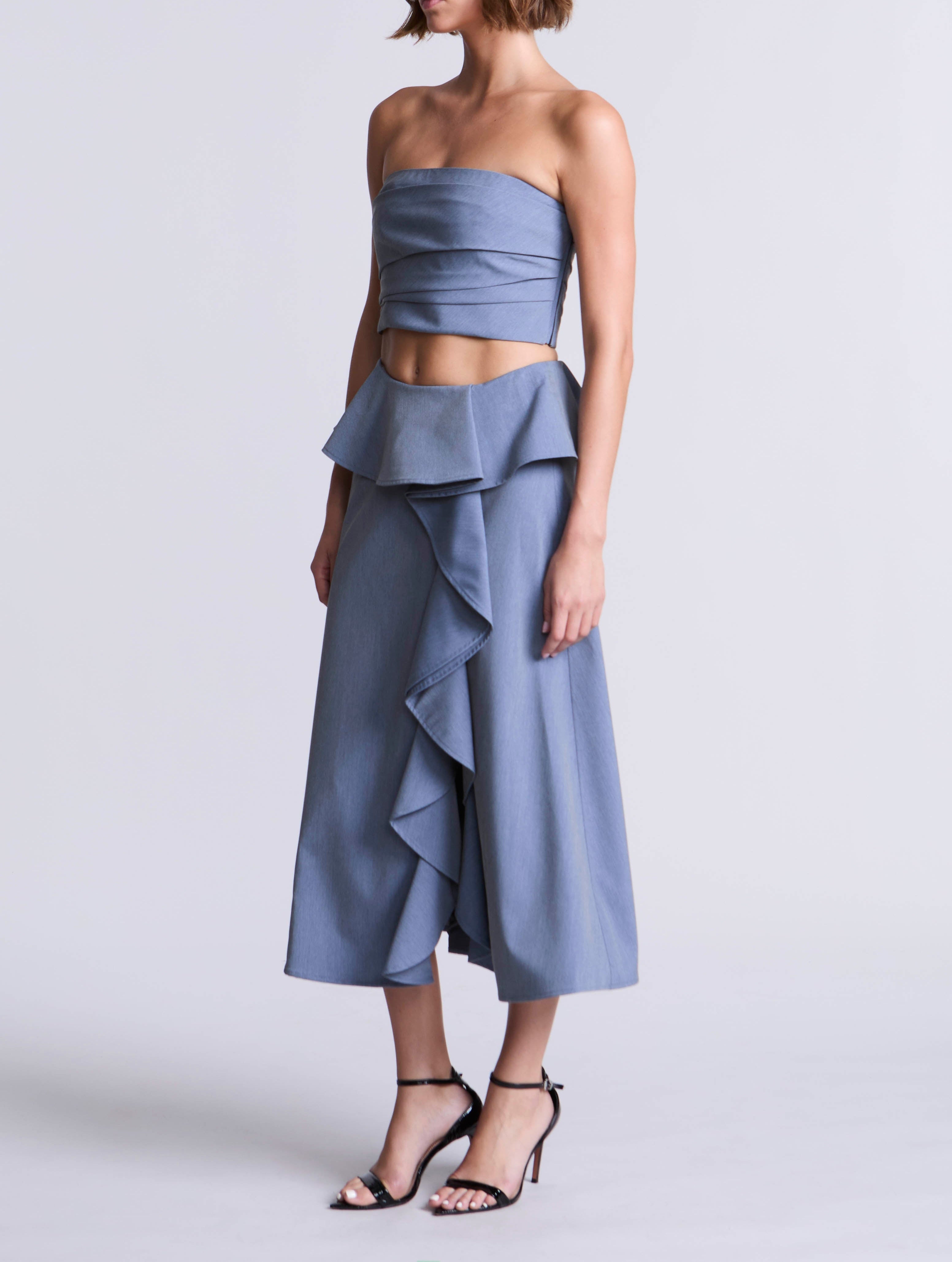 Chambray-inspired skirt with a flounced peplum waist and cascading front ruffle. Cut in a midi length with subtle volume through the hem, it adds playful structure to warm-weather looks. Wear it with the matching top or a tucked-in tee for easy polish.