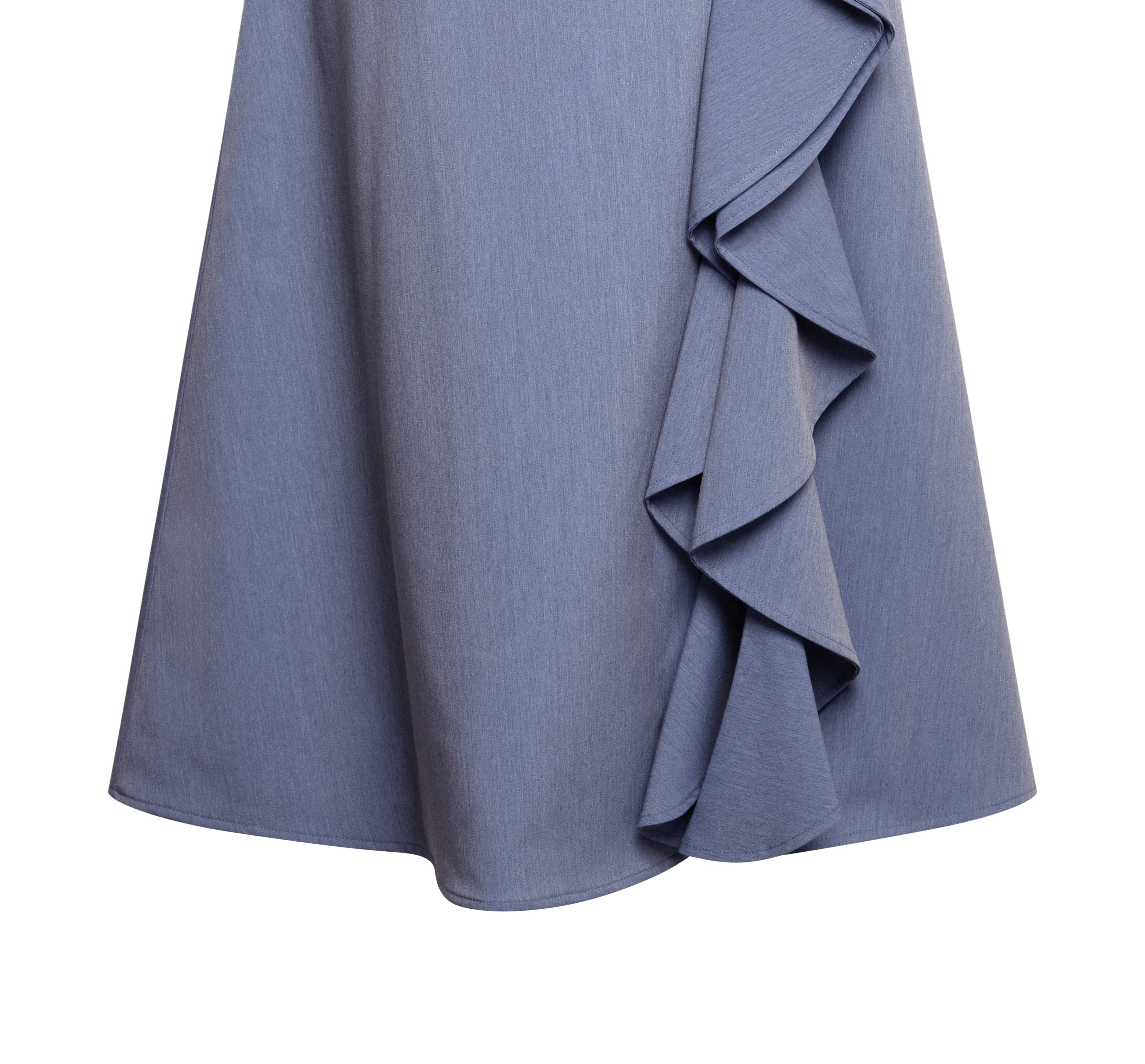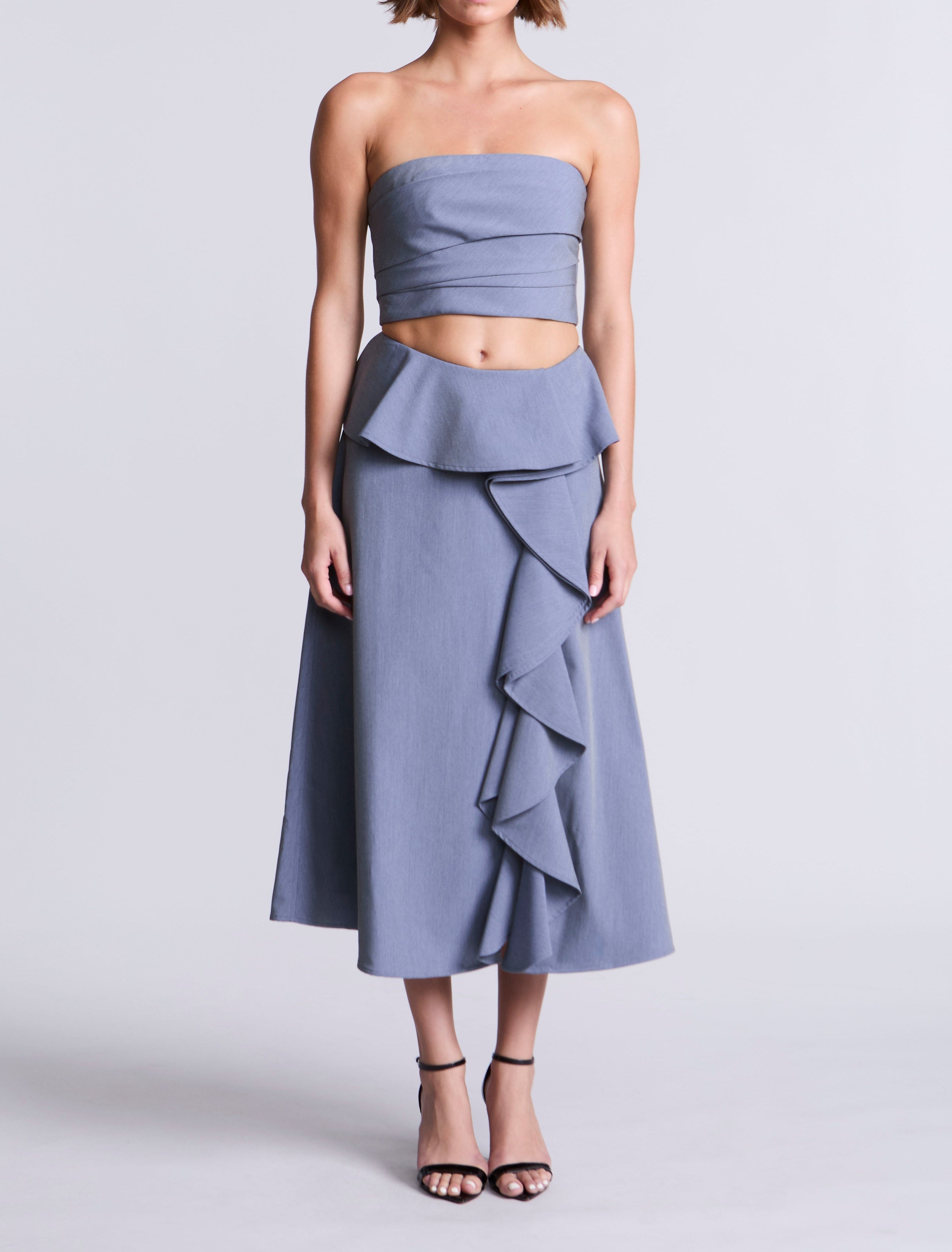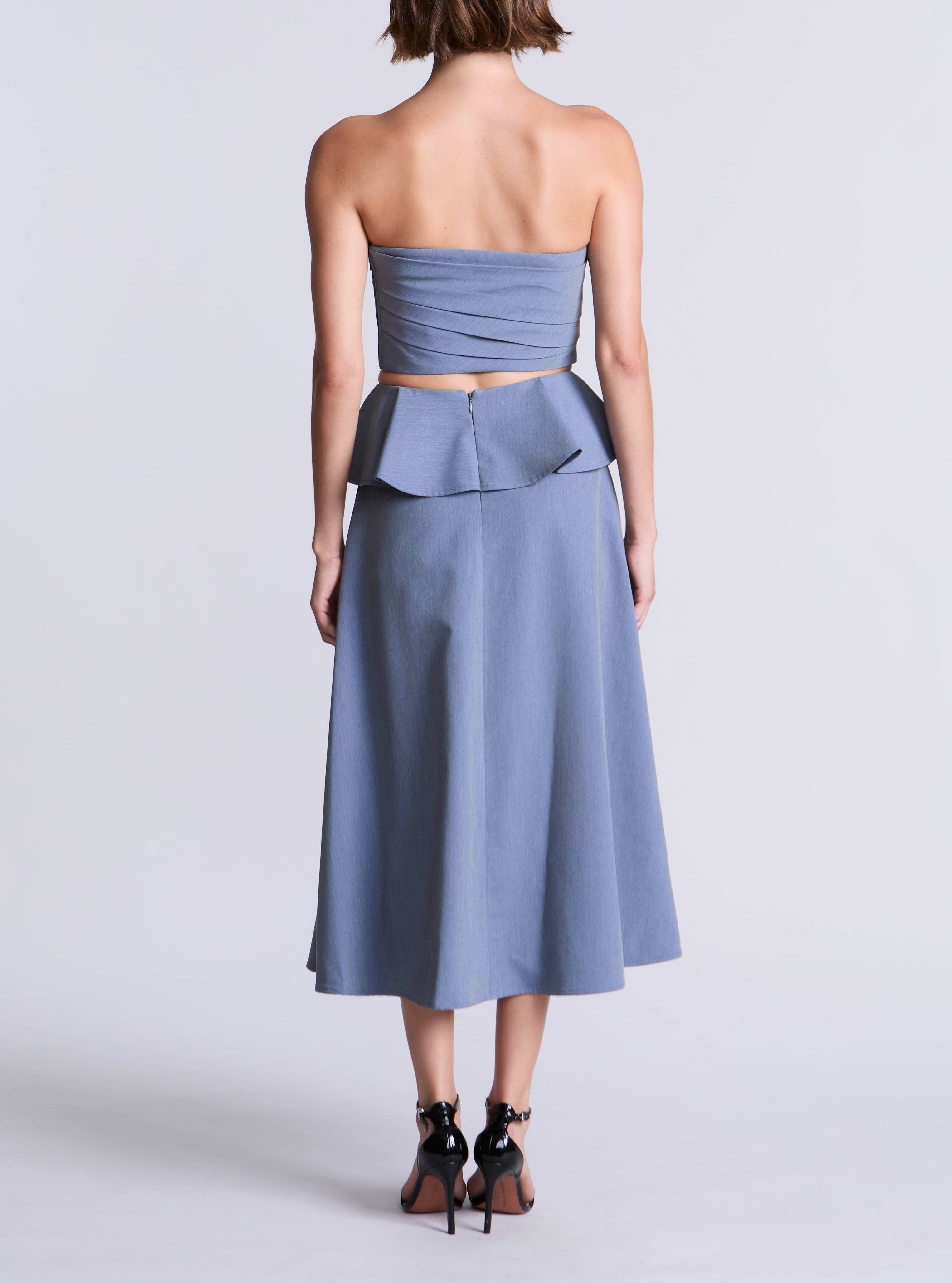 Chambray-inspired skirt with a flounced peplum waist and cascading front ruffle. Cut in a midi length with subtle volume through the hem, it adds playful structure to warm-weather looks. Wear it with the matching top or a tucked-in tee for easy polish.