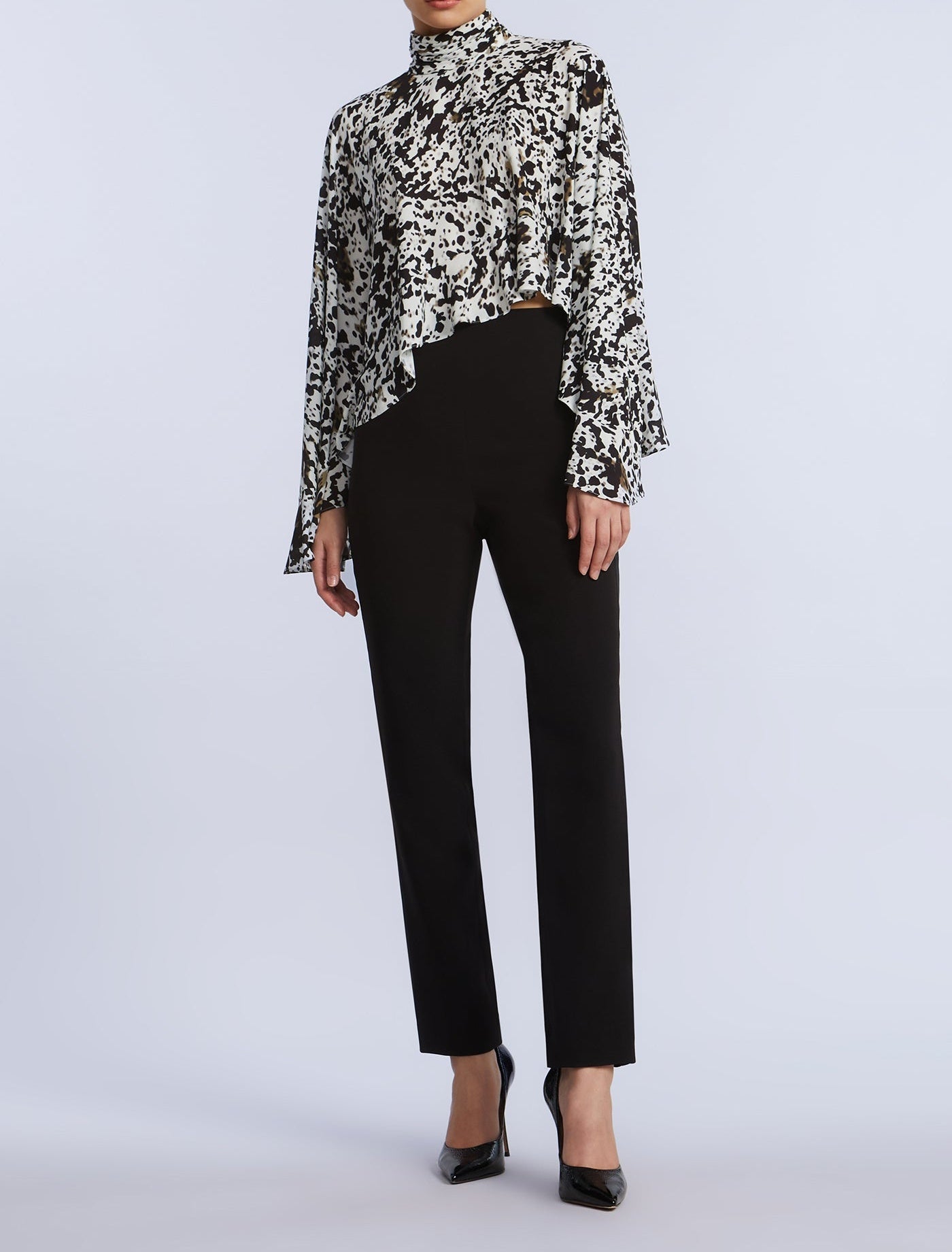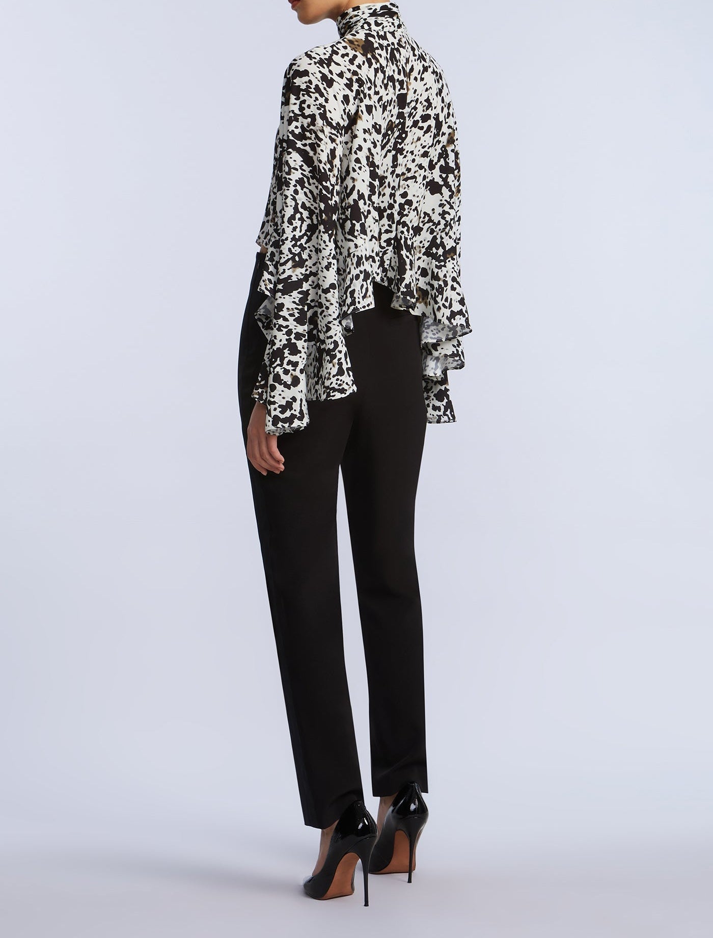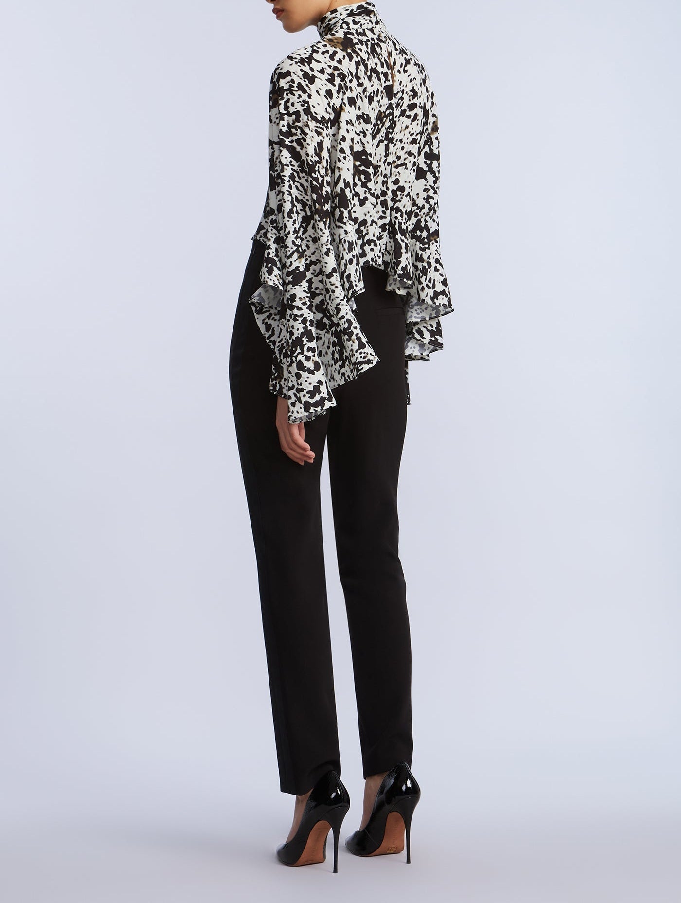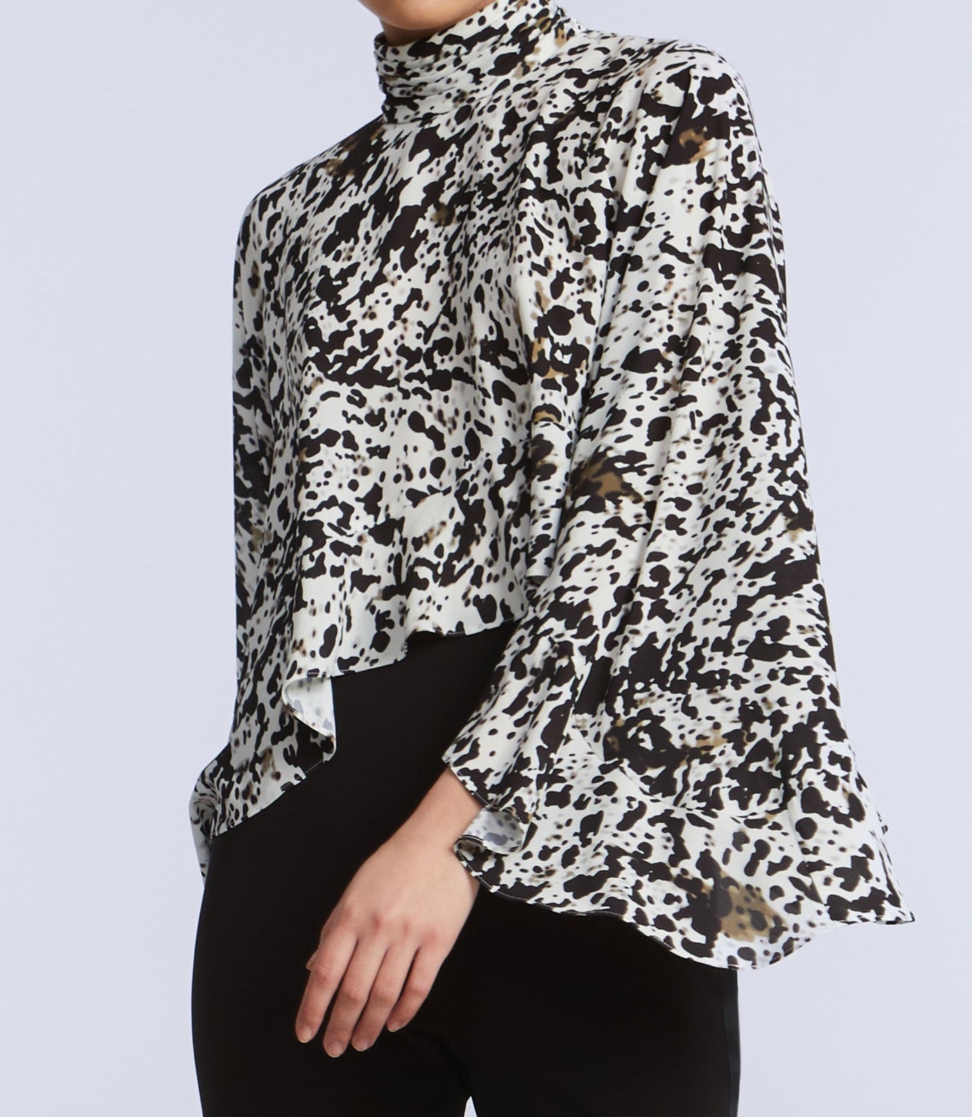 Mock neck blouse in a black-and-white abstract floral print chiffon. Designed with tiered bell sleeves and an asymmetric high-low hem for dramatic movement. A sheer statement layer for nights out, gallery strolls, or anywhere that needs a little flair.