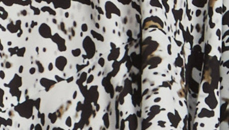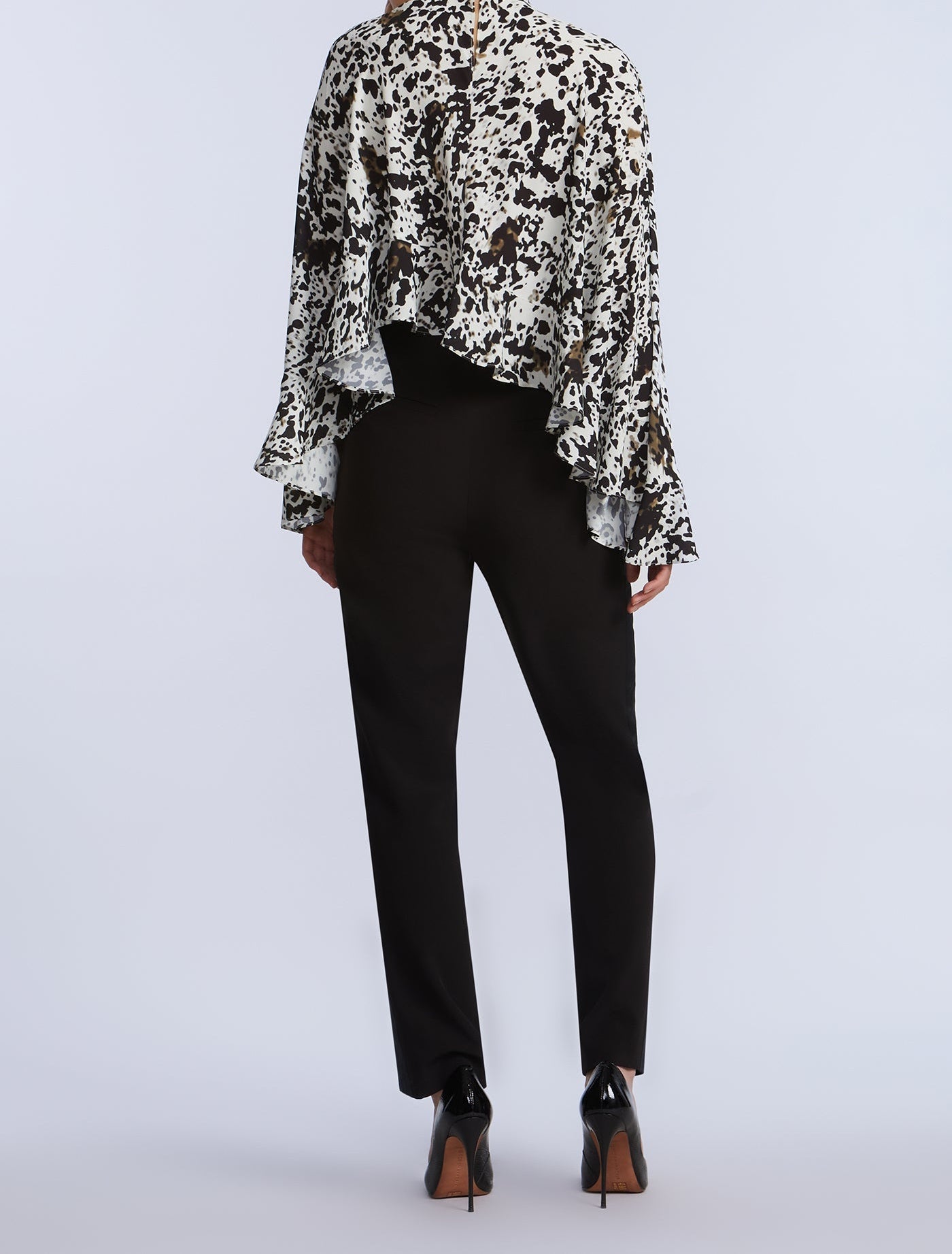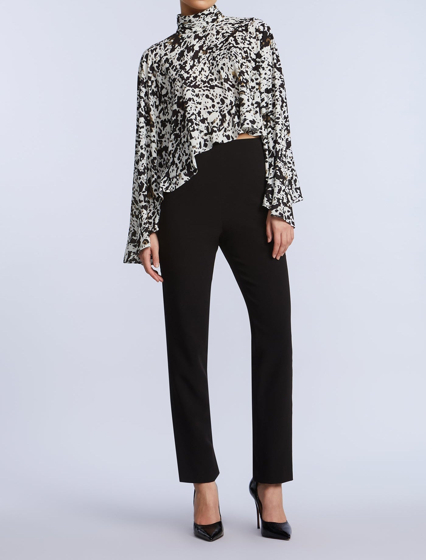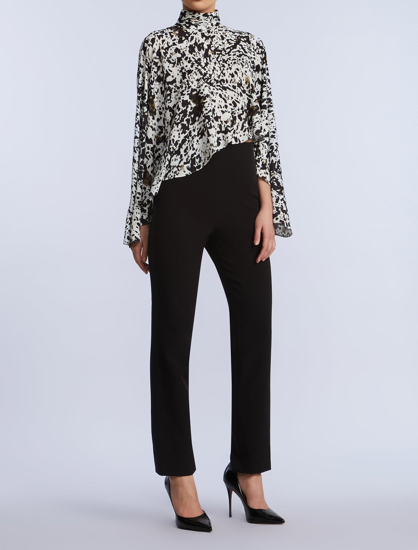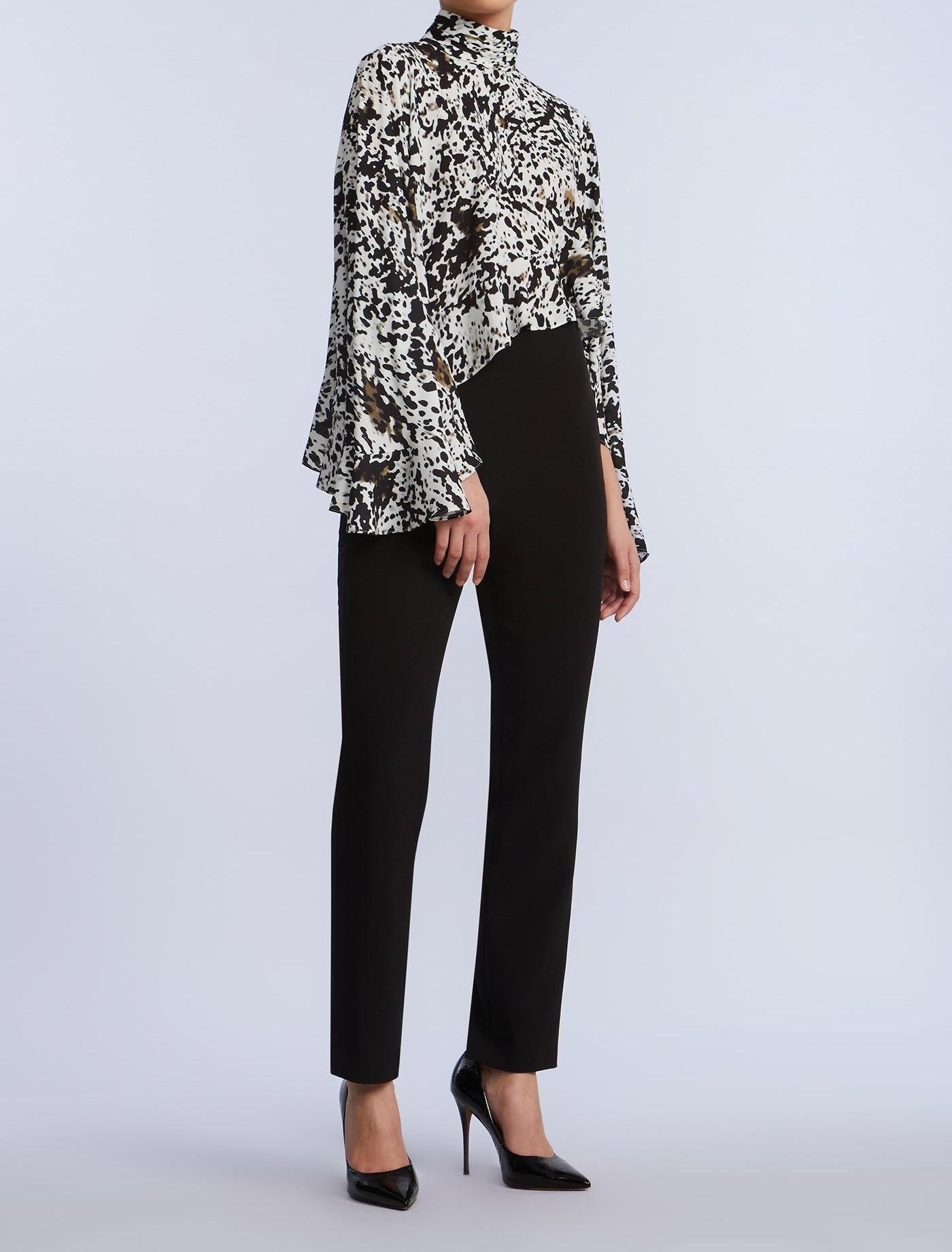 Mock neck blouse in a black-and-white abstract floral print chiffon. Designed with tiered bell sleeves and an asymmetric high-low hem for dramatic movement. A sheer statement layer for nights out, gallery strolls, or anywhere that needs a little flair.