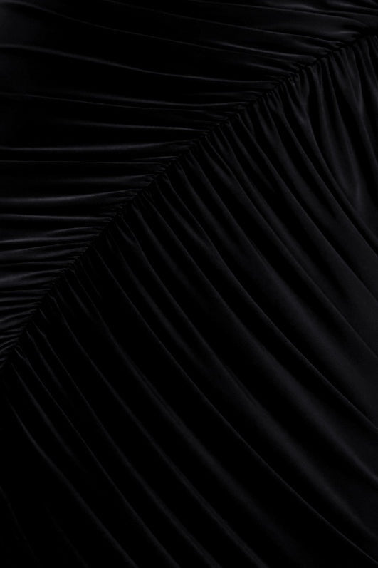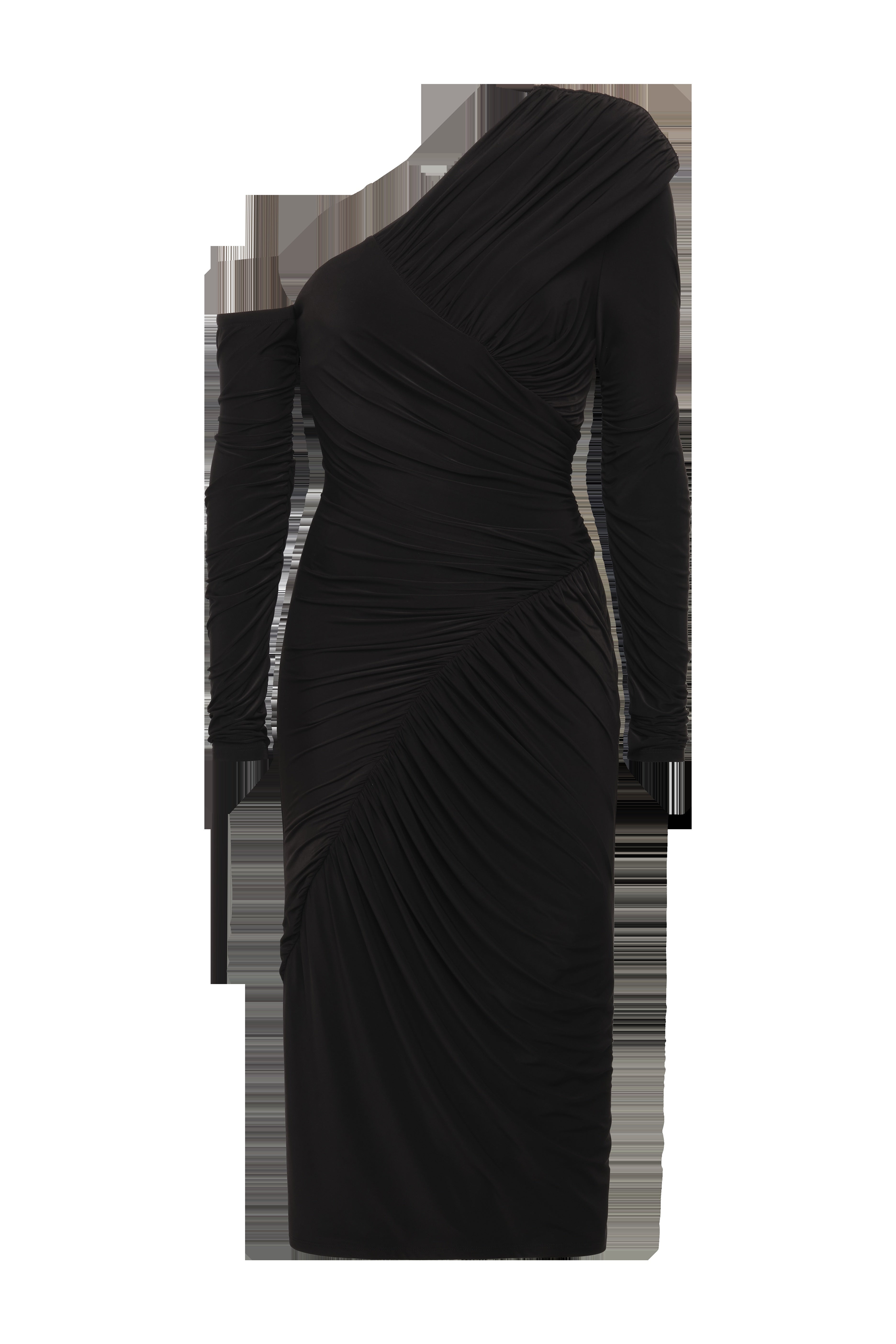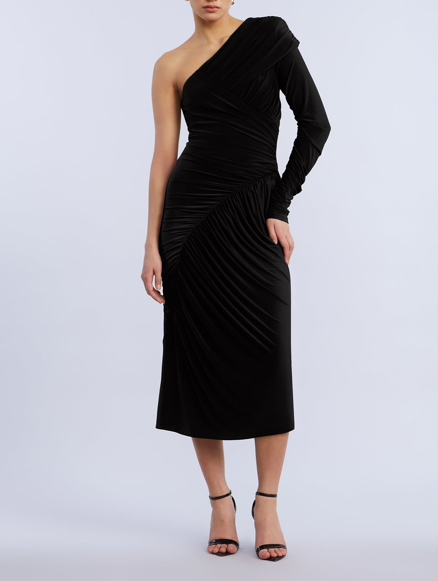 Draped matte jersey midi in classic black. Designed with a one-shoulder neckline and full-length sleeve, it sculpts the body with directional ruching that wraps from bodice to hem. A curve-hugging silhouette made for cocktail hours and after-dark moments.