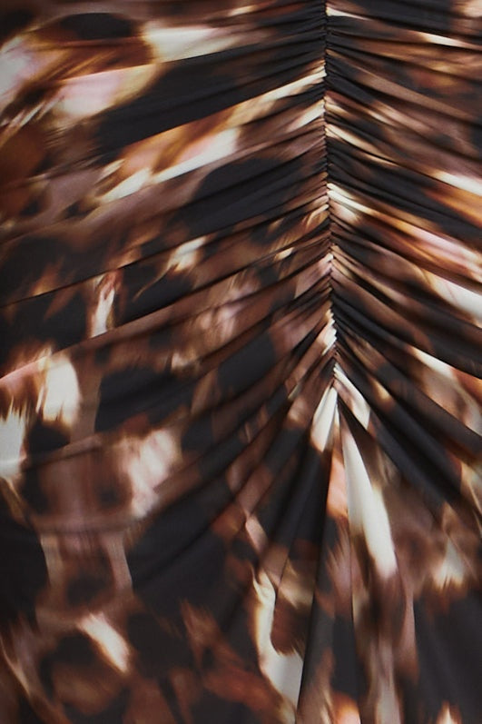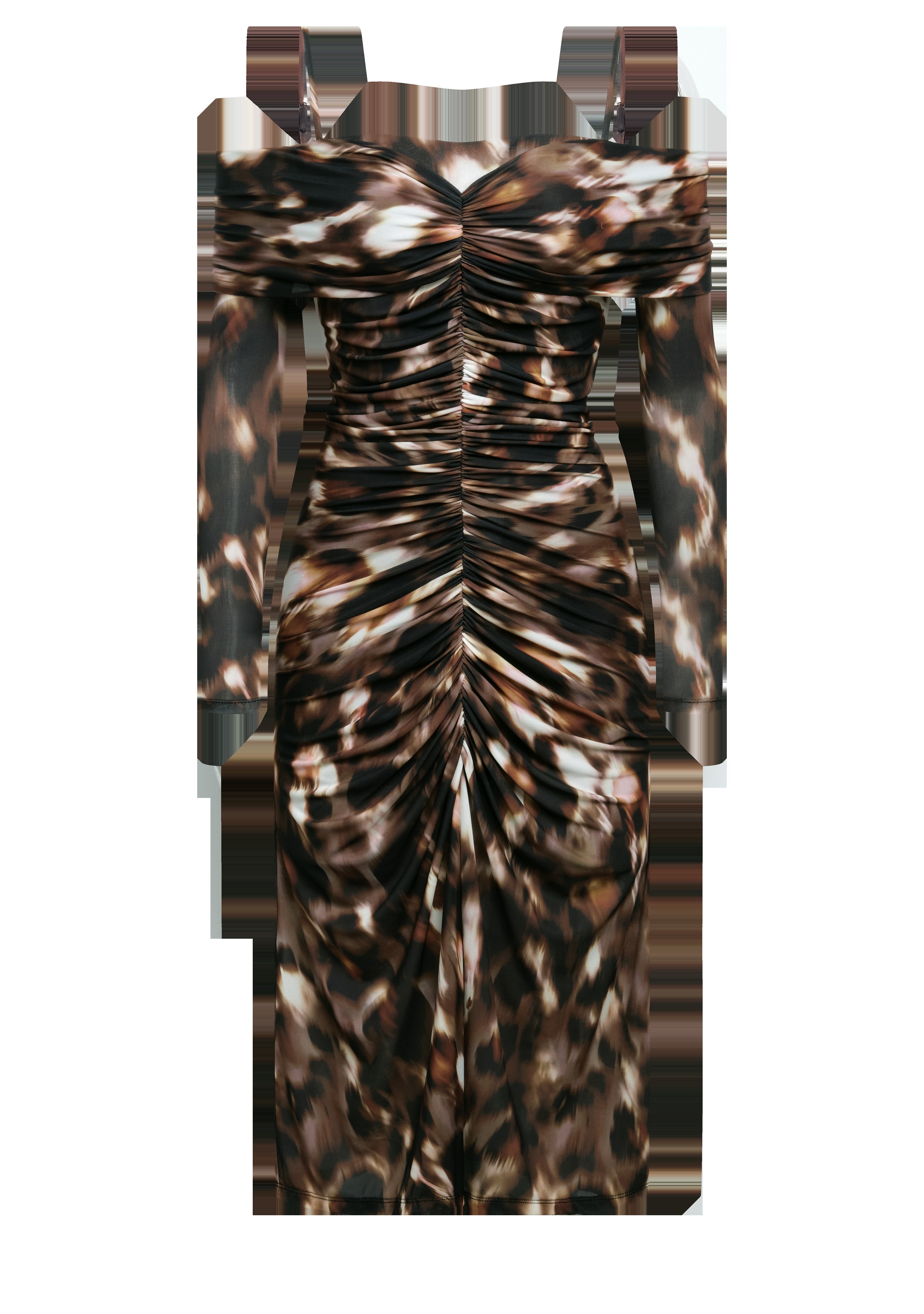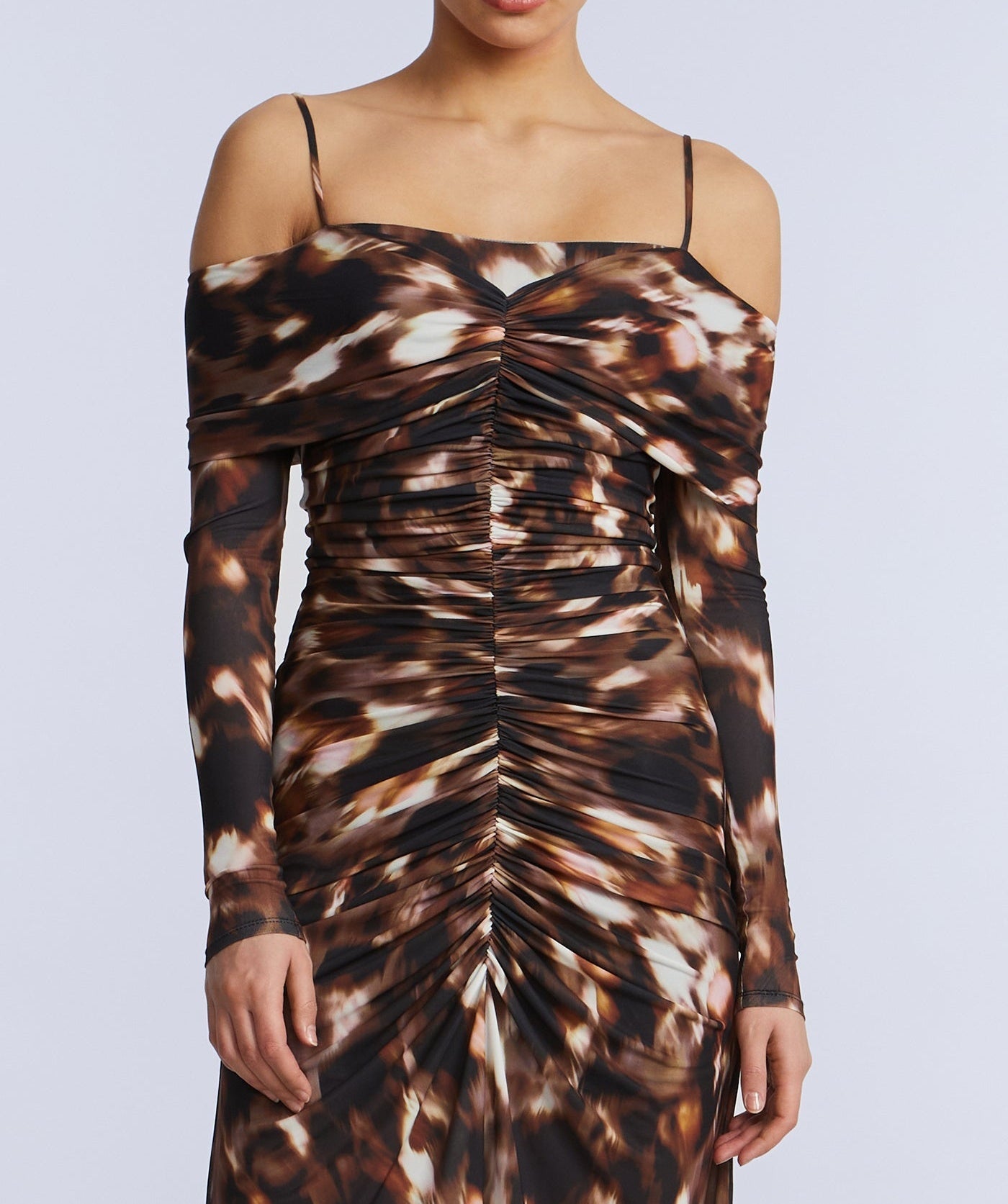 Printed stretch mesh midi dress with allover ruching and a bold leopard-inspired motif. Features a cold-shoulder draped neckline and slim long sleeves for added edge. Designed with a pull-on construction—ready for after-dark plans.