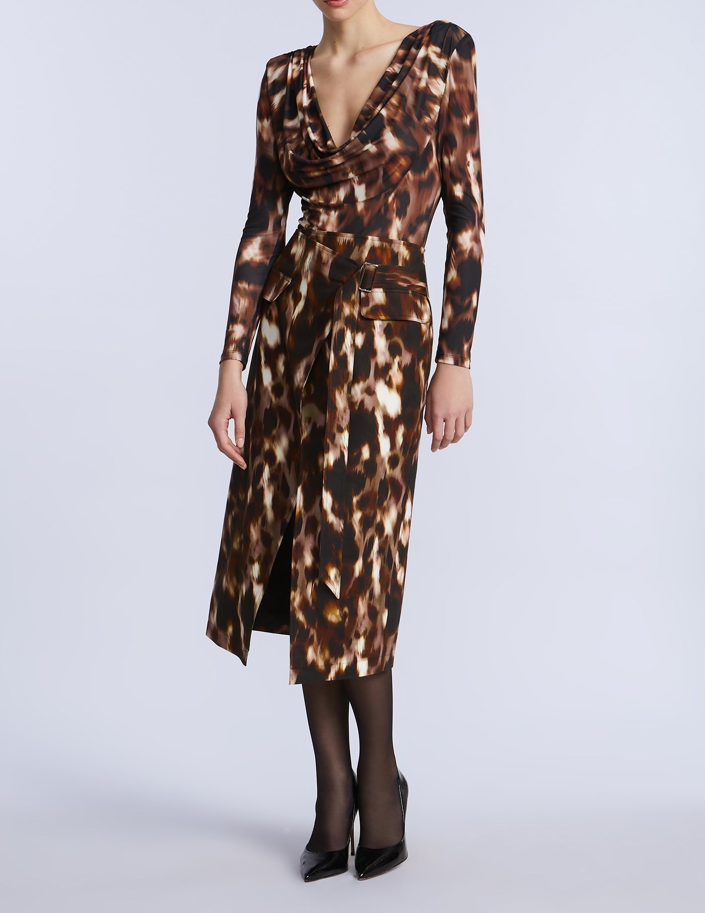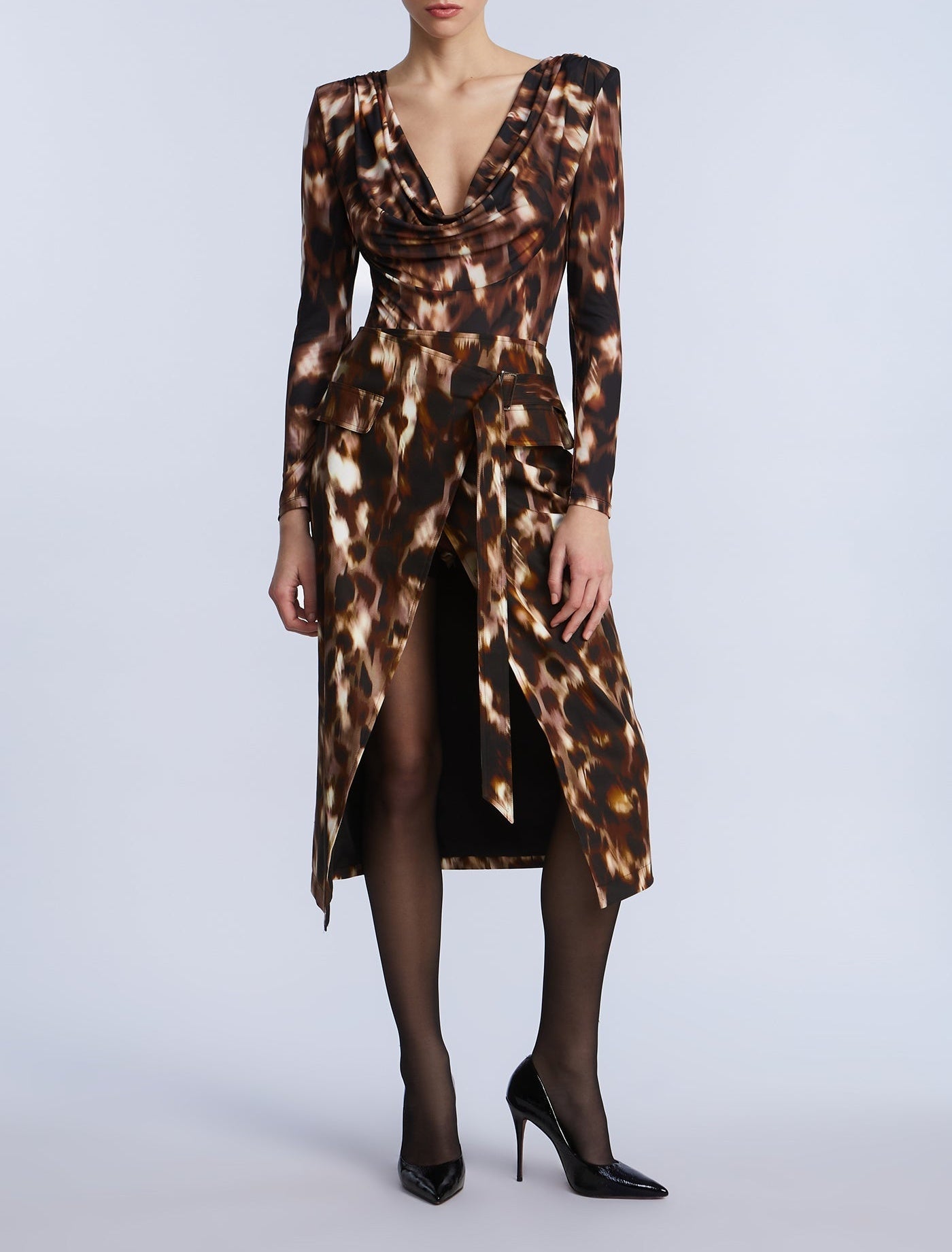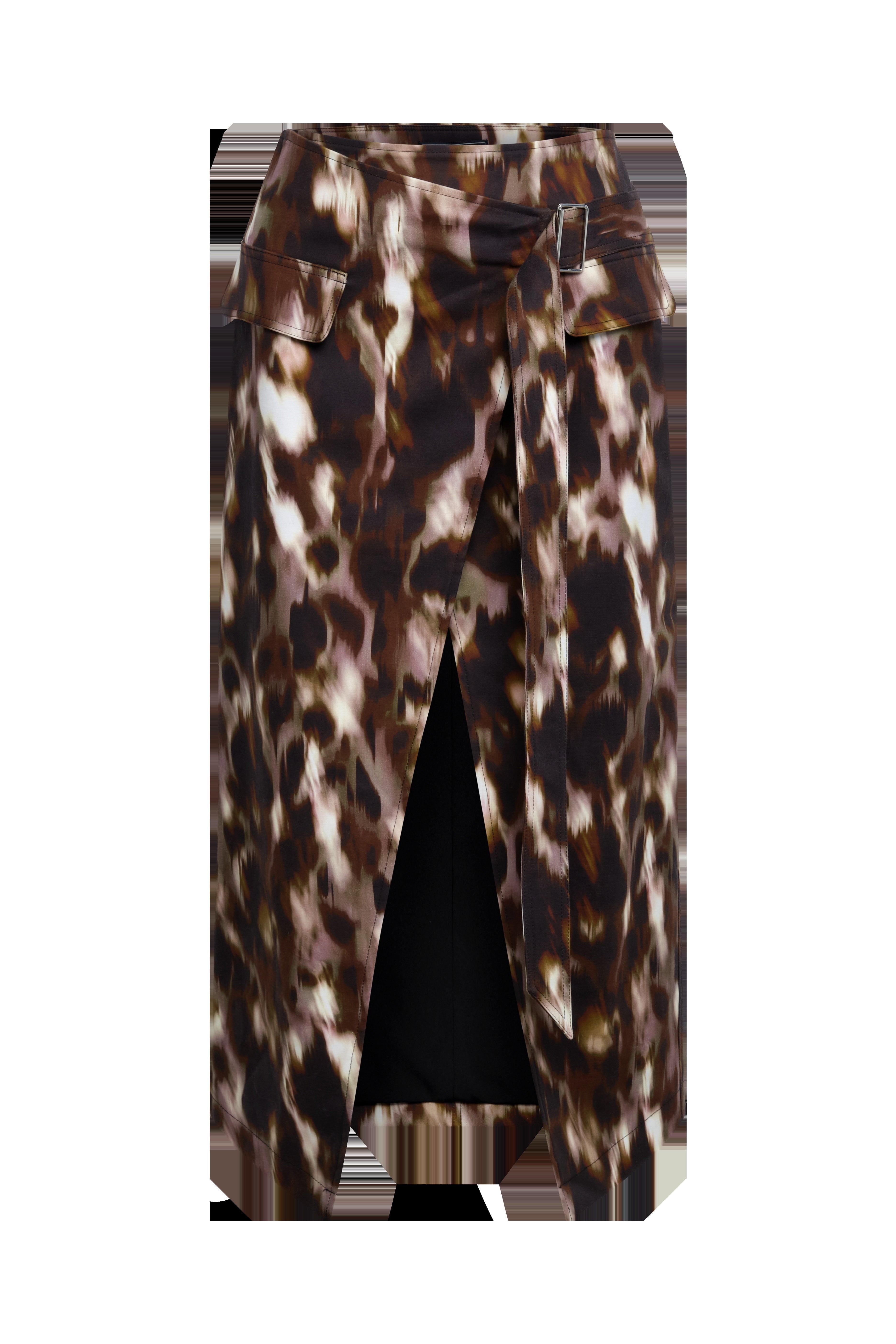 Printed satin skirt with a wrap-style front and adjustable tie belt. Finished with oversized cargo pockets and a sharp slit for a dose of drama. Pair it with the matching bodysuit or keep it simple—your call.