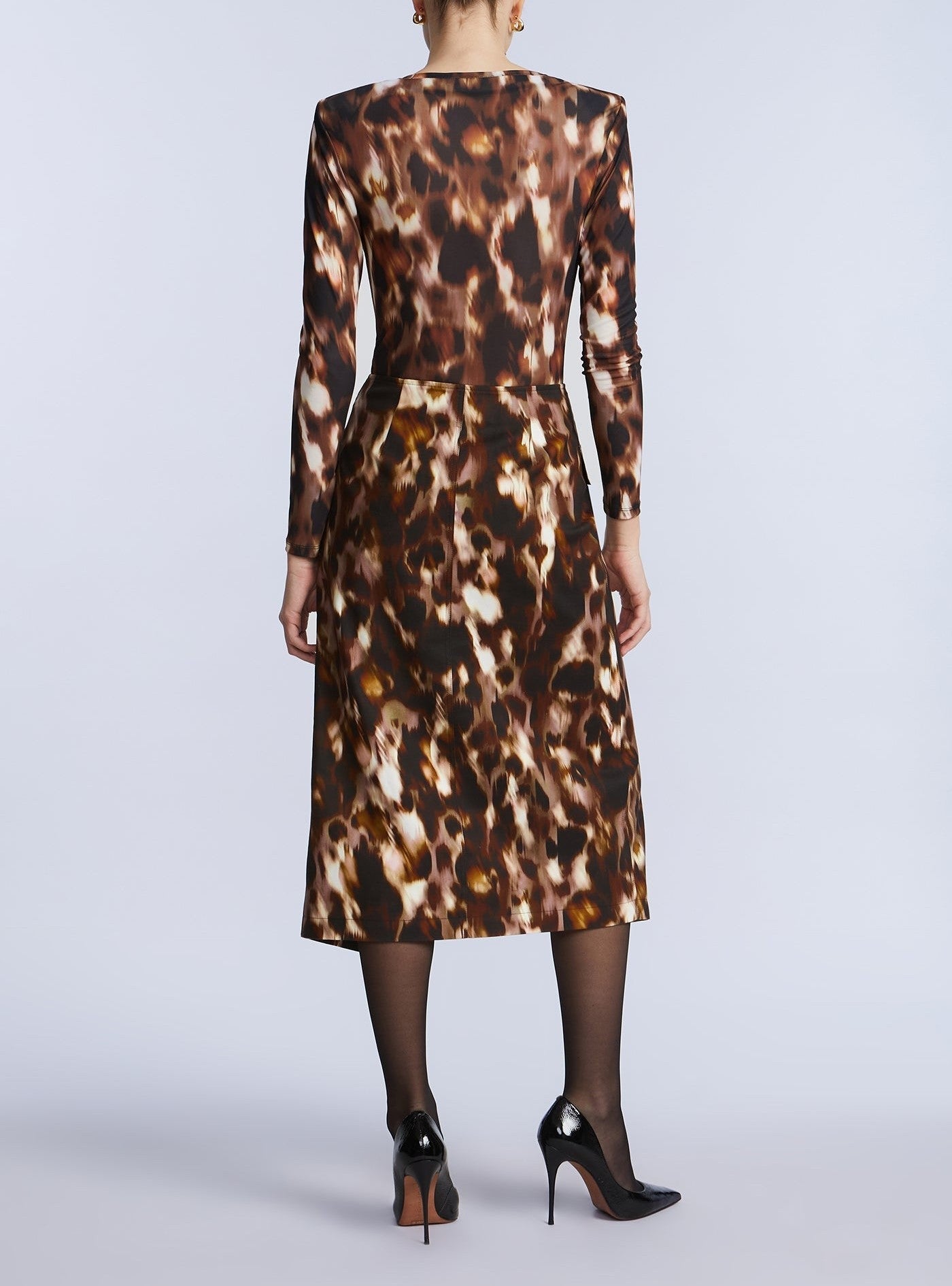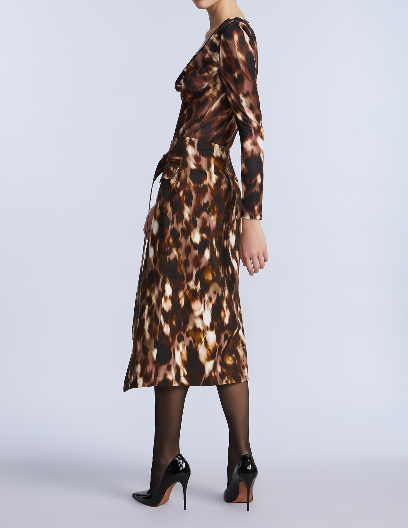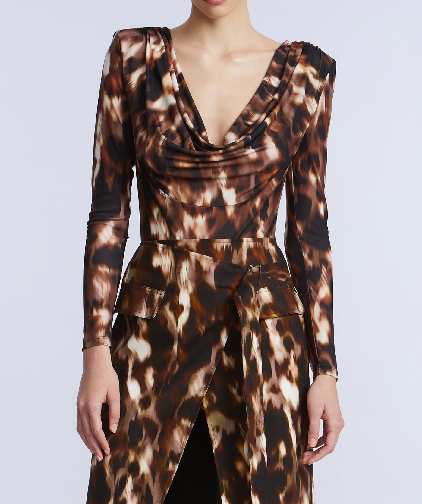 Printed satin skirt with a wrap-style front and adjustable tie belt. Finished with oversized cargo pockets and a sharp slit for a dose of drama. Pair it with the matching bodysuit or keep it simple—your call.