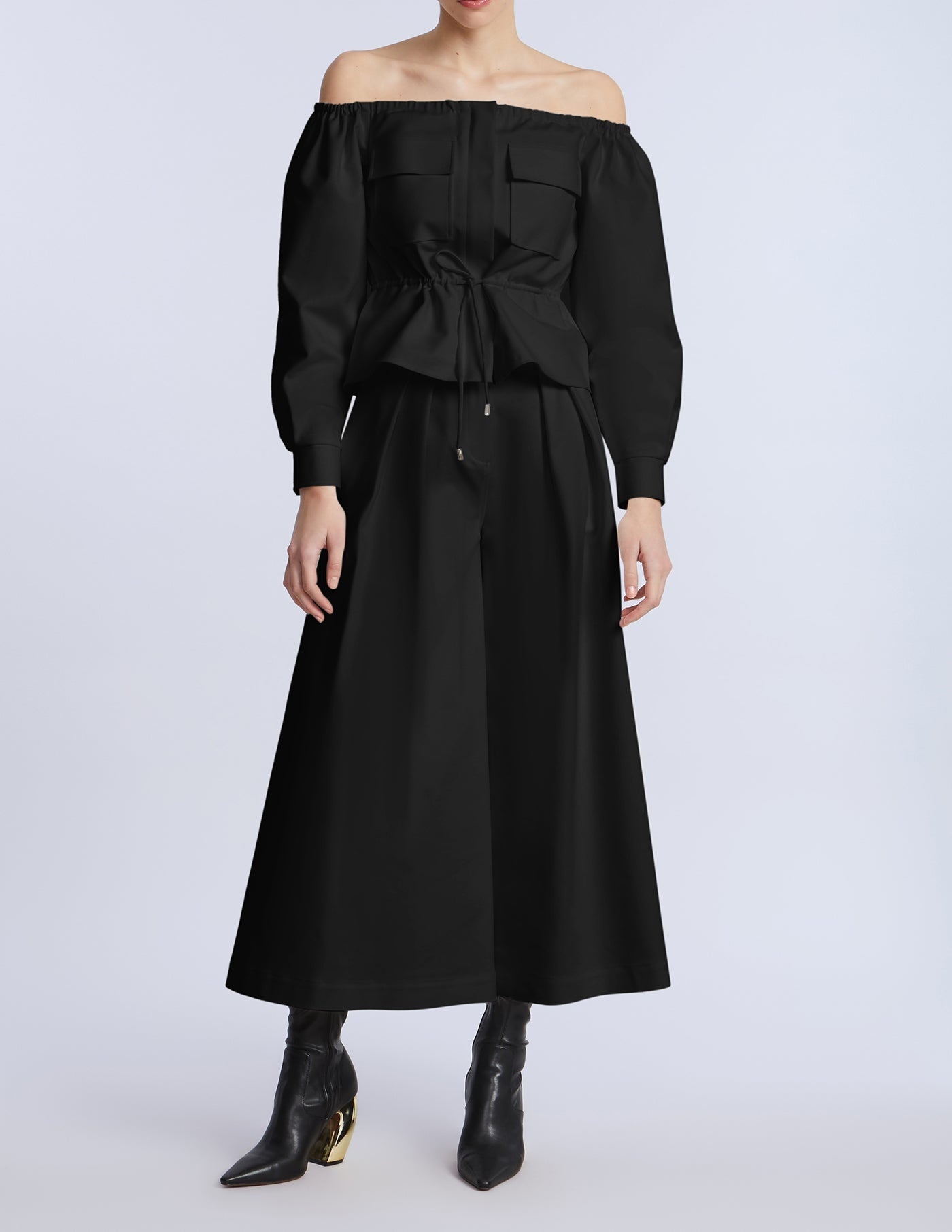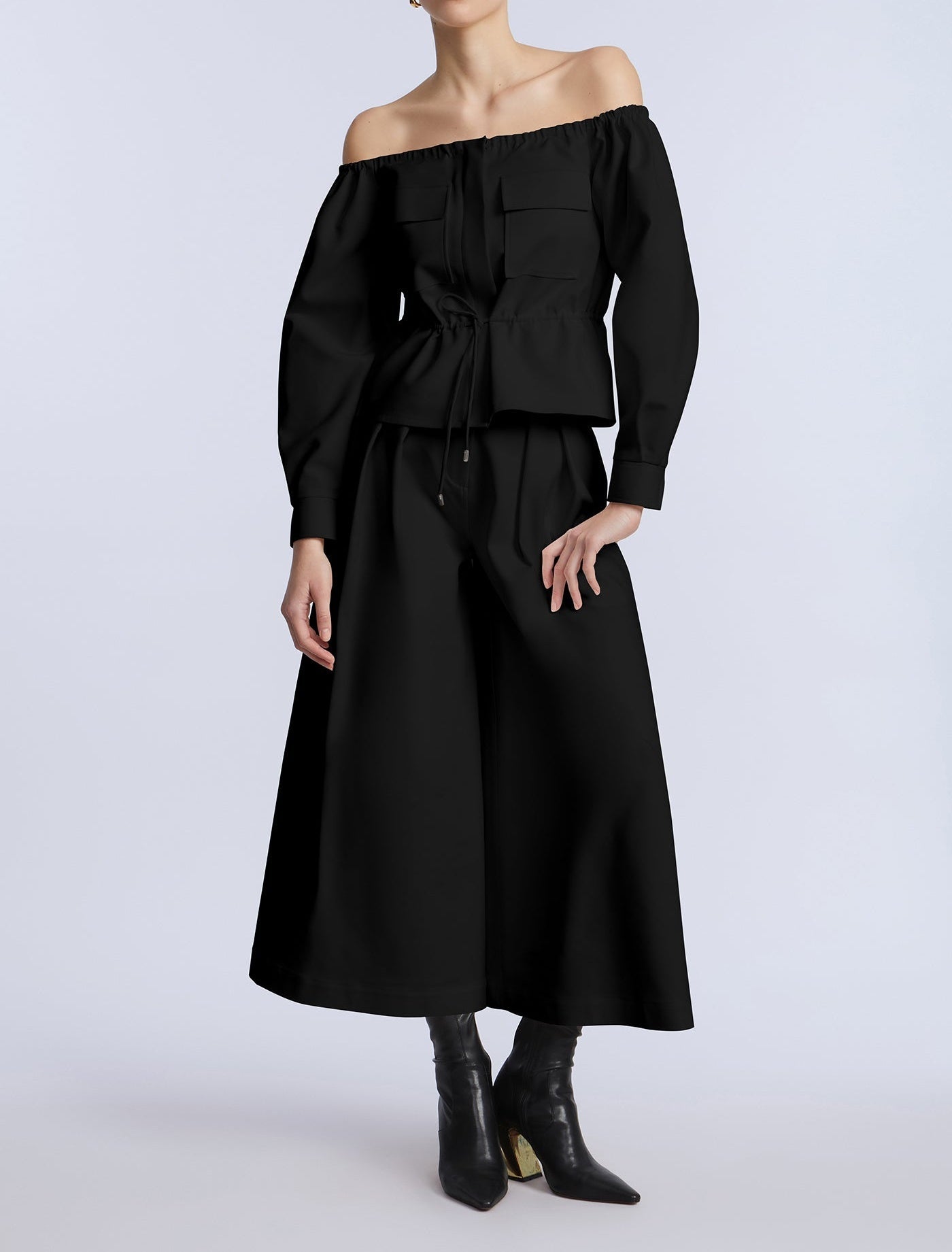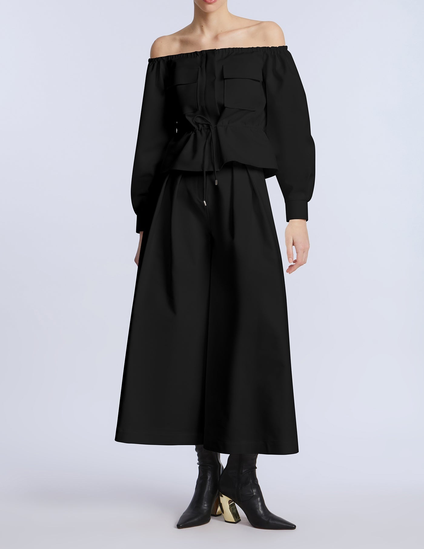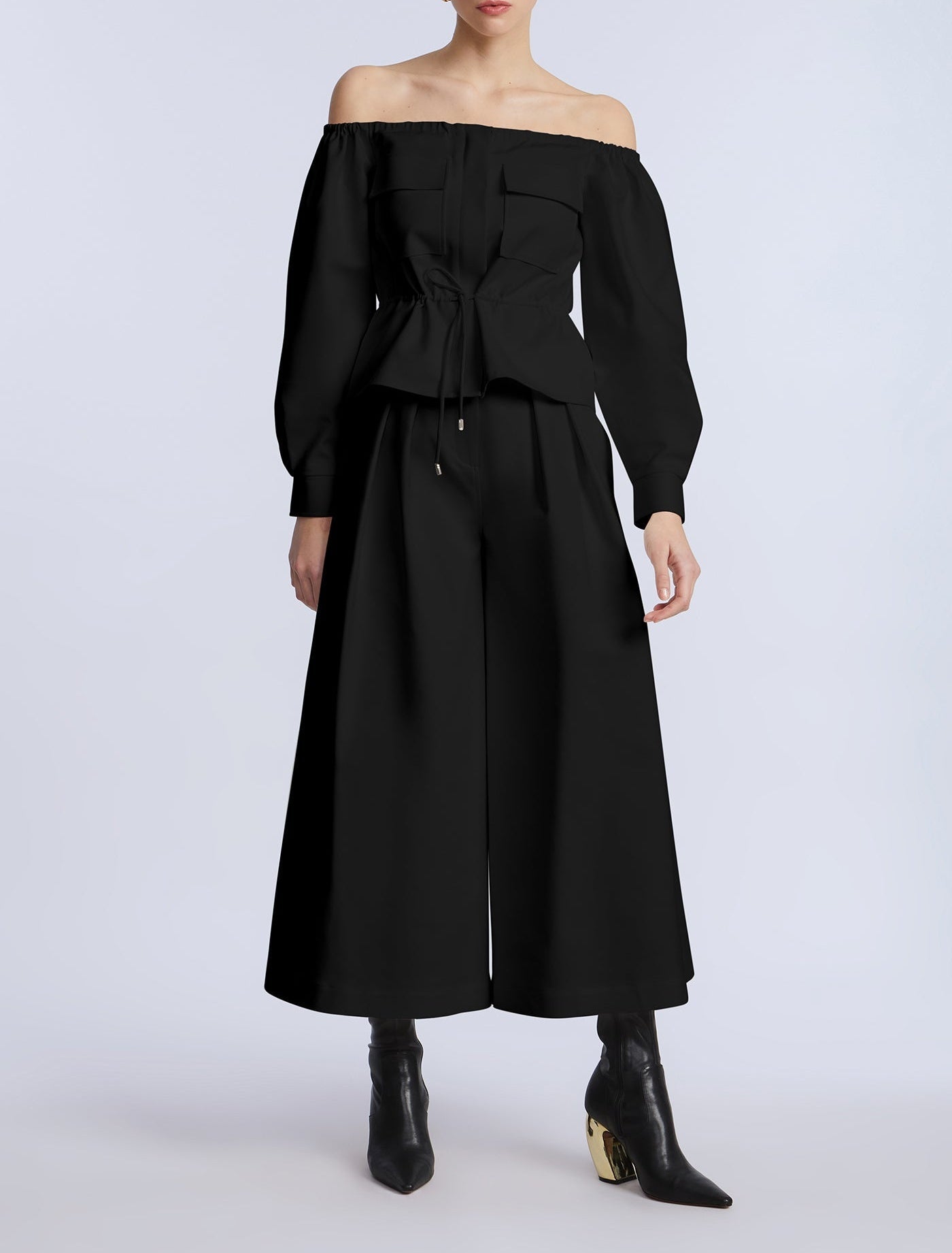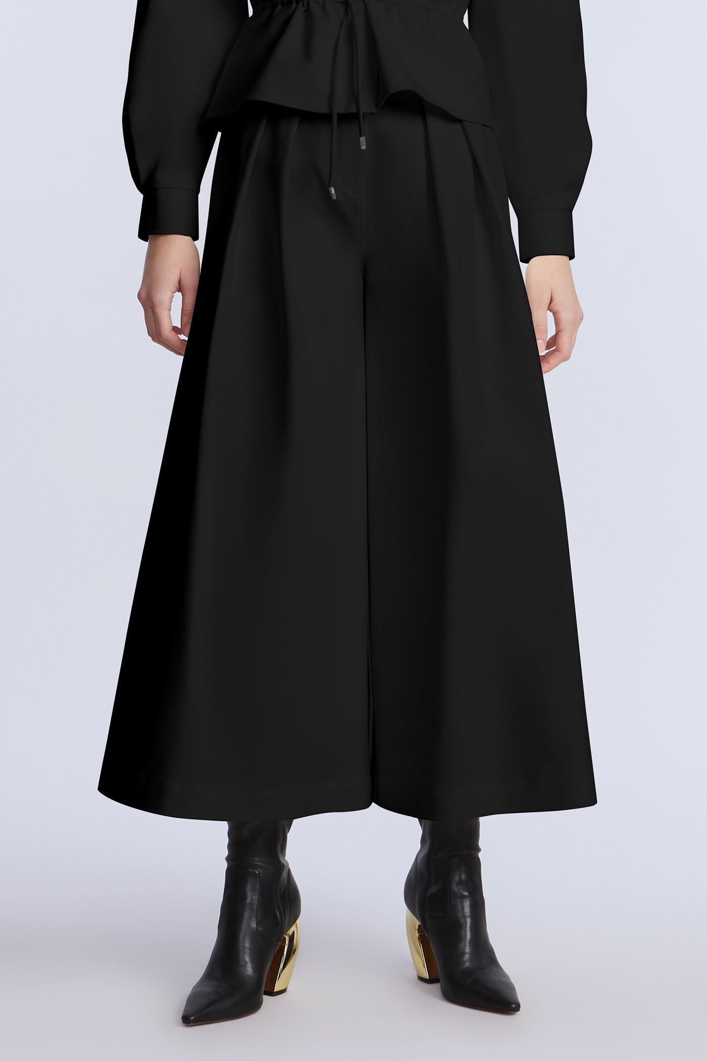 Wide-leg cropped pants in classic black cotton sateen. Designed with pleated front detailing and a clean waistband for a sculpted finish. Add the matching top for a sleek monochrome moment.