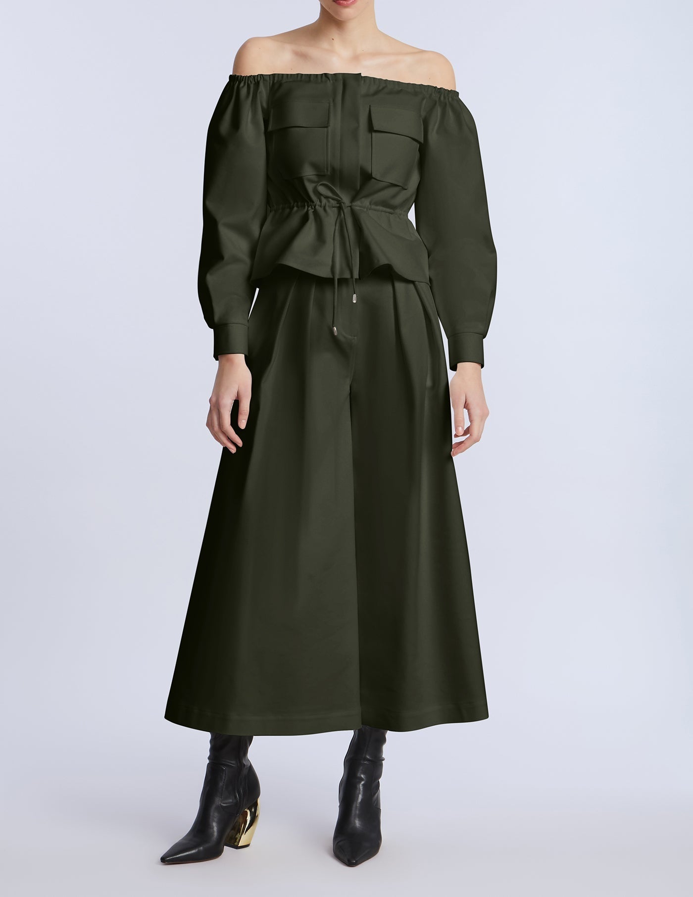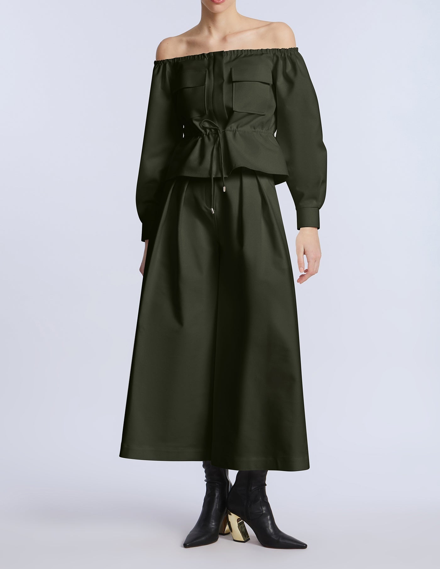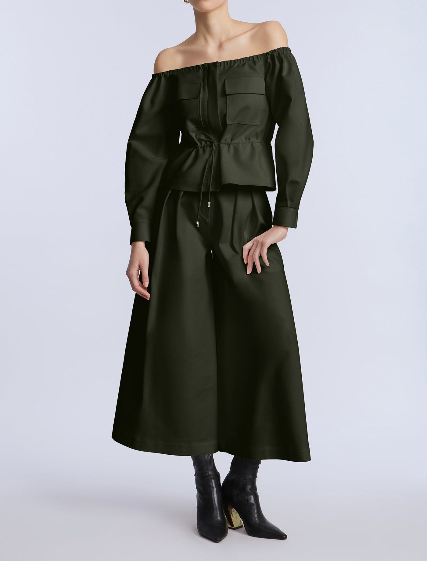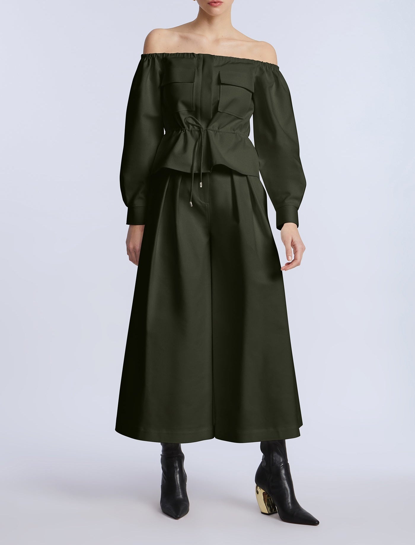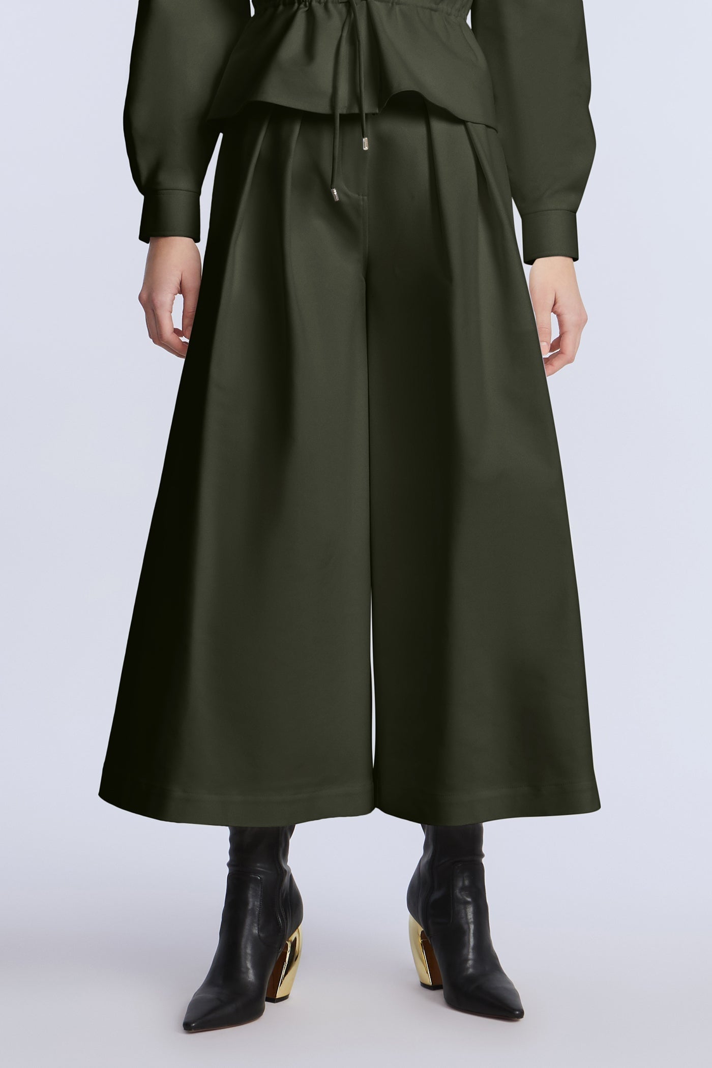 Wide-leg cropped pants in a rich olive green cotton sateen. Designed with pleated front detailing and a clean waistband for a sculpted finish. Add the matching top for a bold monochrome moment.