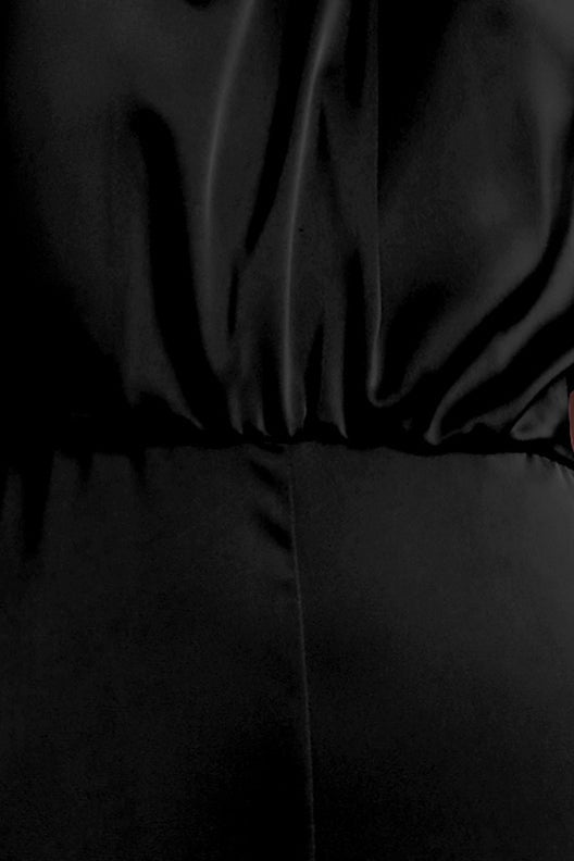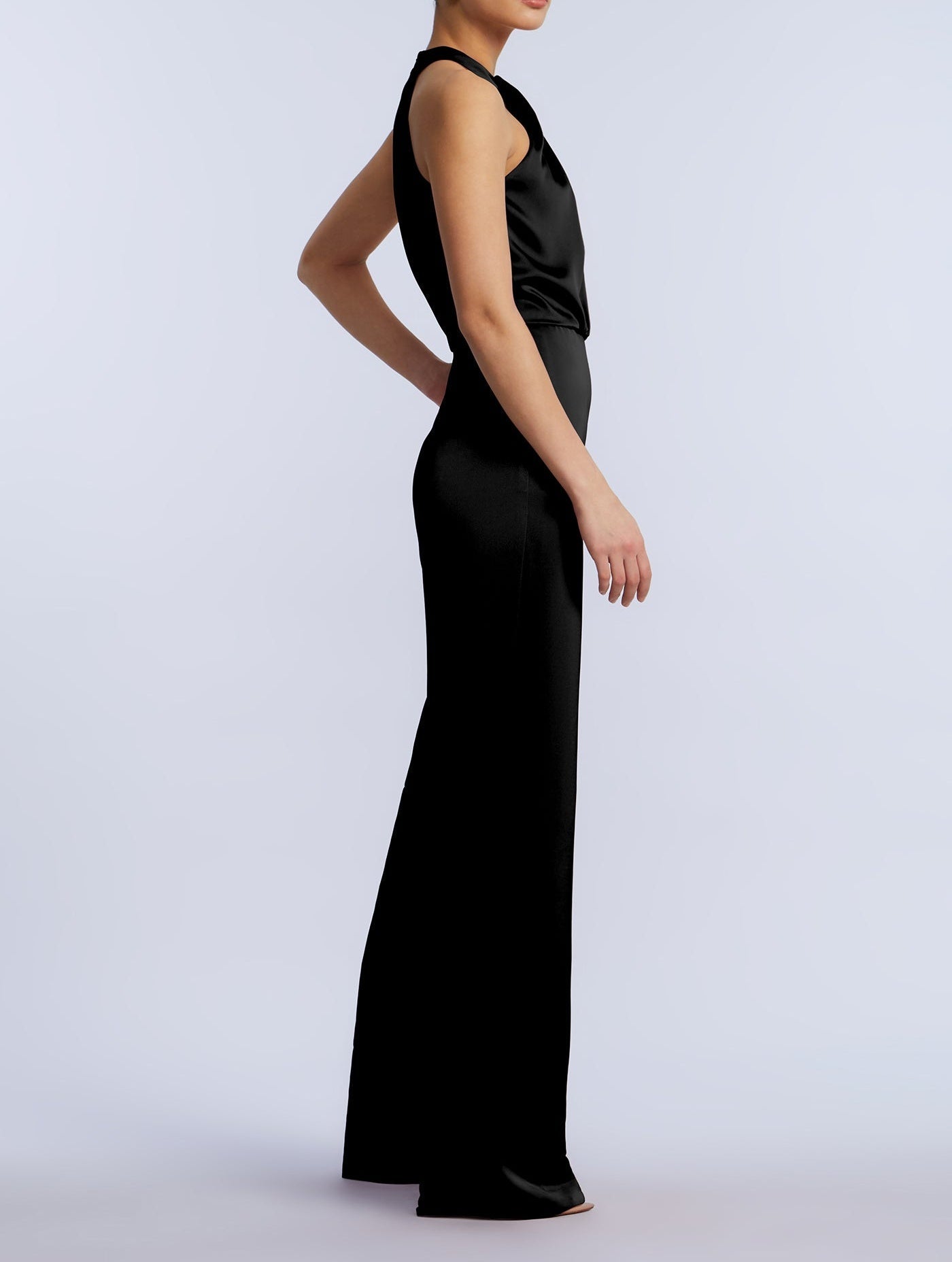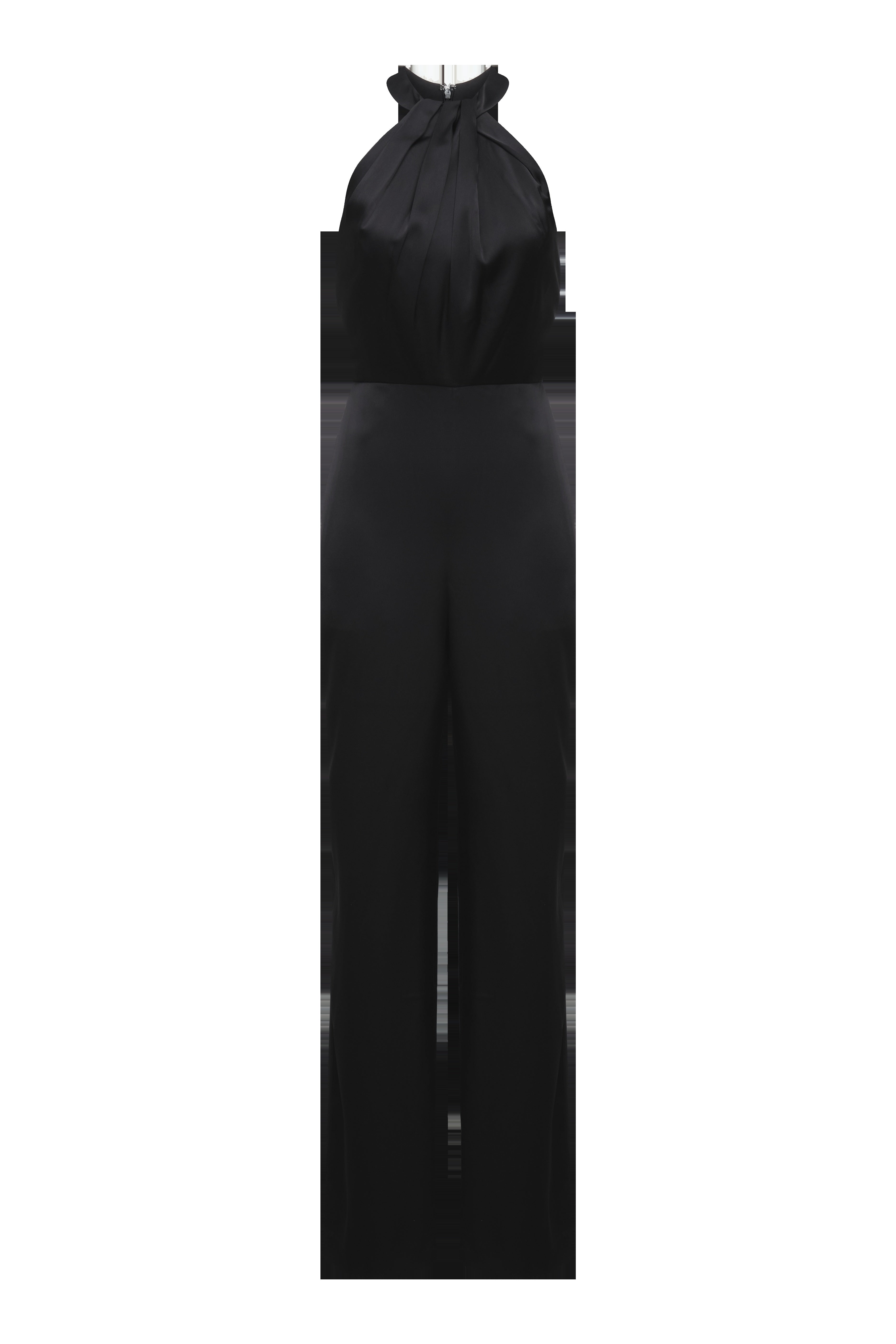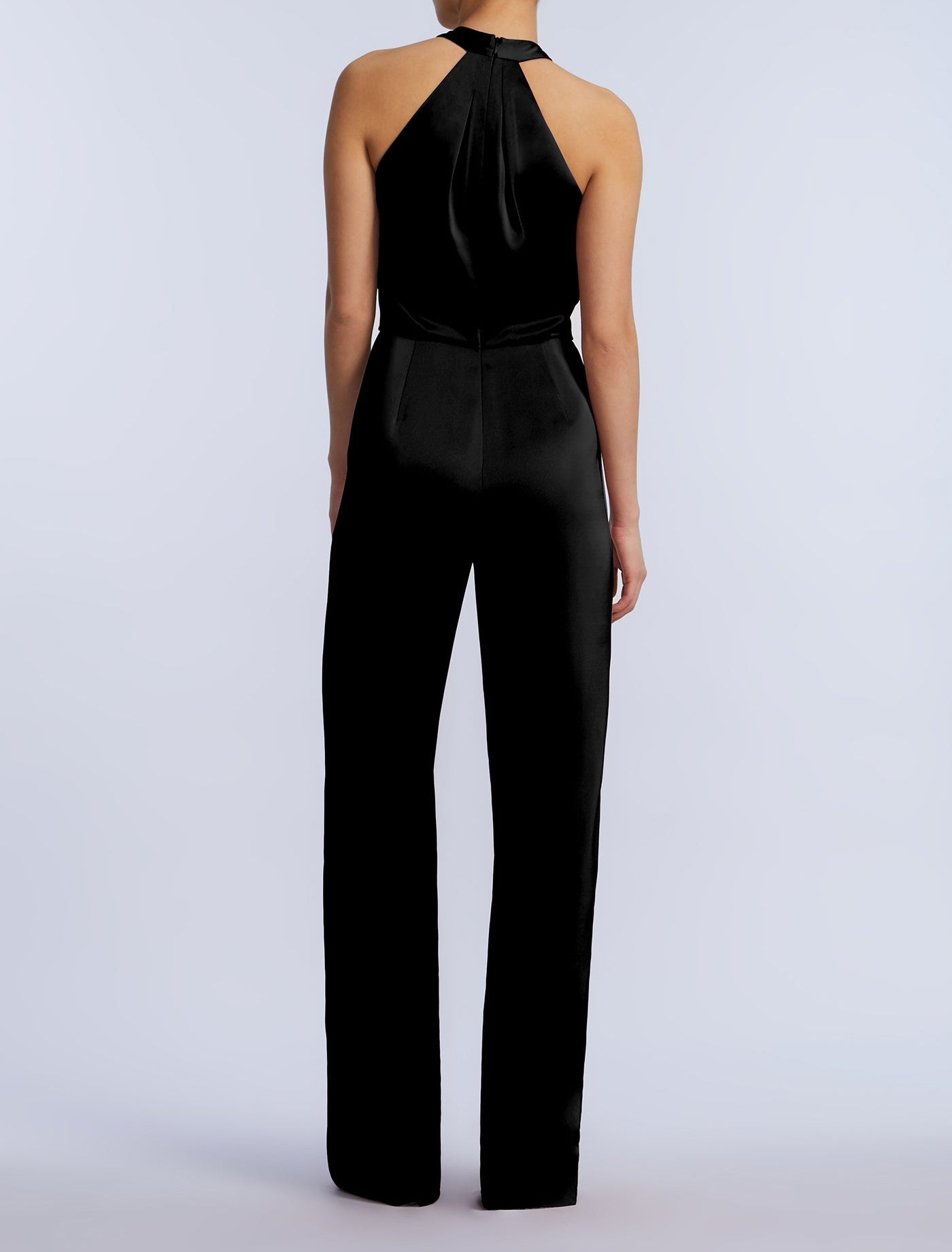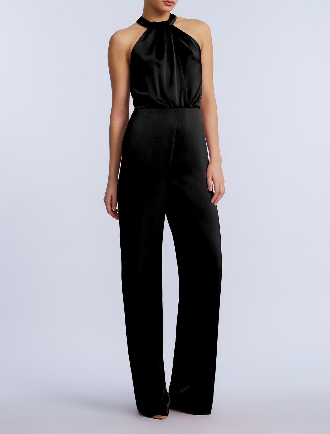 Satin halter jumpsuit with a gathered neckline and elongating wide-leg silhouette. Designed with a softly cinched waist and fluid drape that moves with you. Just right for any night that leans dressy-but-not-too.