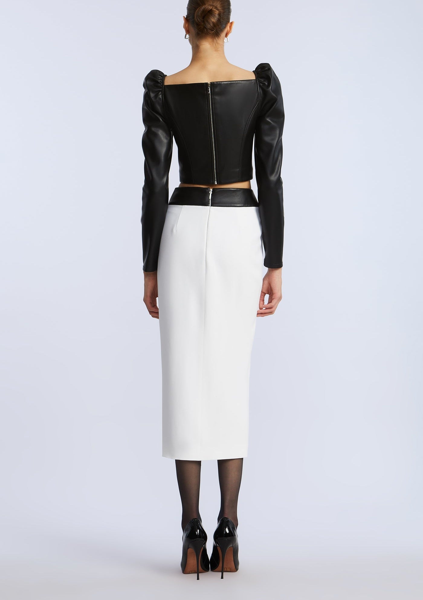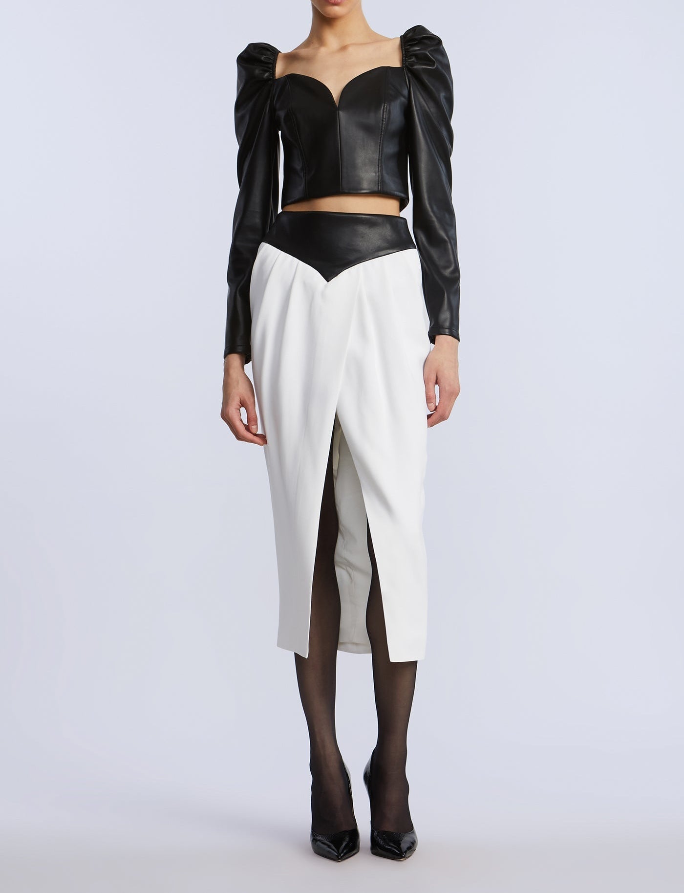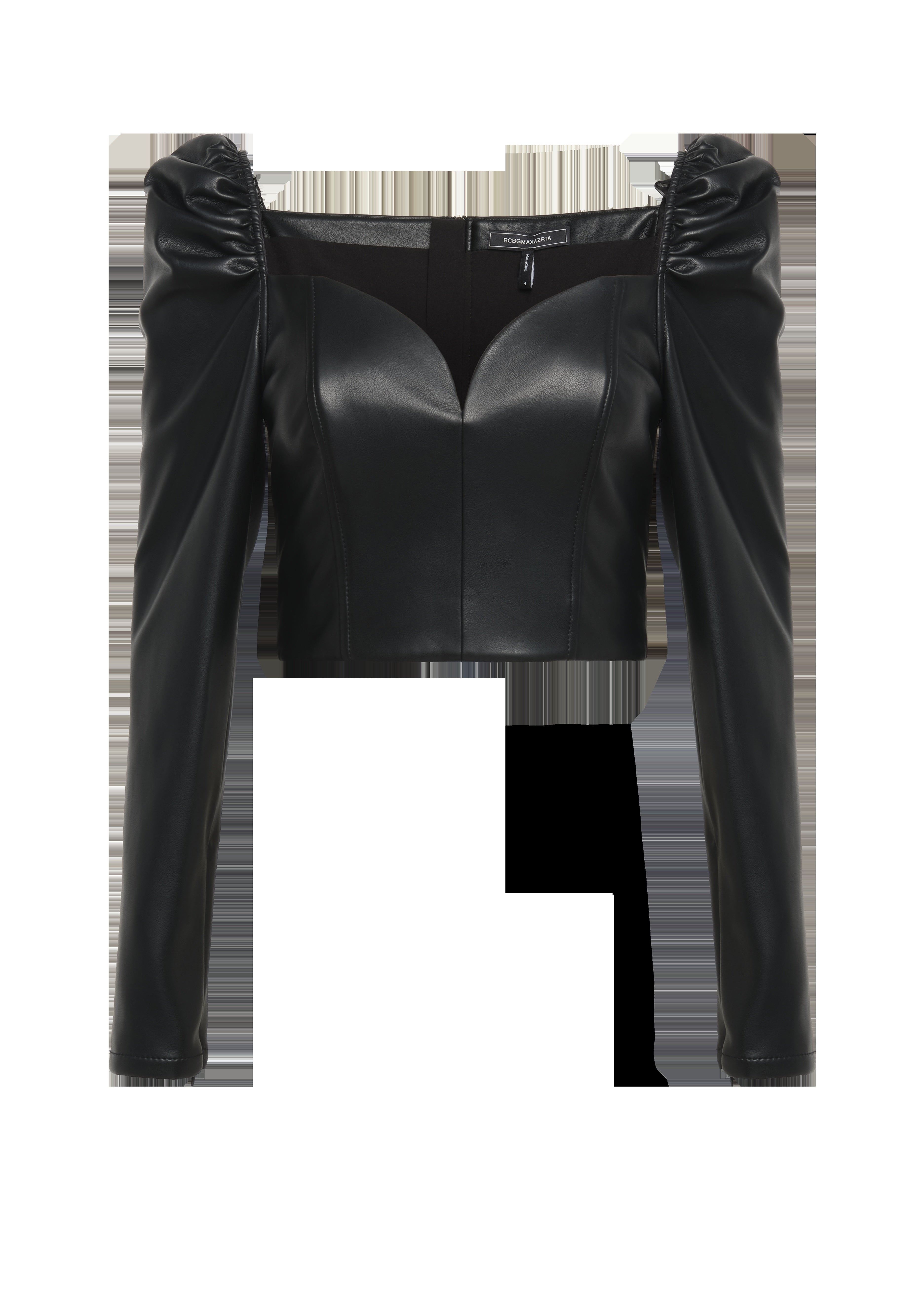 Structured faux leather crop top with sculpted cups and puffed shoulders. Fitted through the bodice with a subtle sweetheart shape and sharp sleeve seaming. Finished with a sleek back zipper—bold enough for night, tailored enough for day.