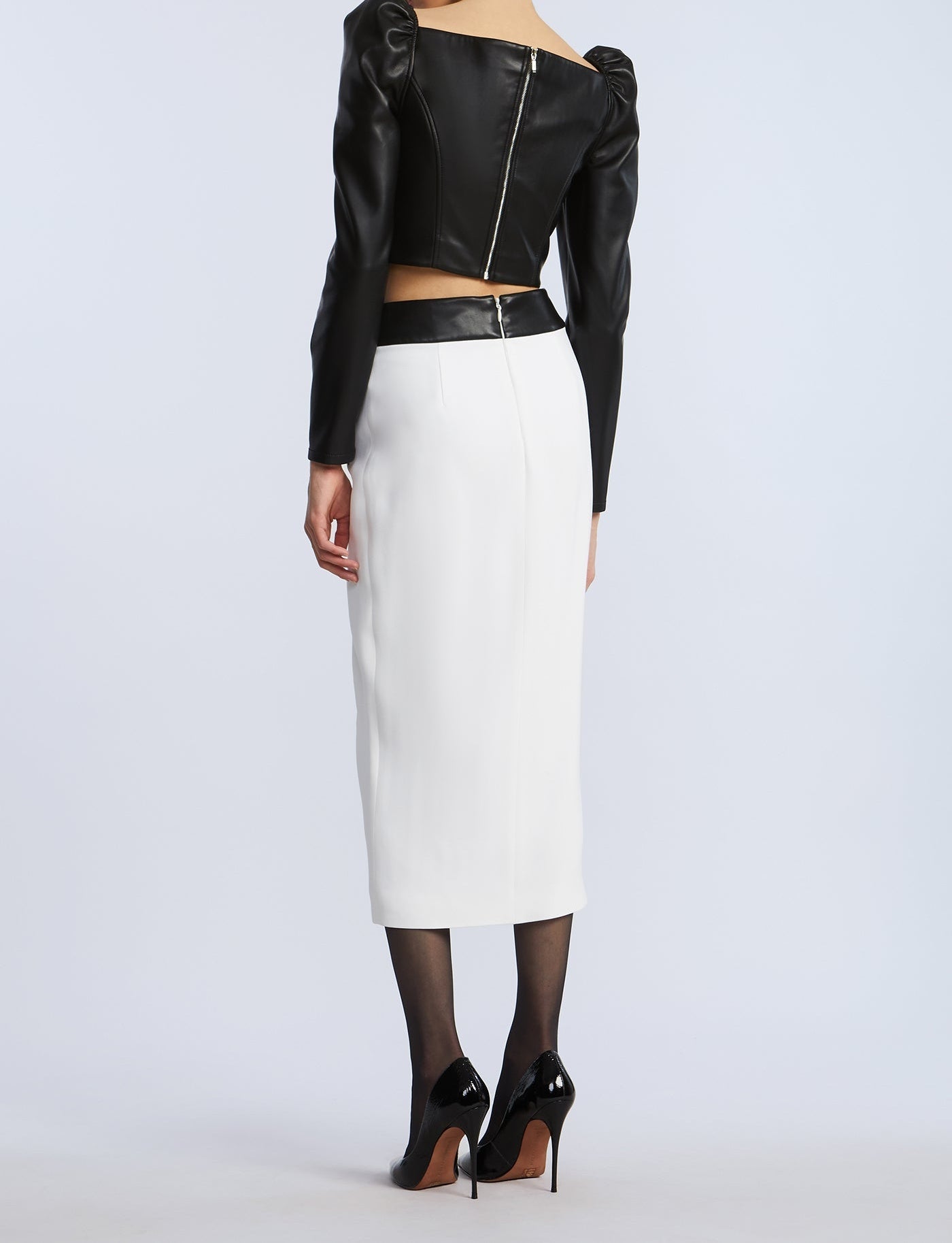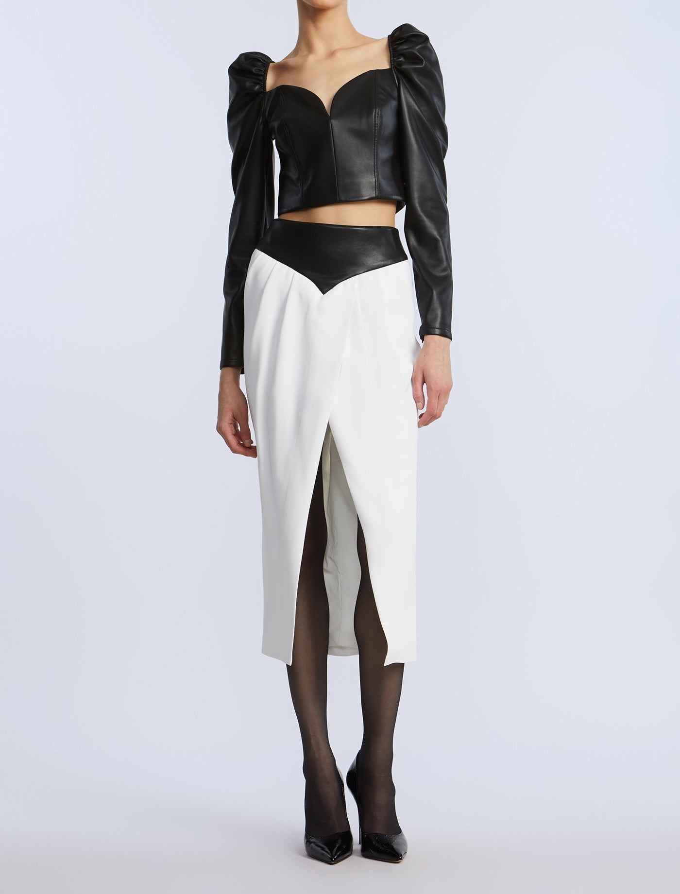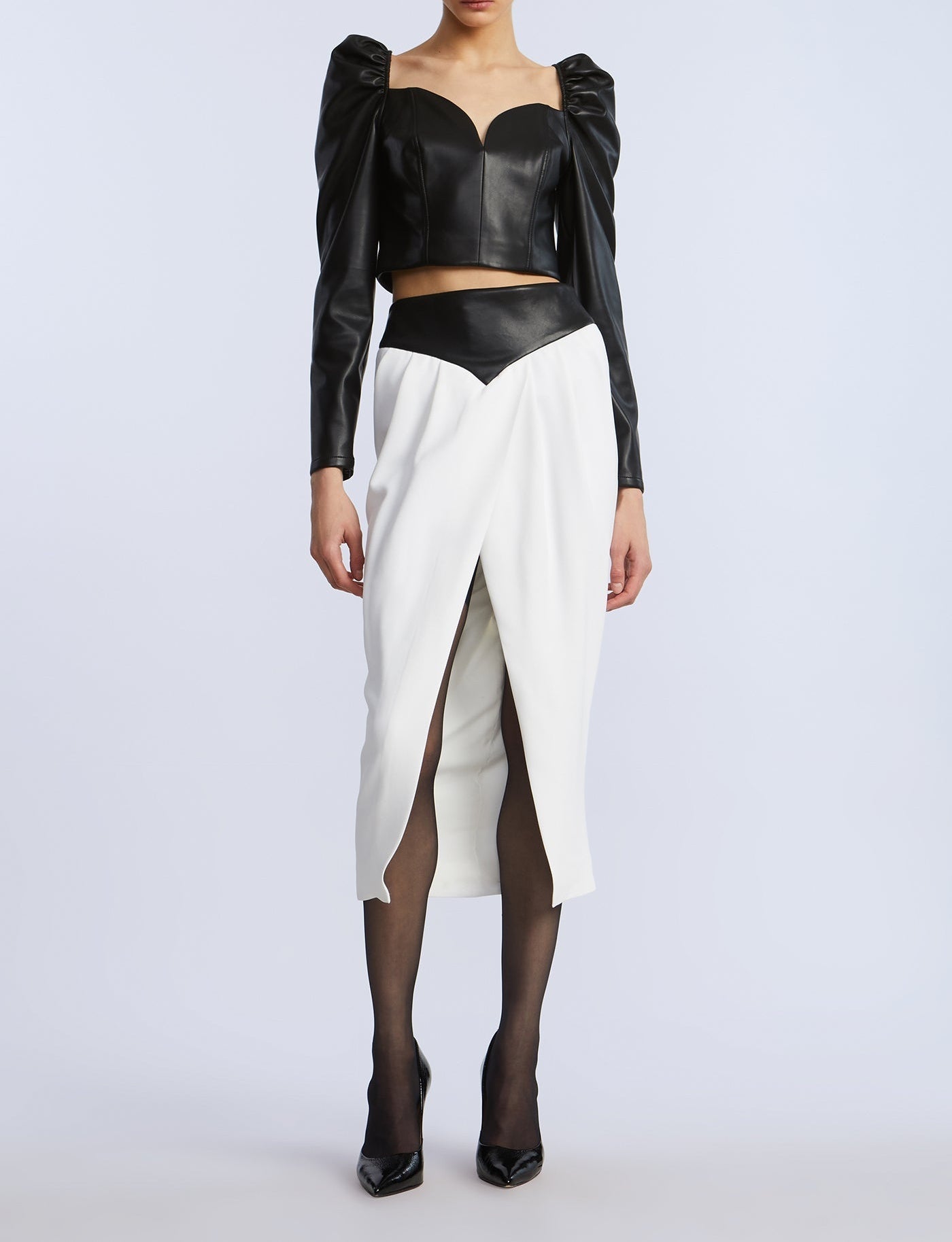 Structured faux leather crop top with sculpted cups and puffed shoulders. Fitted through the bodice with a subtle sweetheart shape and sharp sleeve seaming. Finished with a sleek back zipper—bold enough for night, tailored enough for day.