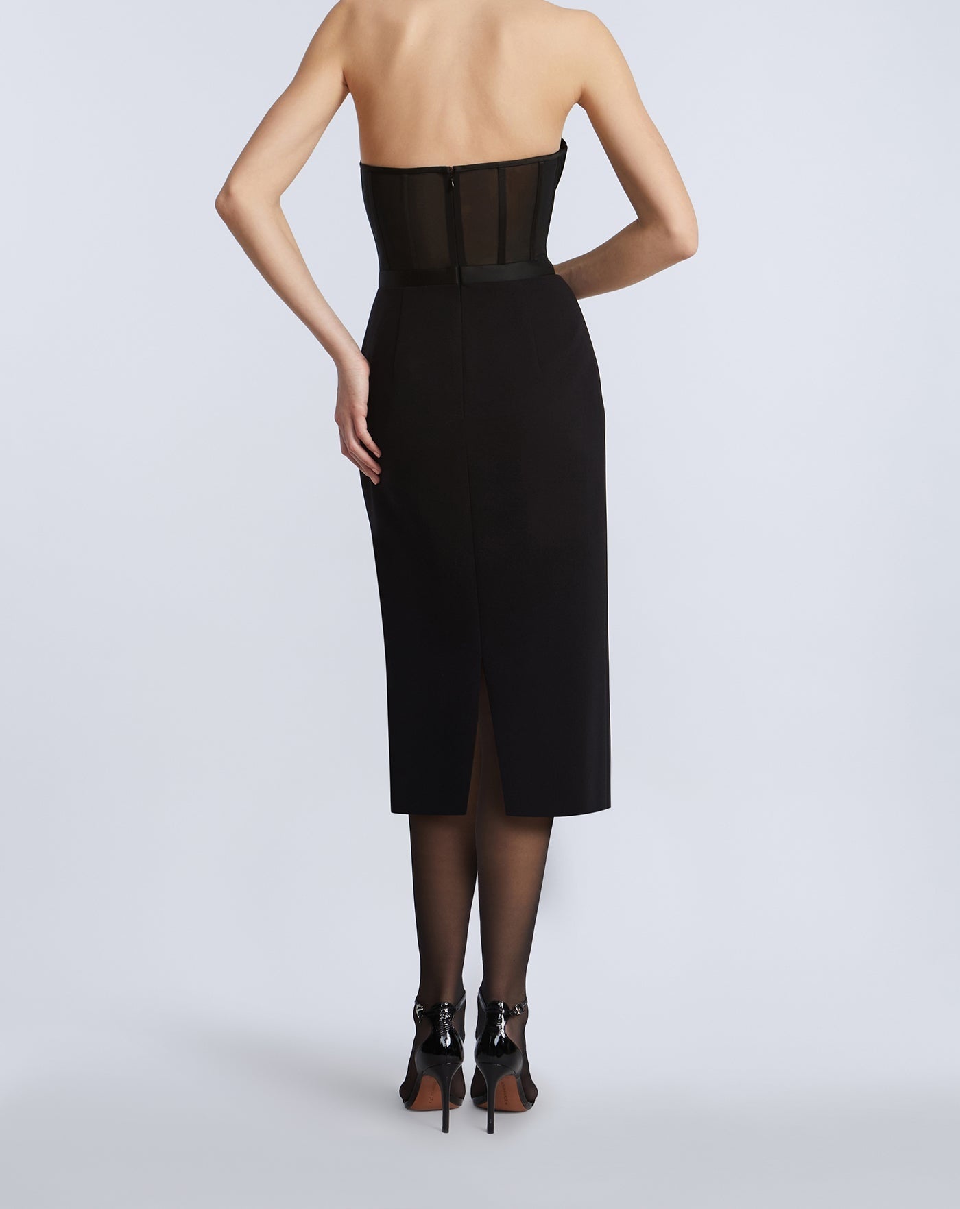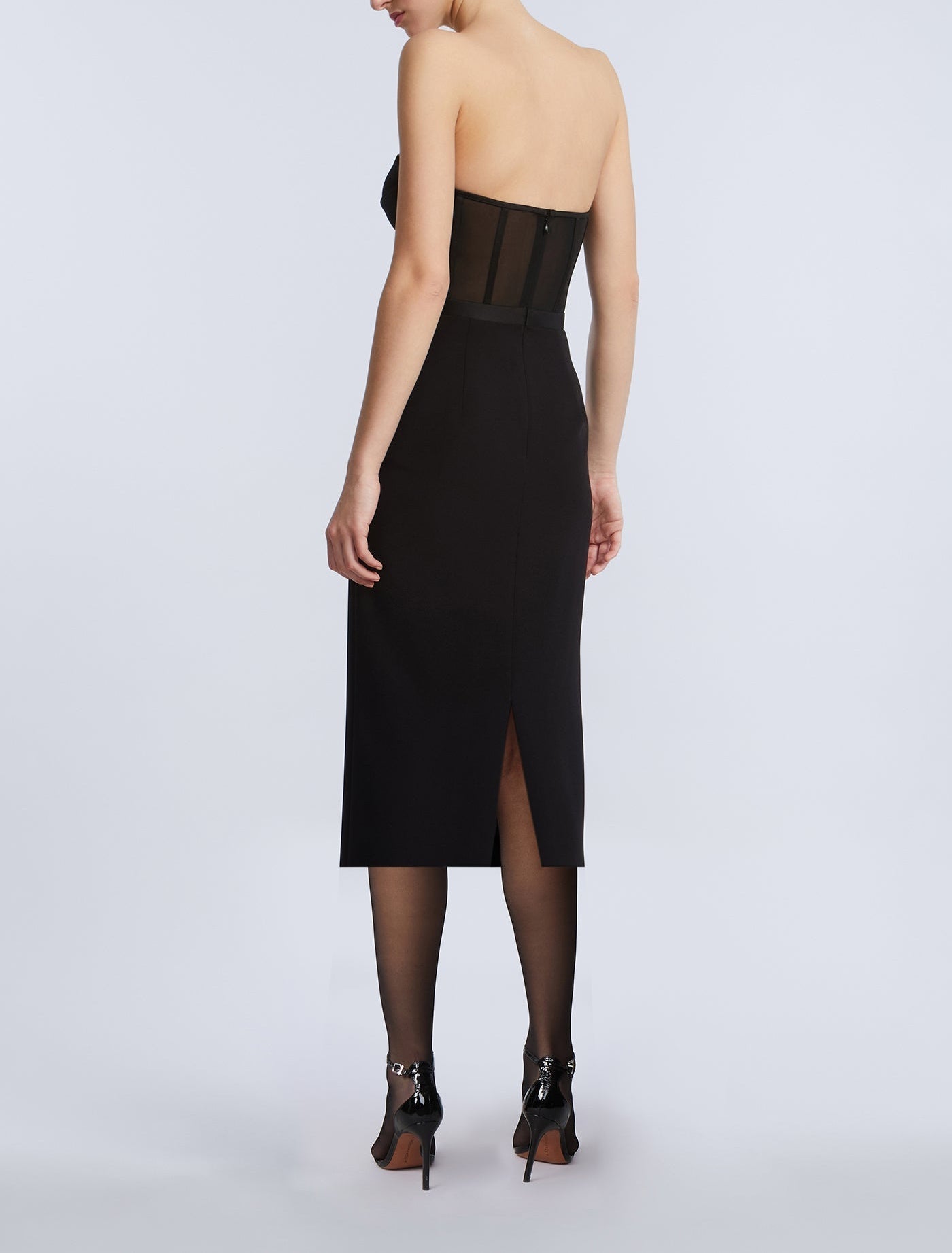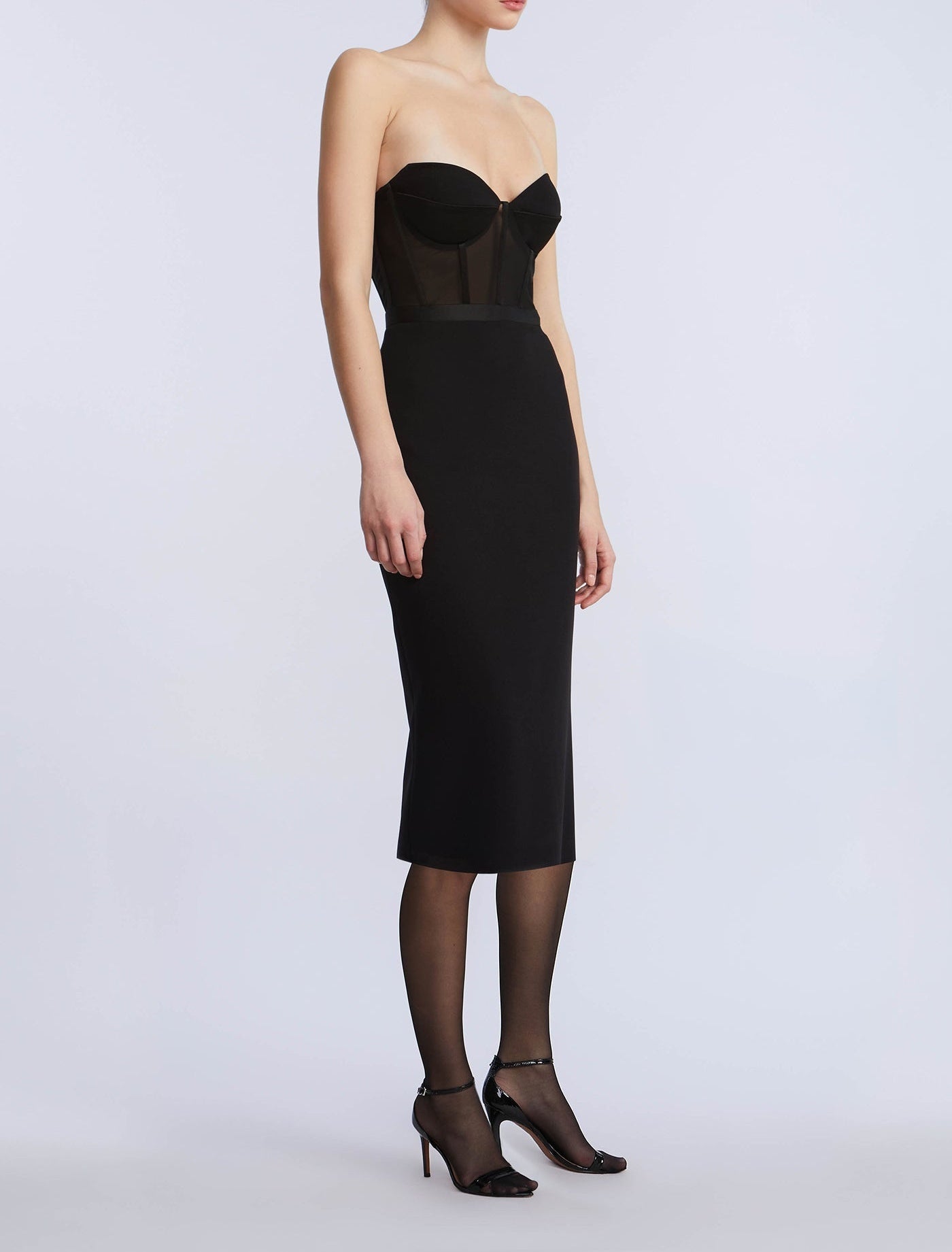 Strapless bustier dress with a sheer mesh bodice and sculpted cups. The pencil skirt falls below the knee for a sleek, elongated finish. Complete with a concealed back zipper and back vent—your secret weapon for cocktail hours and beyond.
