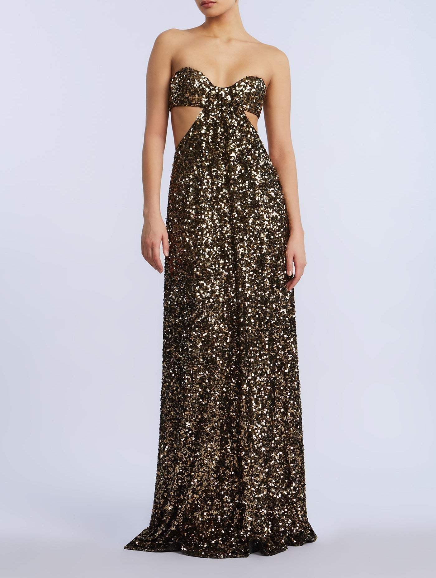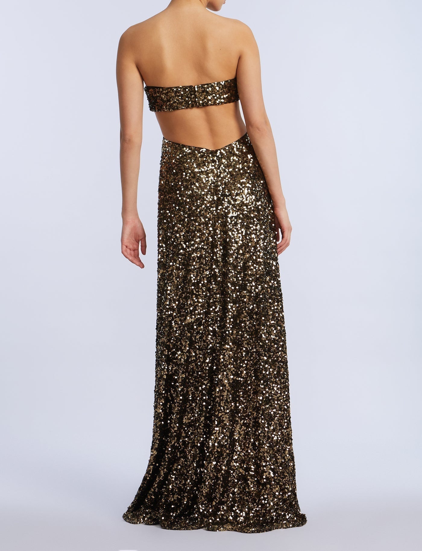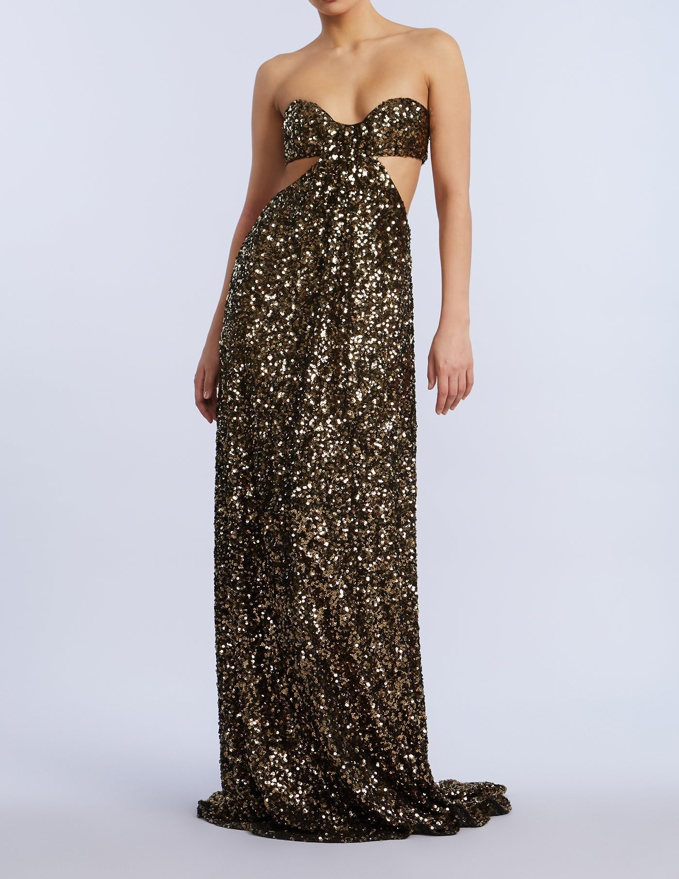 Gold sequin strapless gown with cutout detailing and soft bow-shaped bodice. Features a sculpted bandeau top with a draped floor-length skirt and soft train. Finished with a center-back zipper for easy wear.