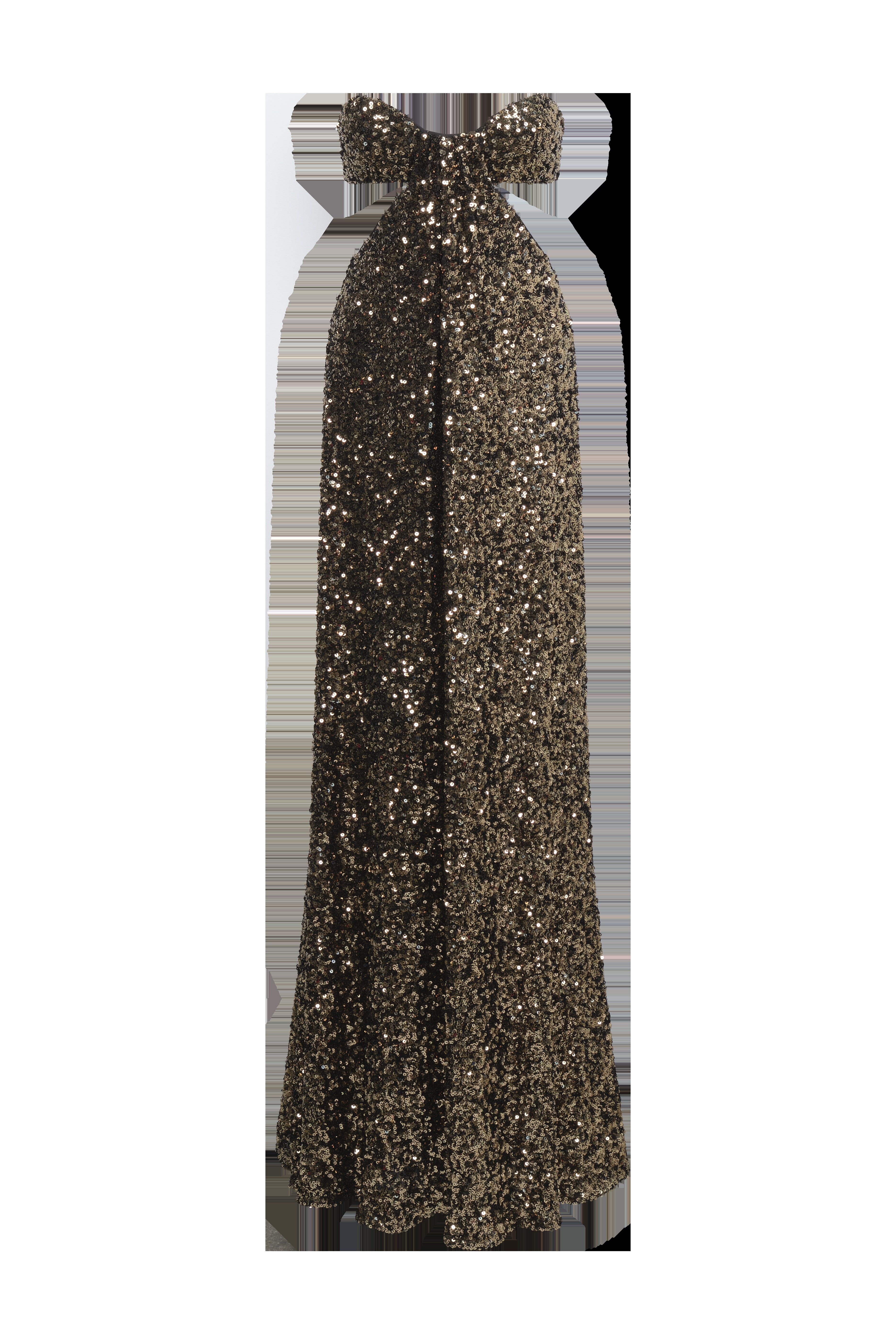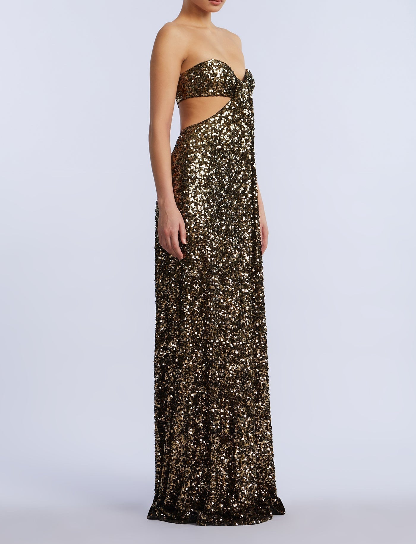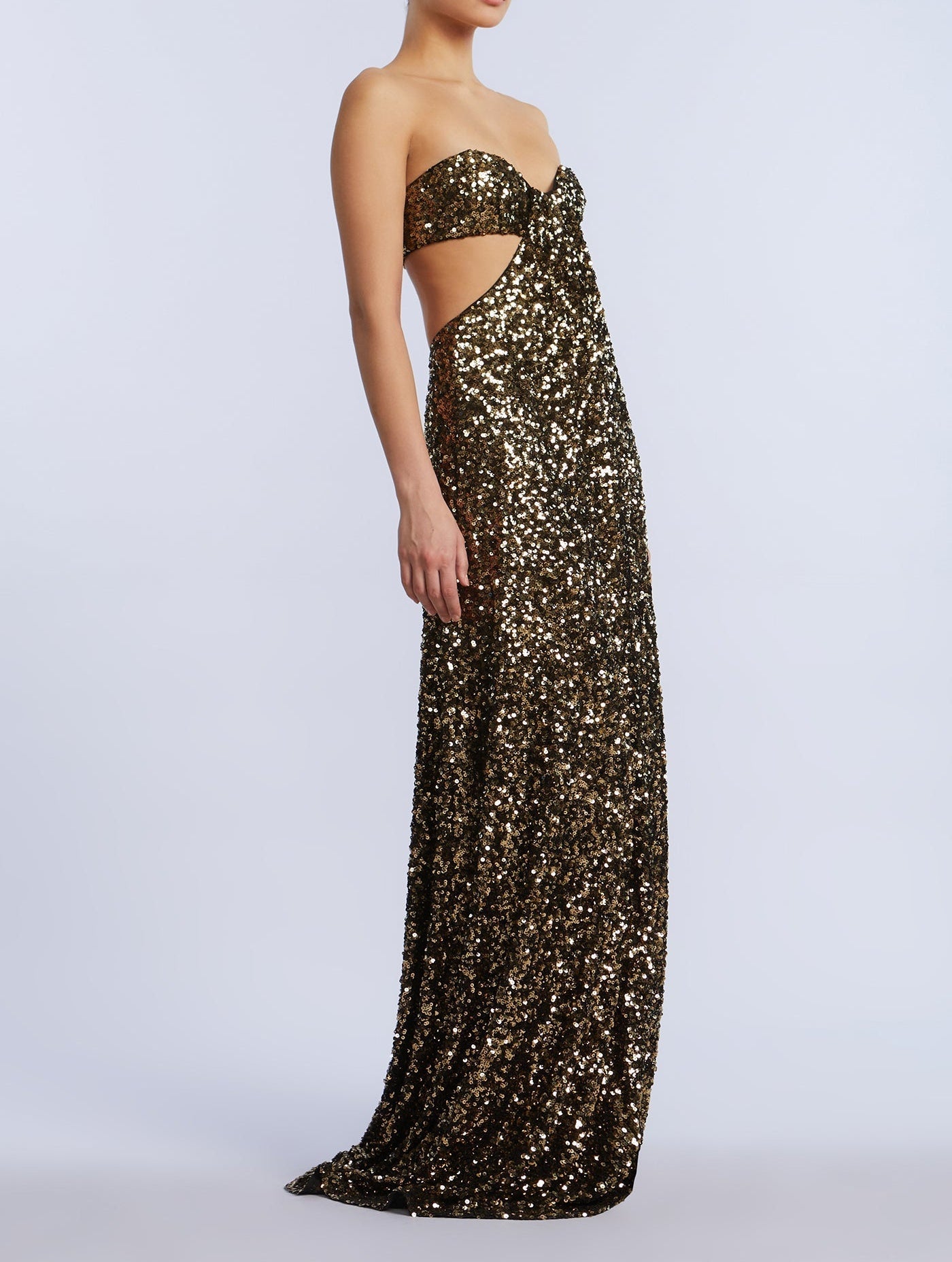 Gold sequin strapless gown with cutout detailing and soft bow-shaped bodice. Features a sculpted bandeau top with a draped floor-length skirt and soft train. Finished with a center-back zipper for easy wear.