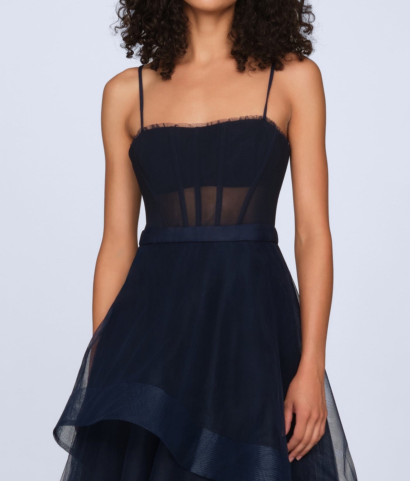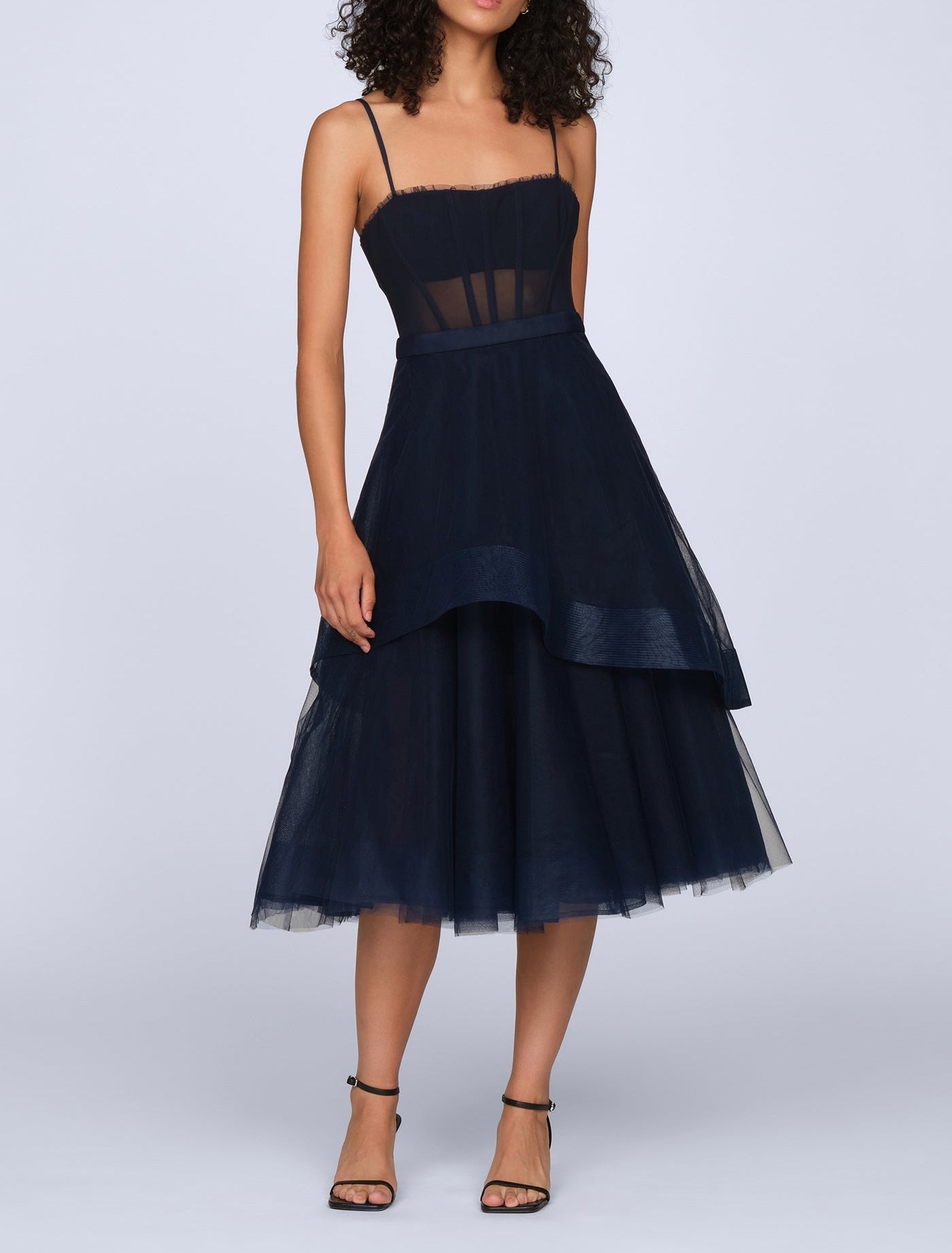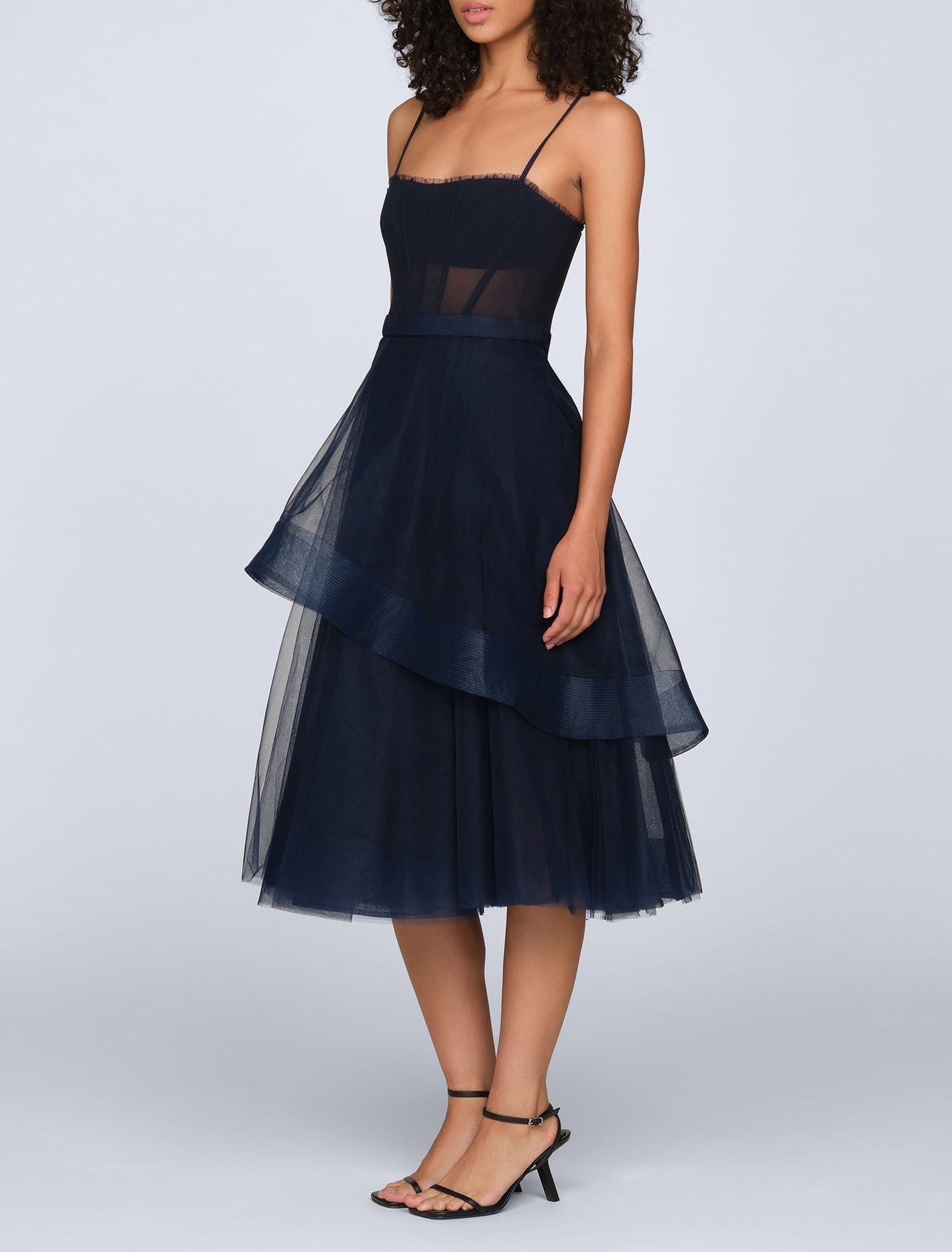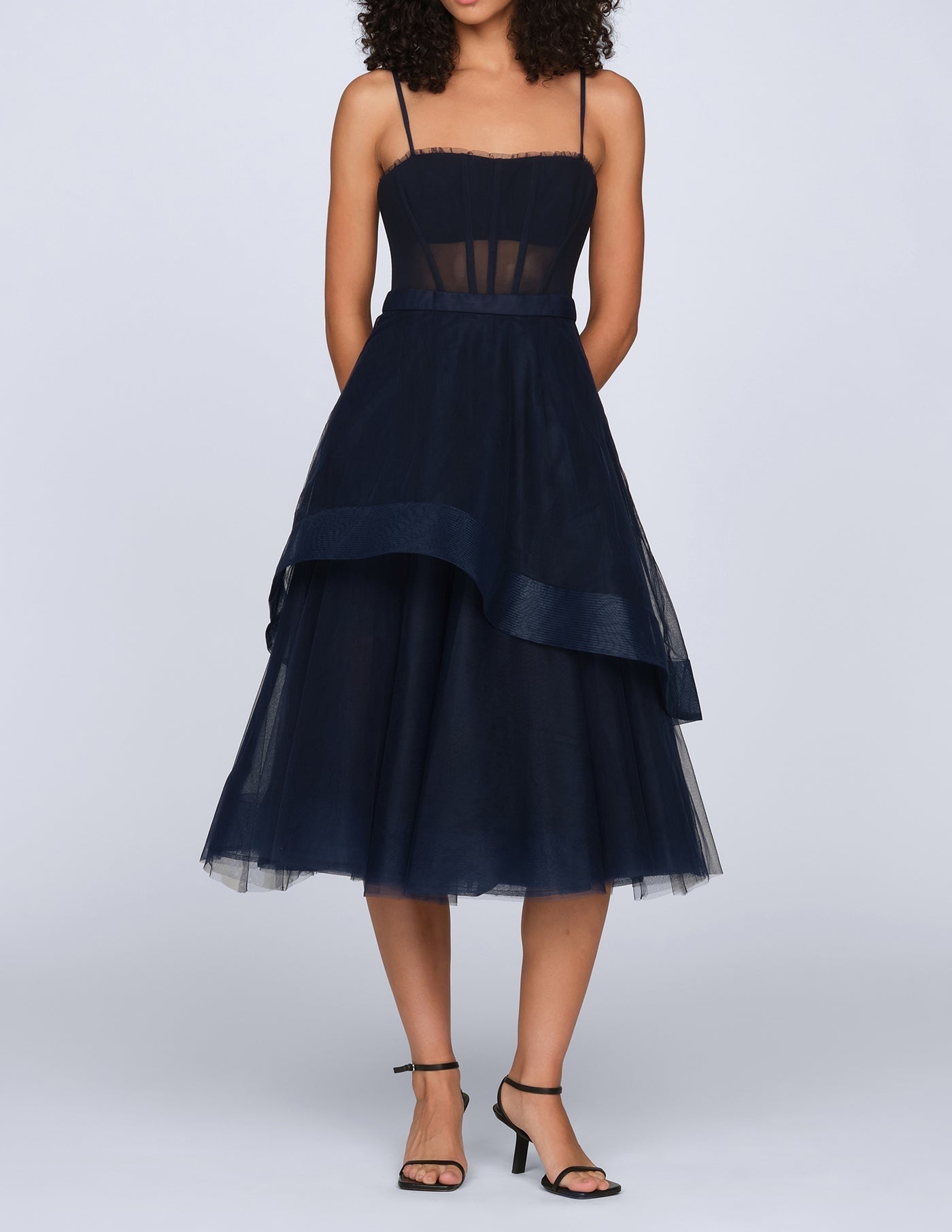 Tulle tea-length dress with sheer corset bodice and layered full skirt. Designed with raw-edge trim and an asymmetric peplum overlay for added dimension. A romantic pick for cocktail parties or winter weddings.
