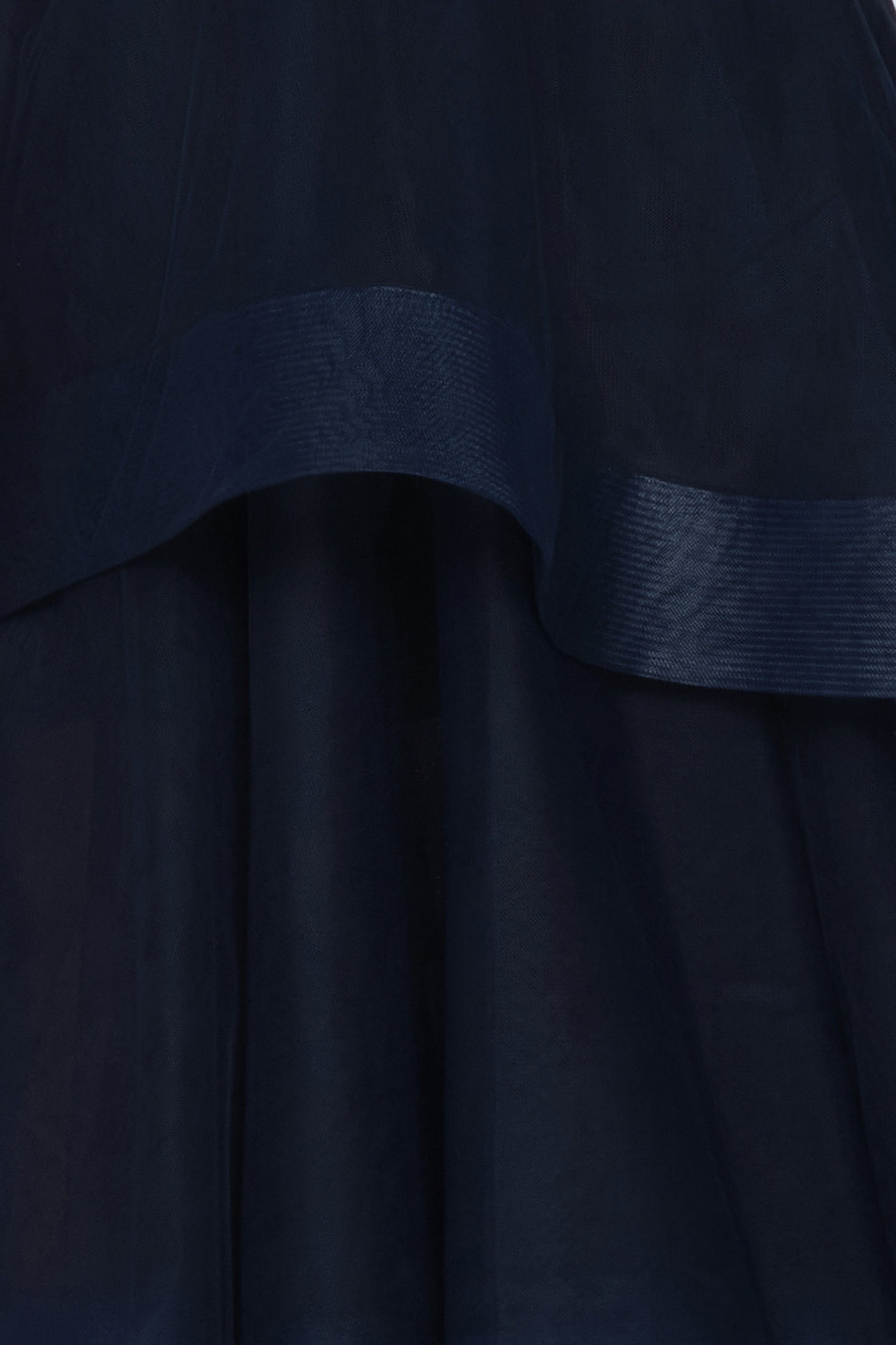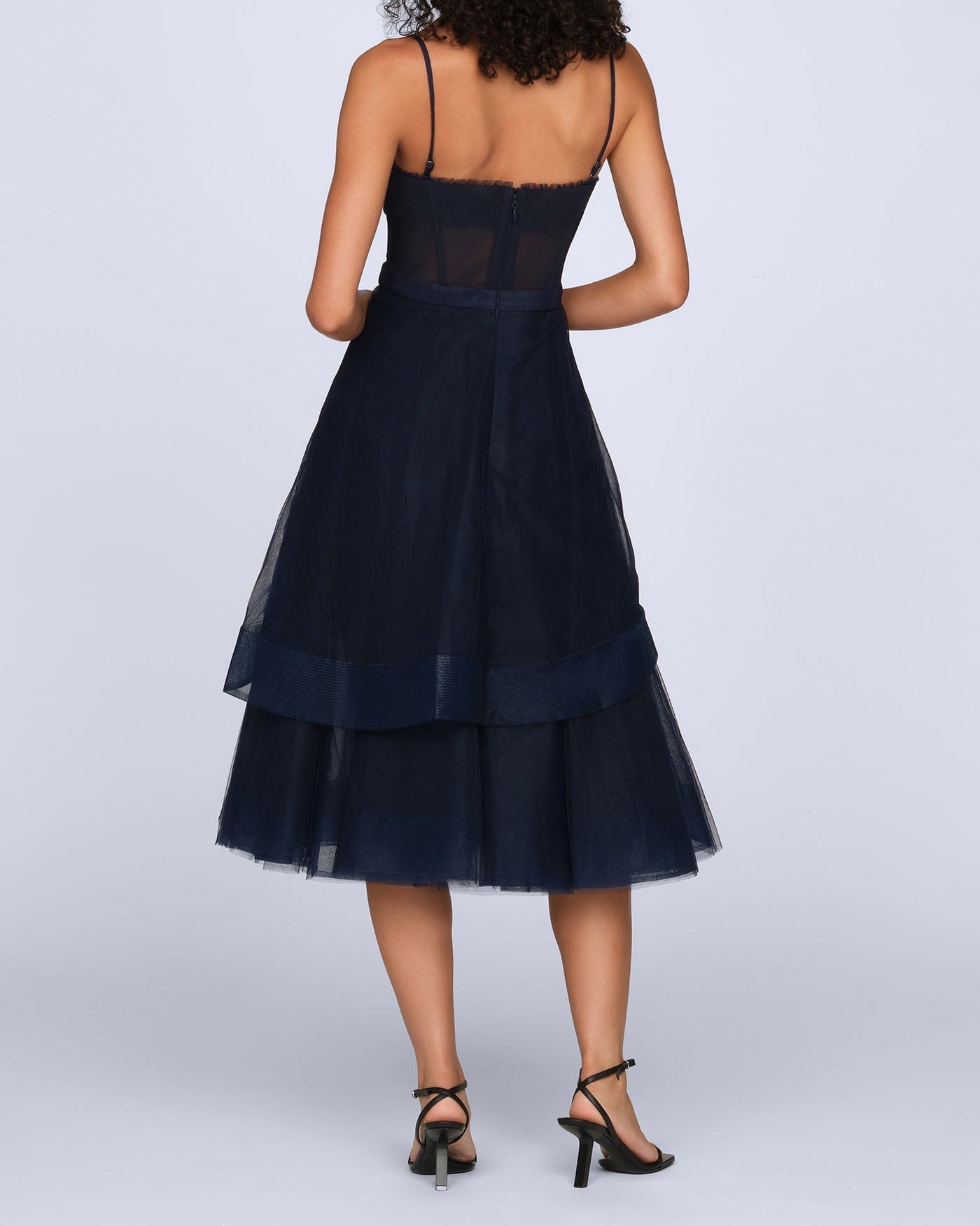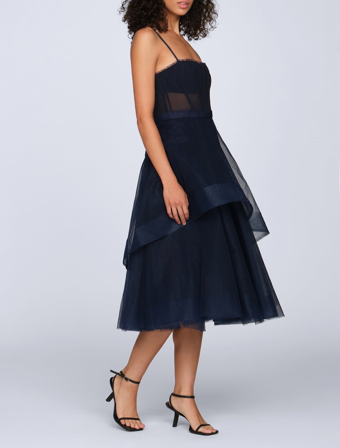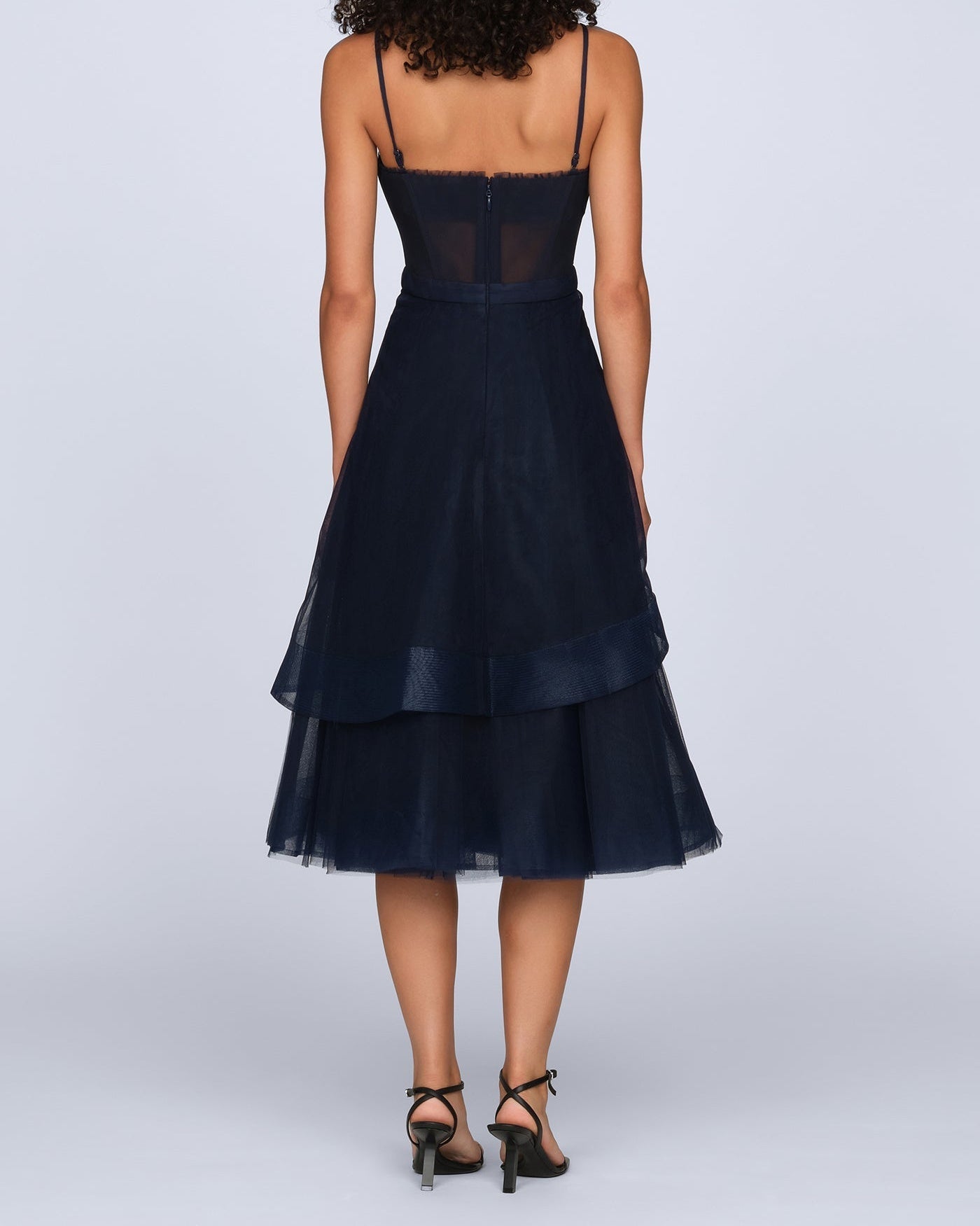 Tulle tea-length dress with sheer corset bodice and layered full skirt. Designed with raw-edge trim and an asymmetric peplum overlay for added dimension. A romantic pick for cocktail parties or winter weddings.
