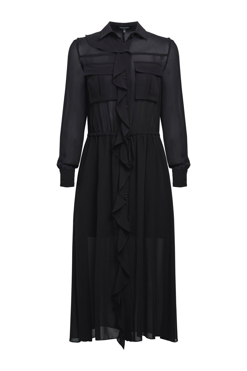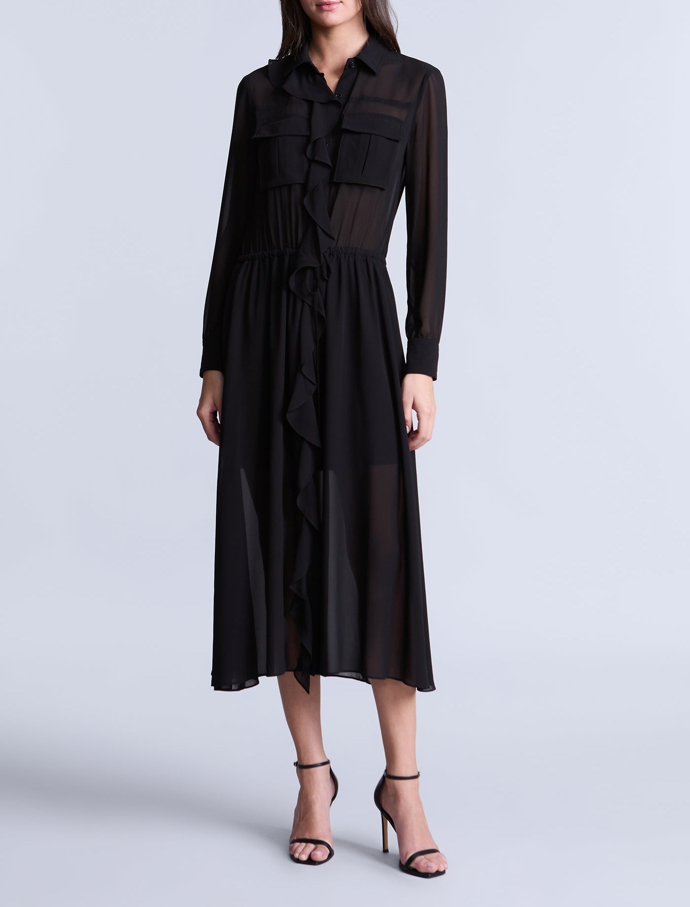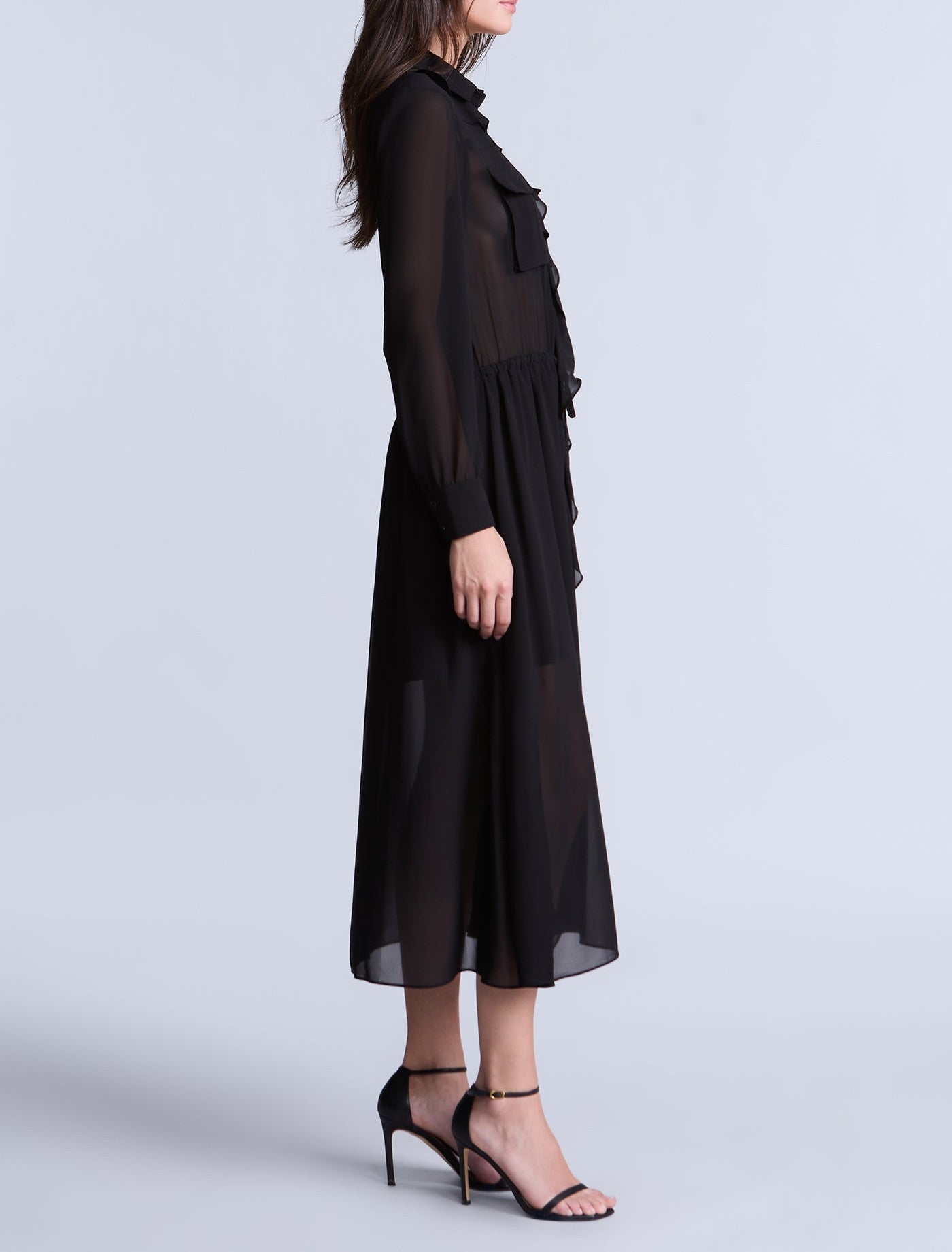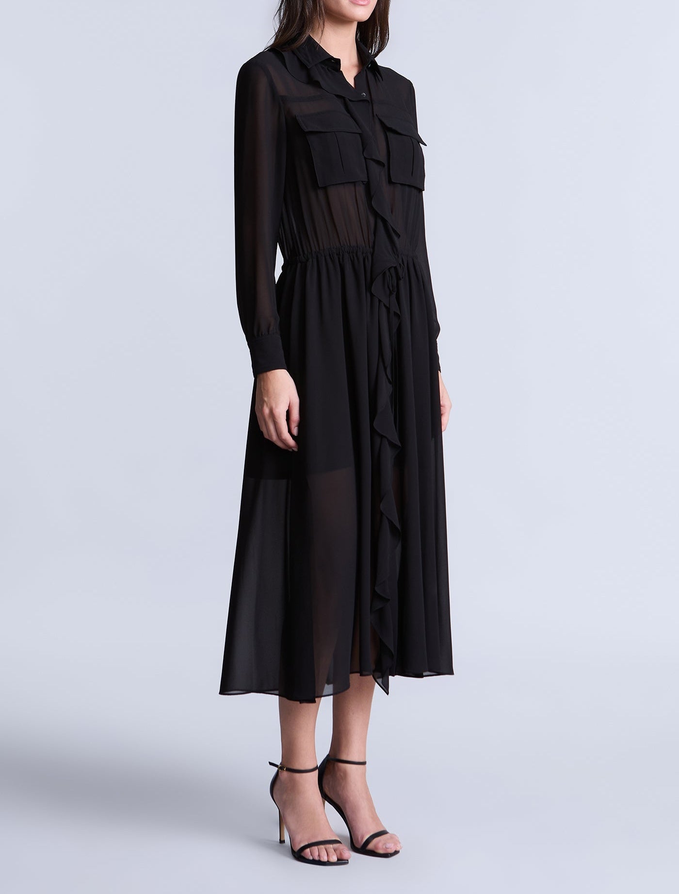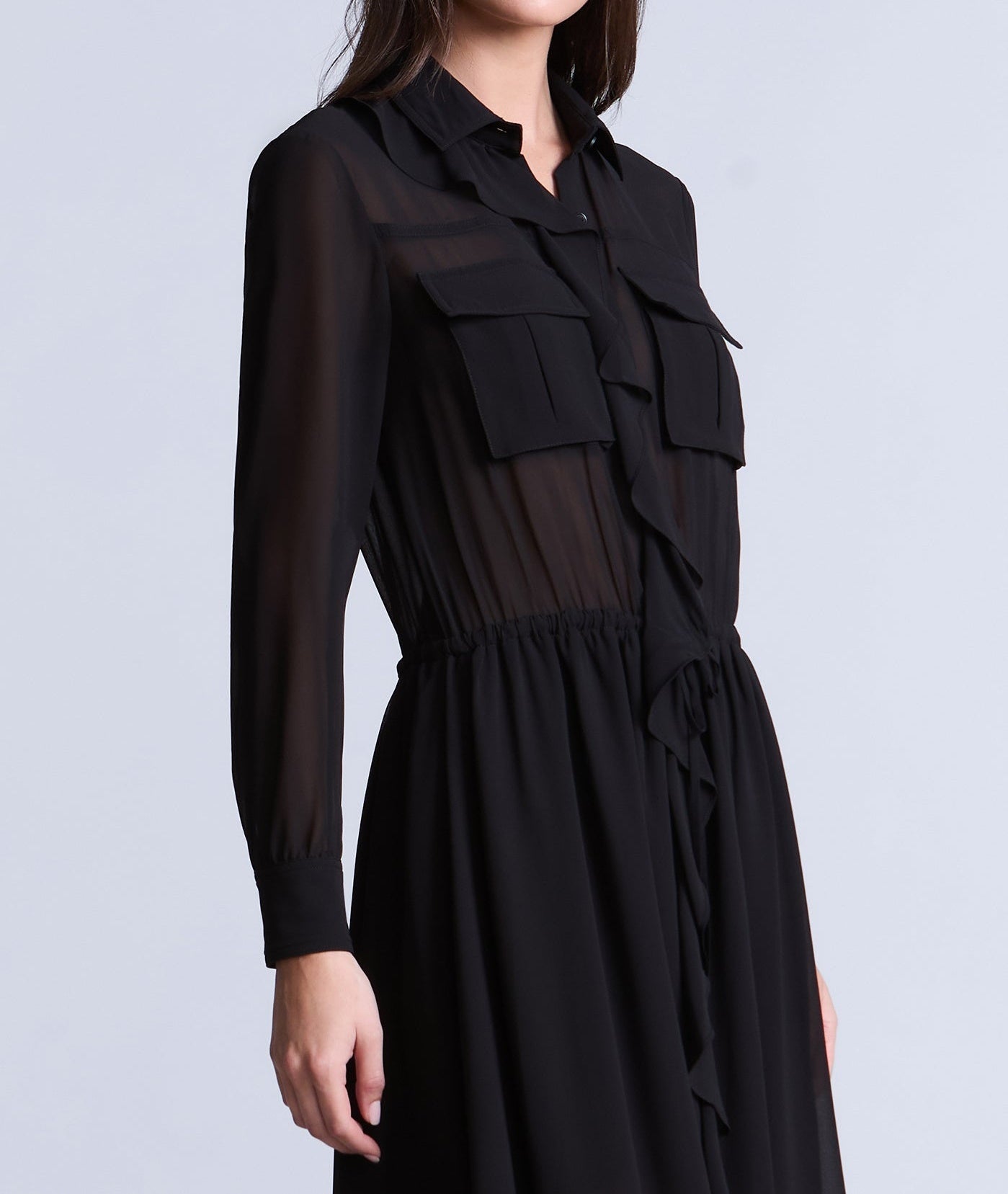 Sheer georgette midi shirt dress in classic black, trimmed with soft cascading ruffles. Designed with a gathered waist, flap chest pockets, and long sleeves with button cuffs. Partially lined with a hidden button front—perfect for work dinners or a polished weekend look.
