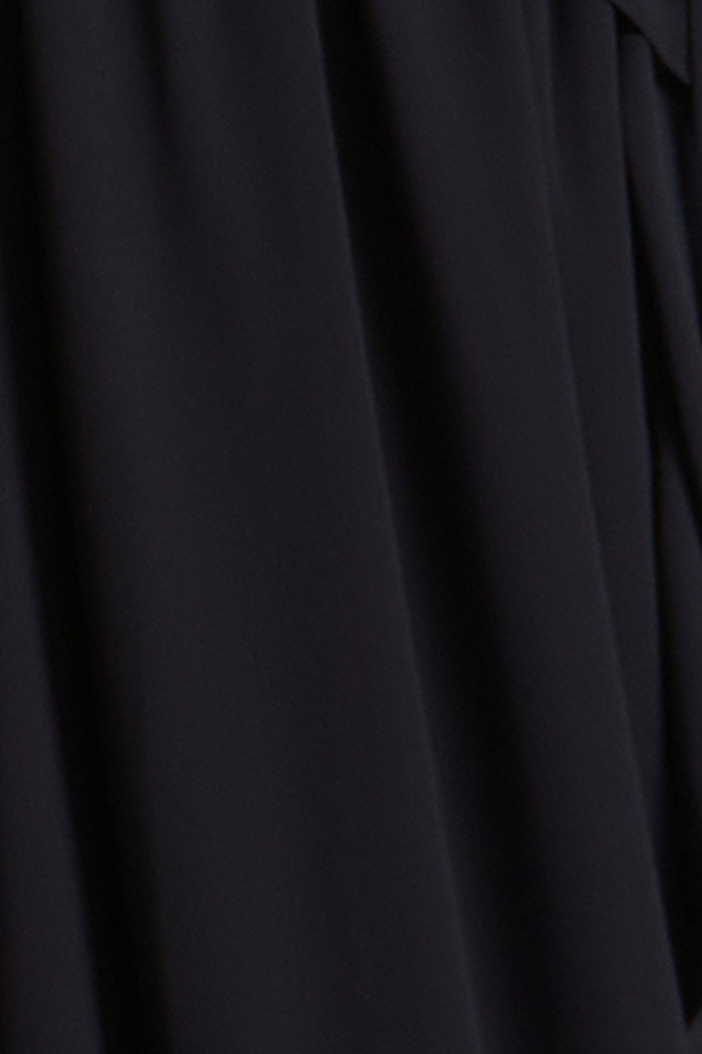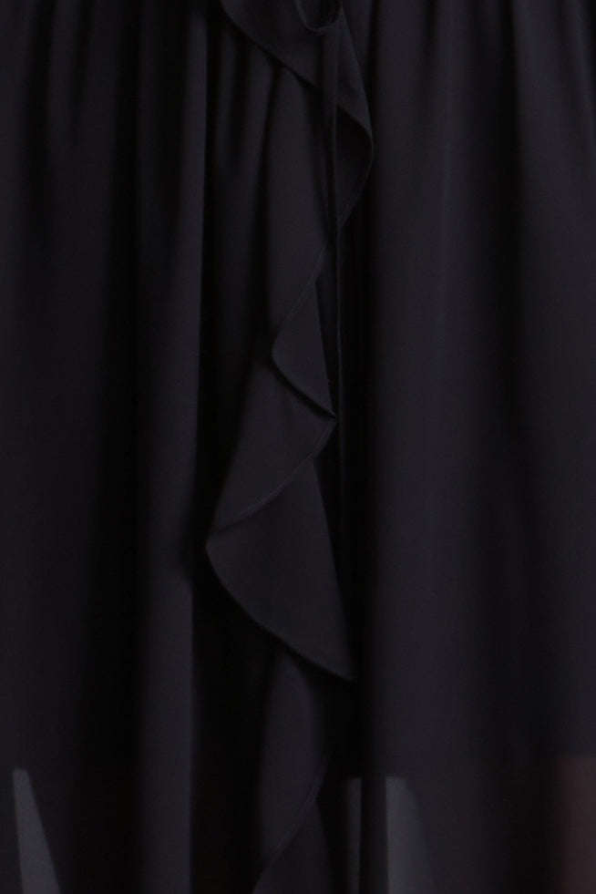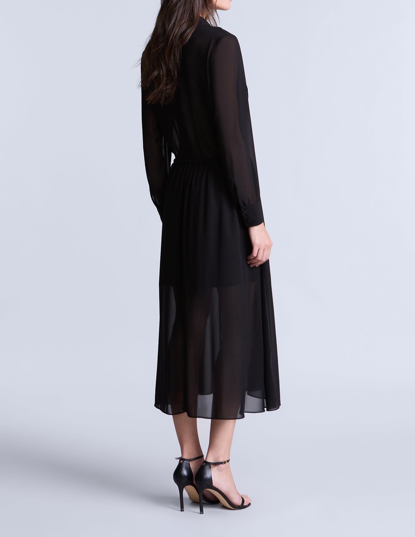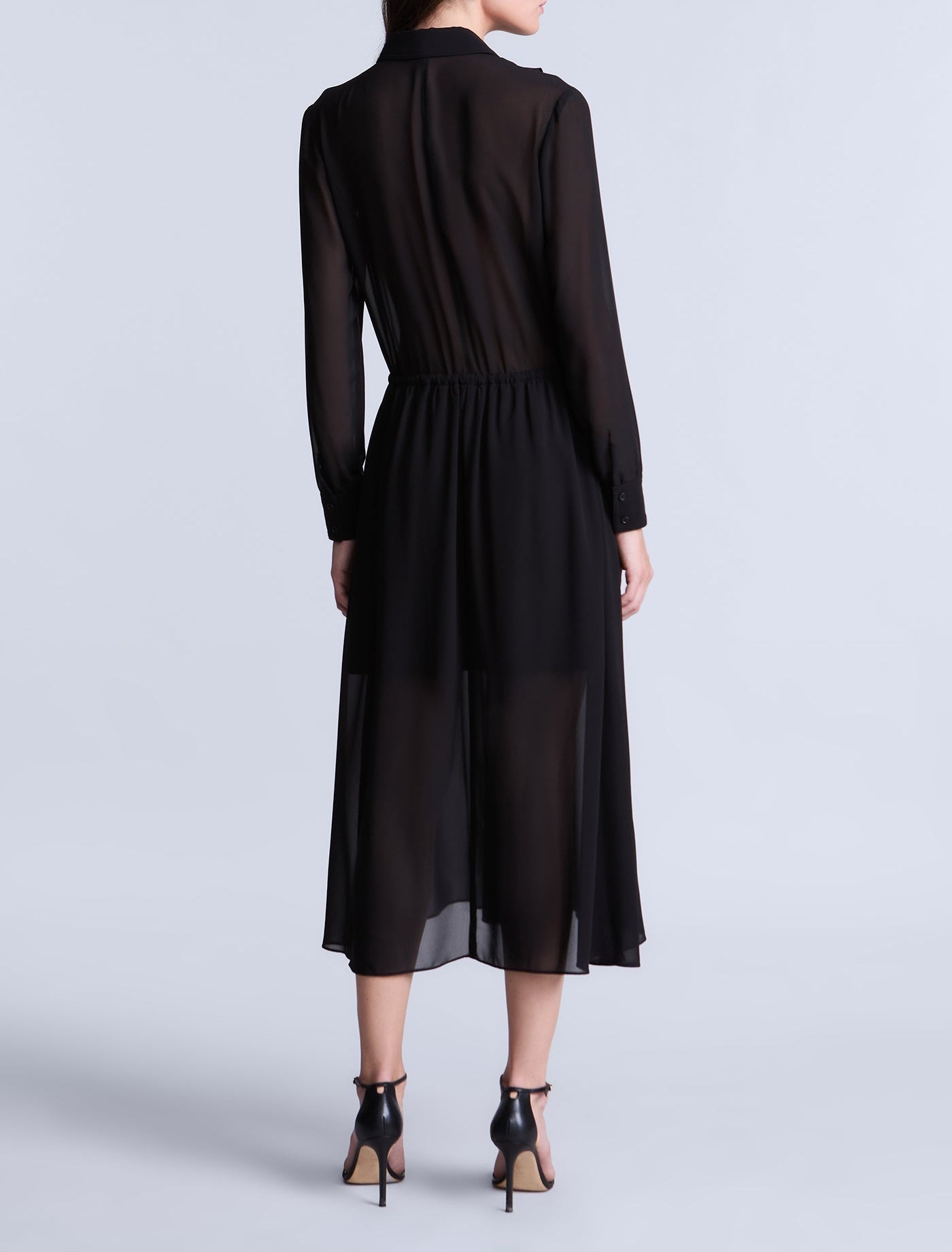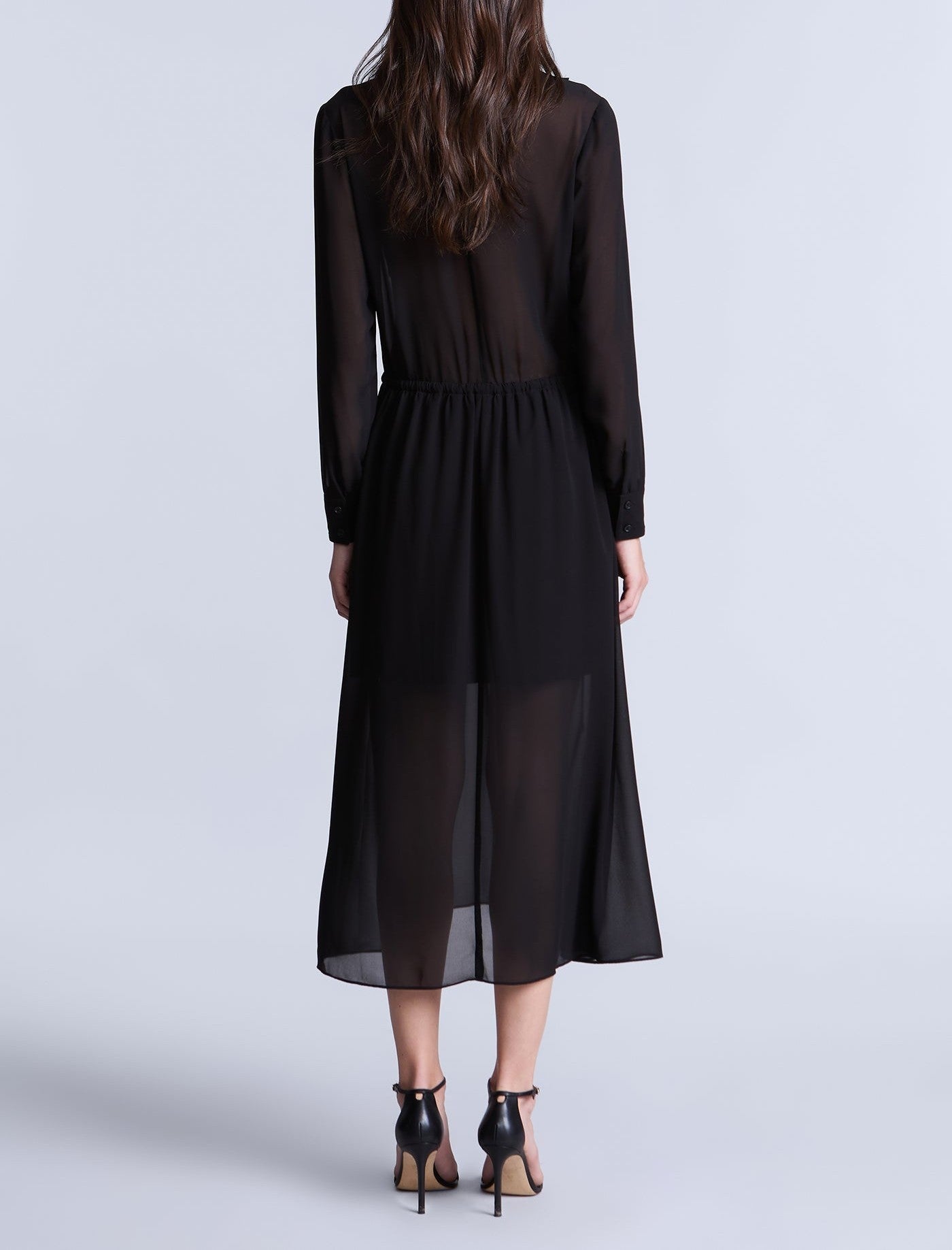 Sheer georgette midi shirt dress in classic black, trimmed with soft cascading ruffles. Designed with a gathered waist, flap chest pockets, and long sleeves with button cuffs. Partially lined with a hidden button front—perfect for work dinners or a polished weekend look.