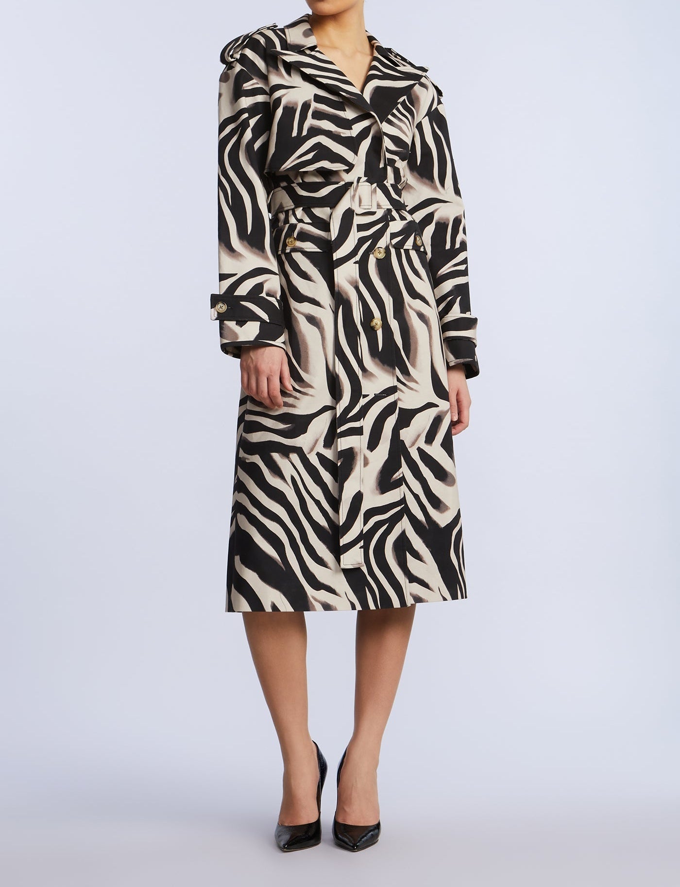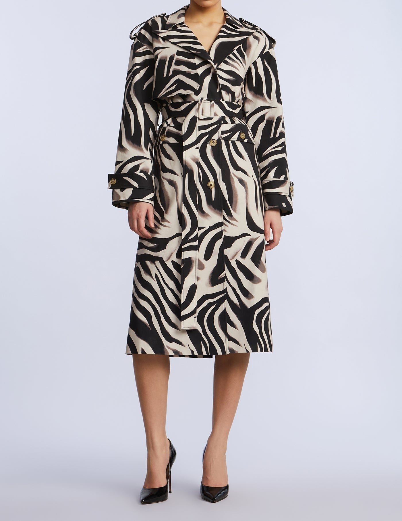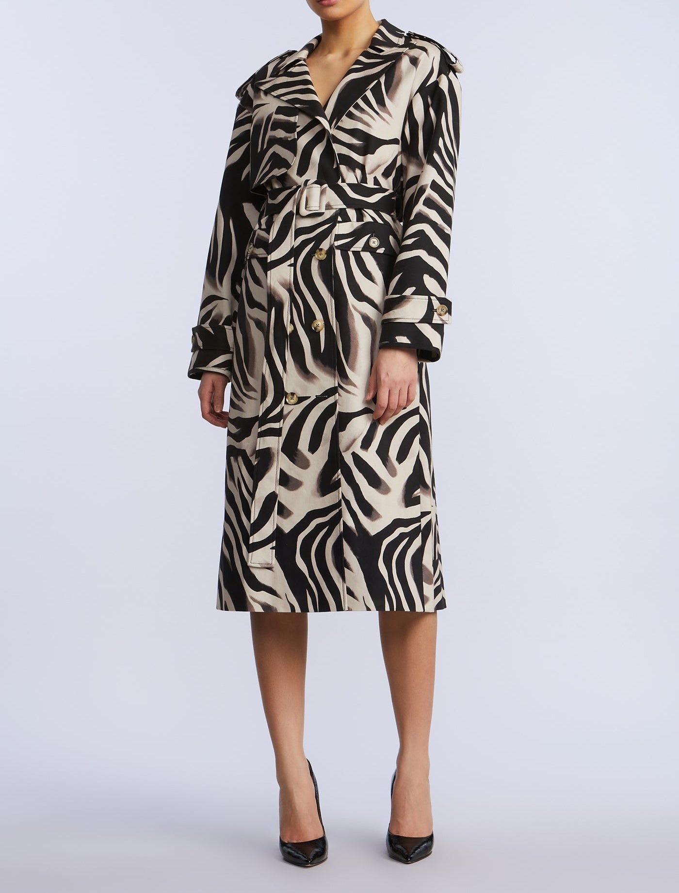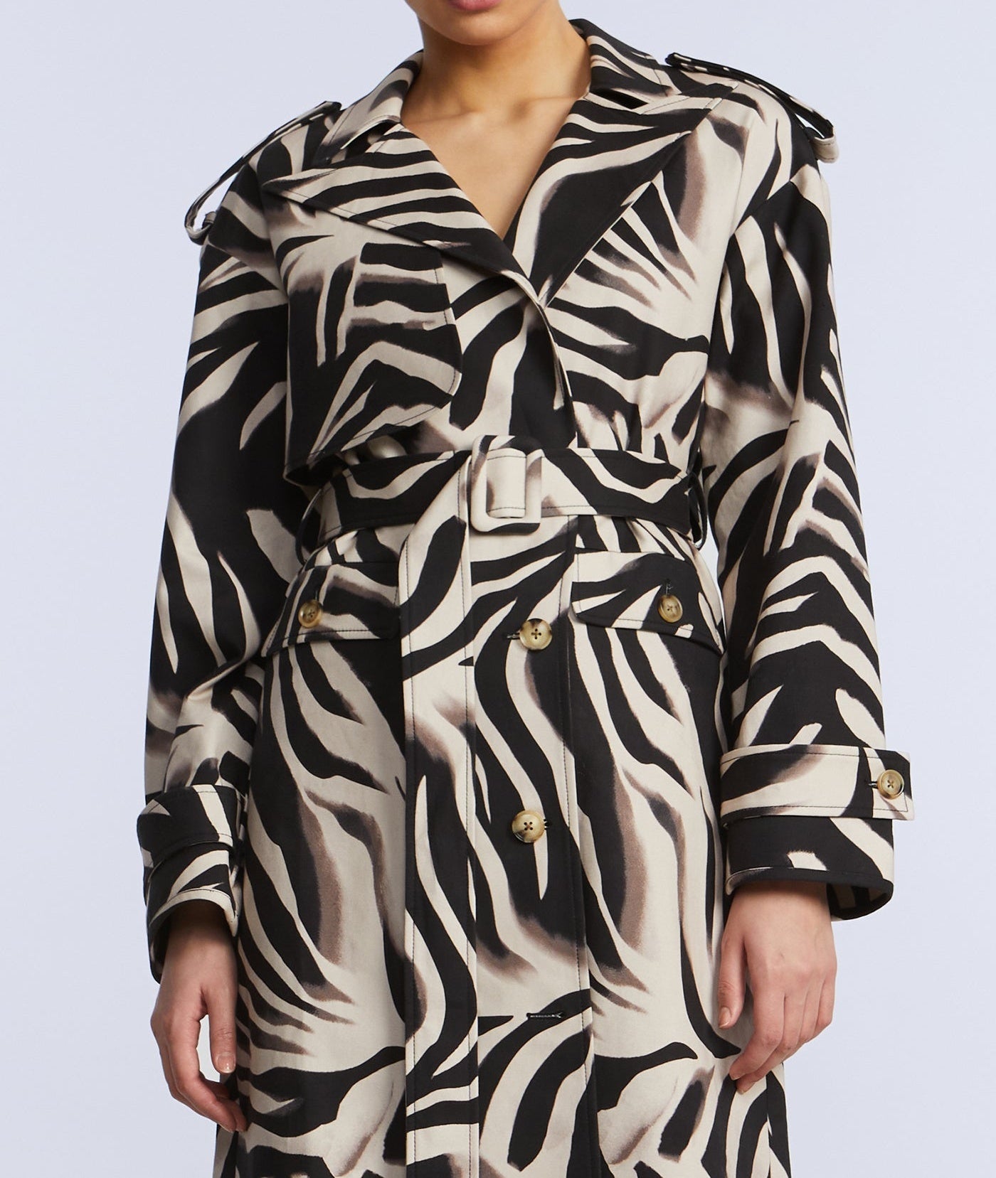 Statement trench coat in a tonal zebra print with epaulettes, a belted waist, and storm flap details. Finished with gold-toned hardware for a polished edge. Equal parts wild and refined—made for city strolls and fall layering.