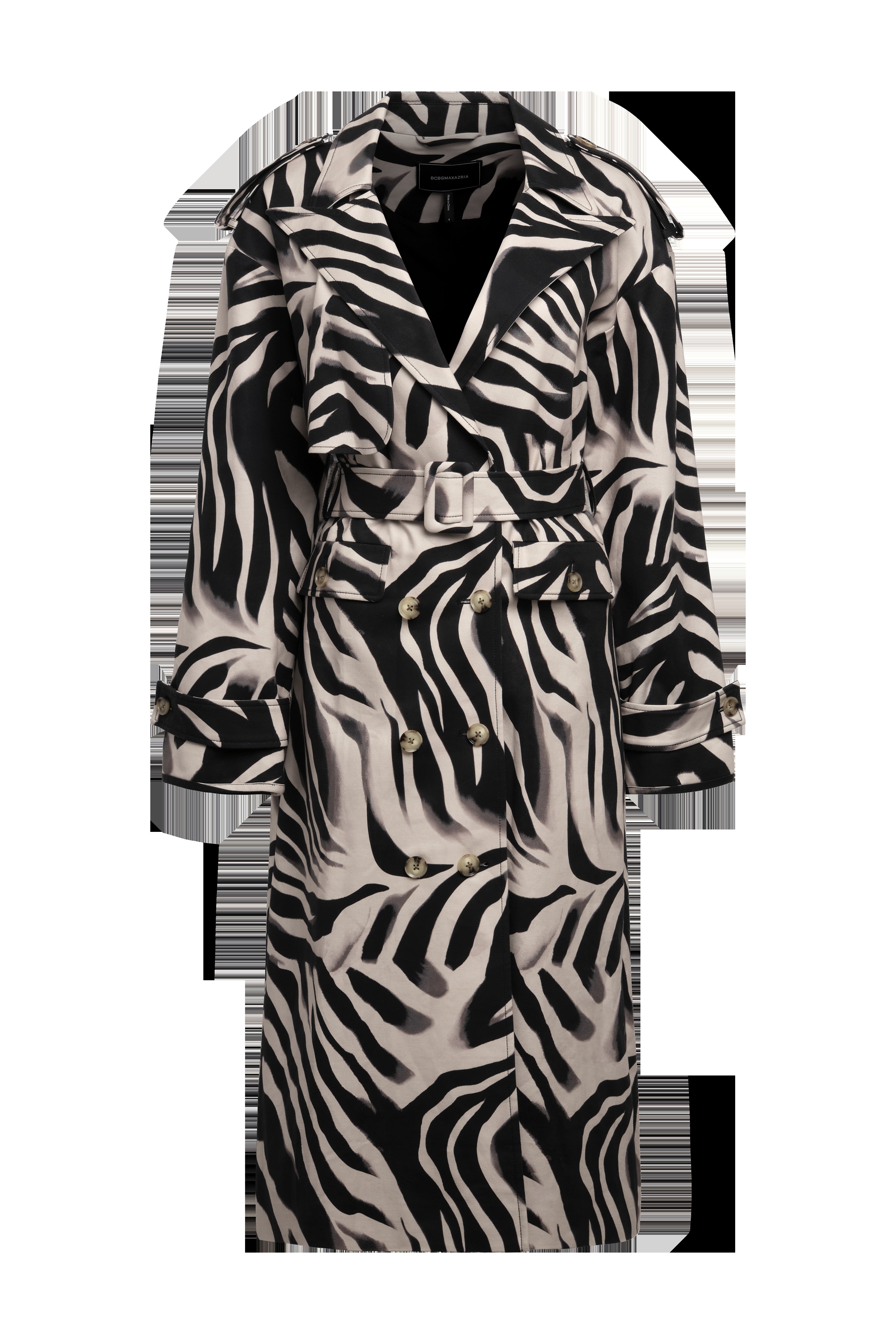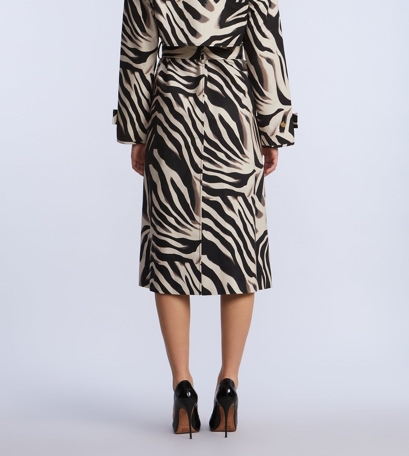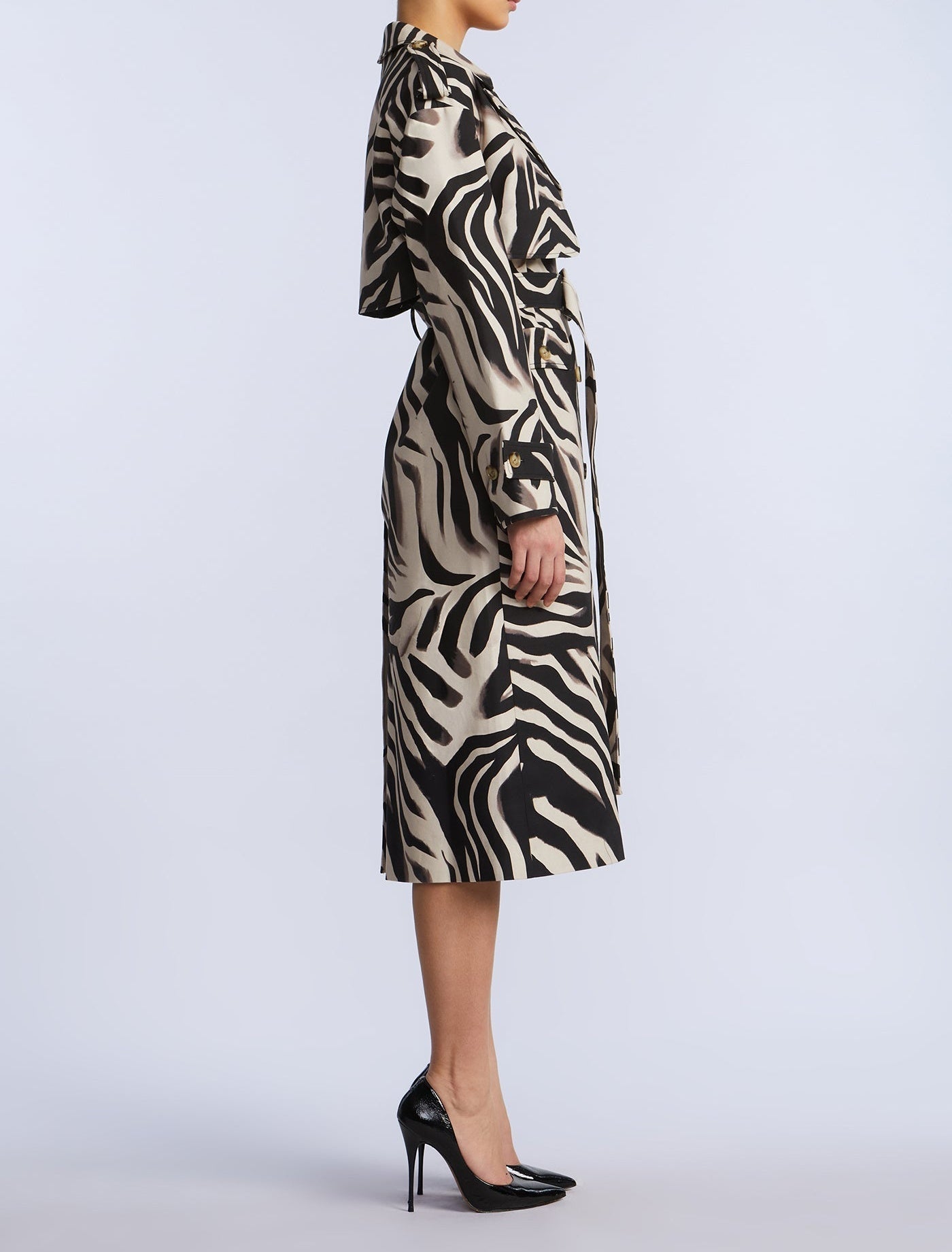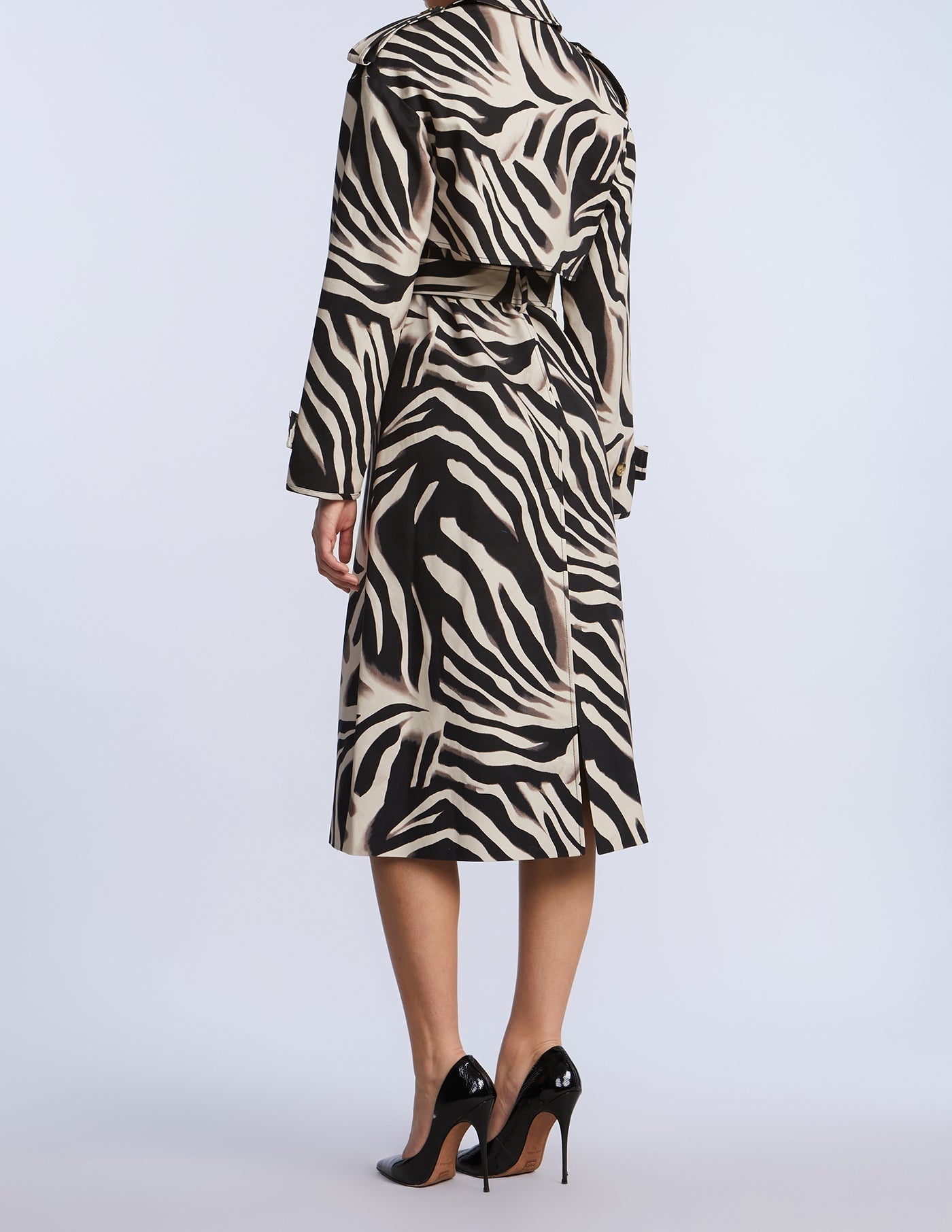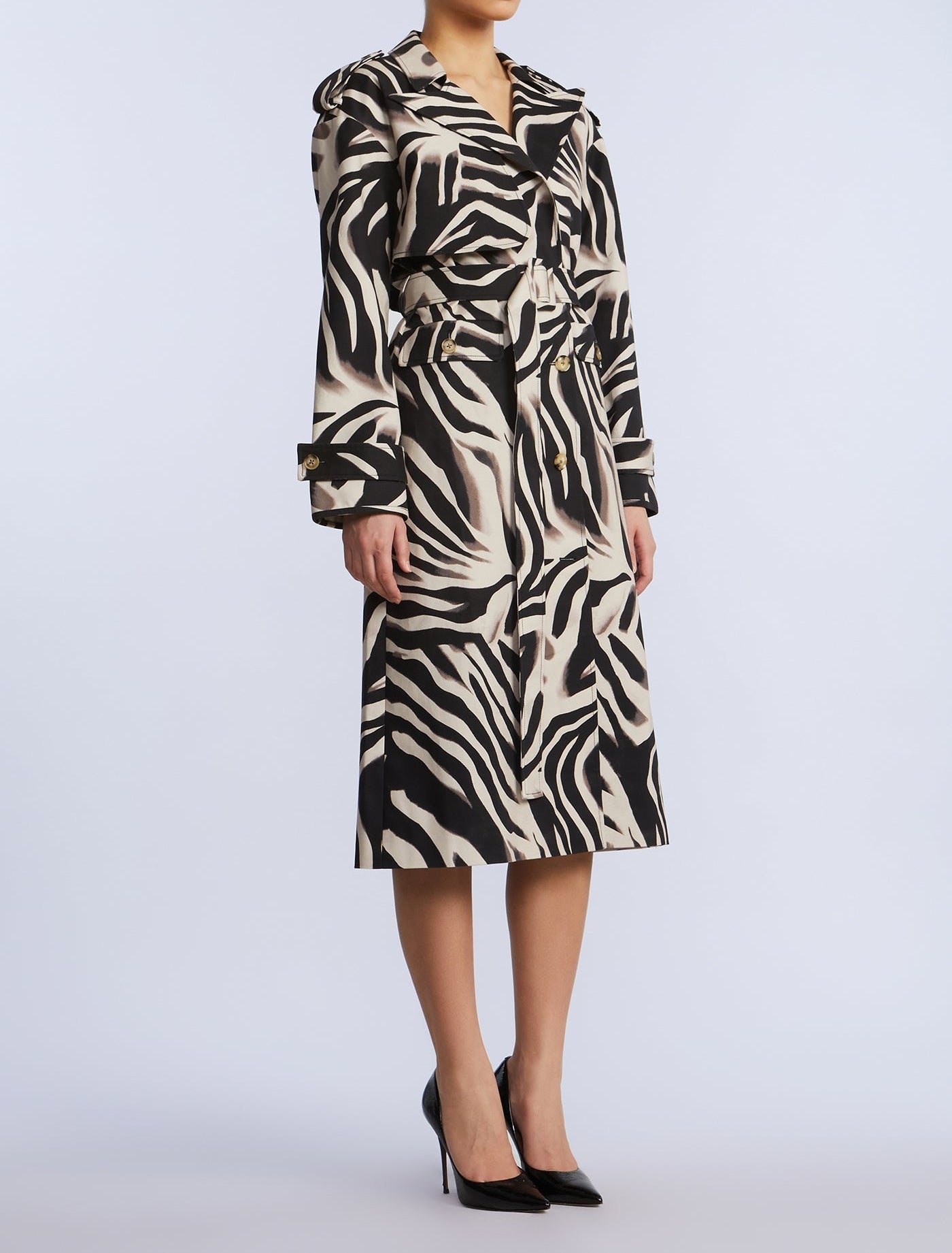 Statement trench coat in a tonal zebra print with epaulettes, a belted waist, and storm flap details. Finished with gold-toned hardware for a polished edge. Equal parts wild and refined—made for city strolls and fall layering.