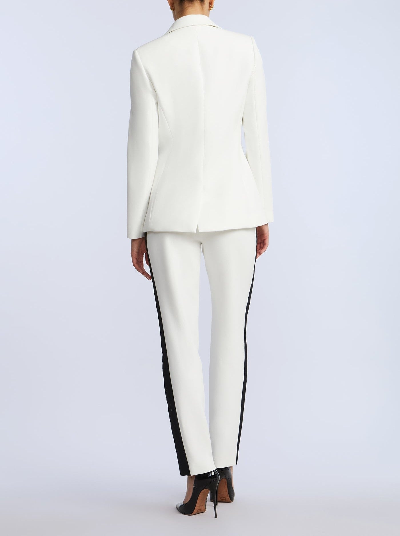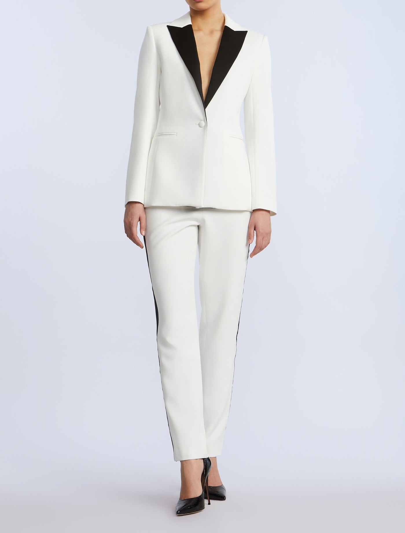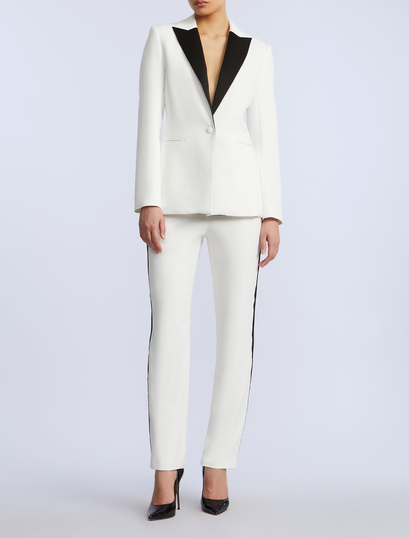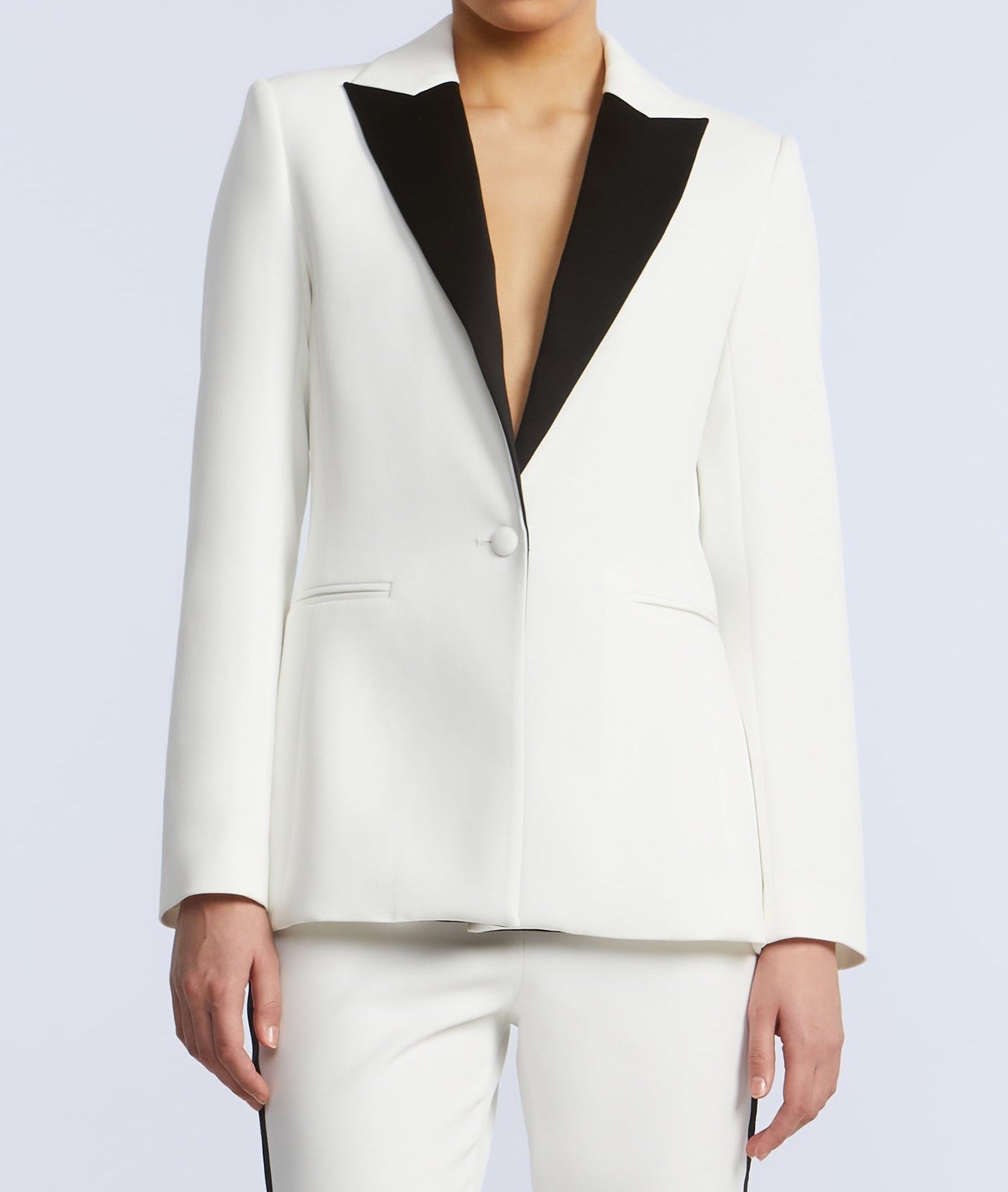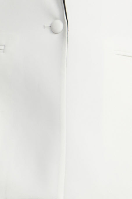 White suiting blazer with tonal satin lapels and a single button closure. Fully lined with soft shoulder structure and jet pockets. Sharp, clean, and designed to turn heads.