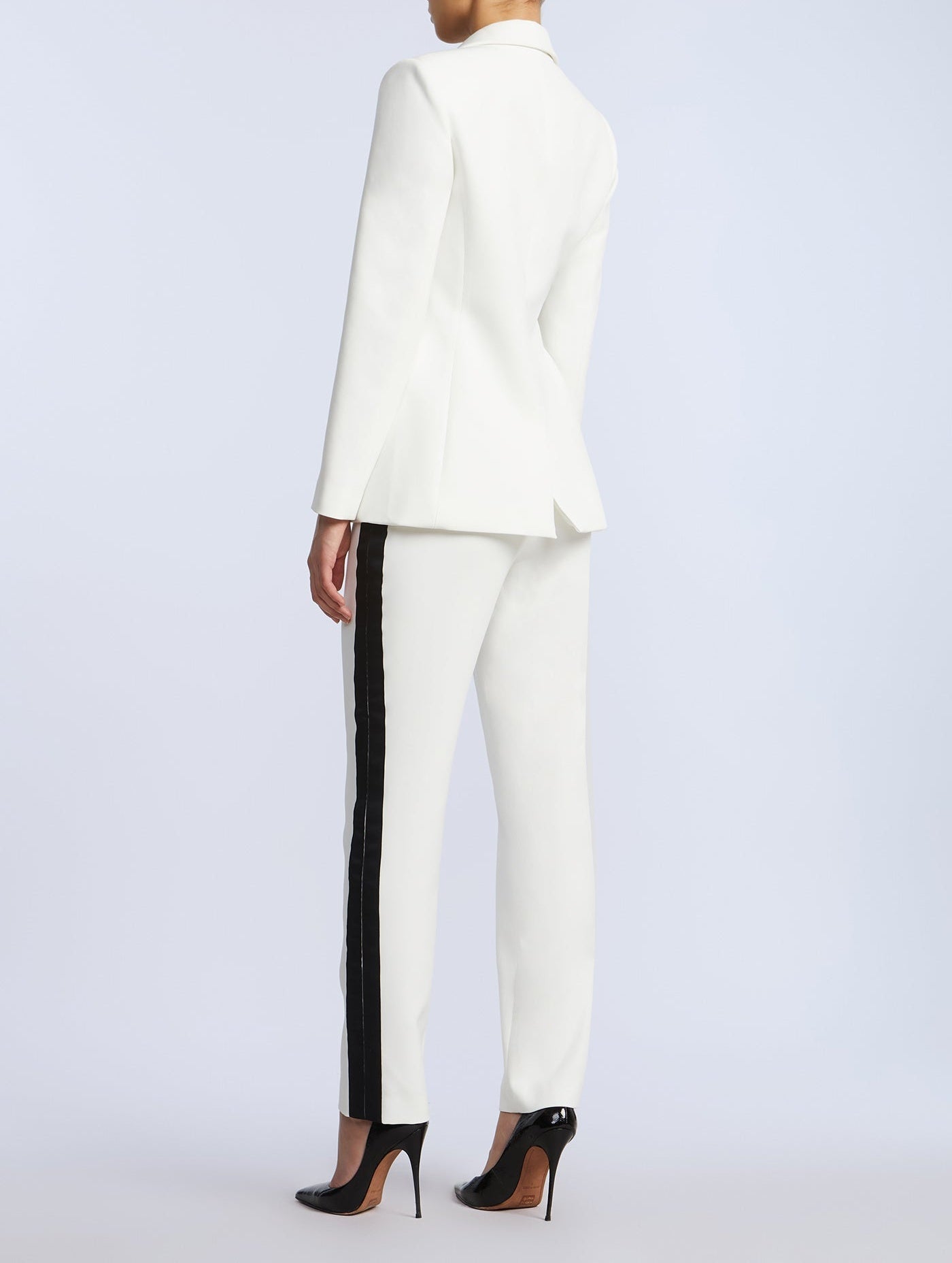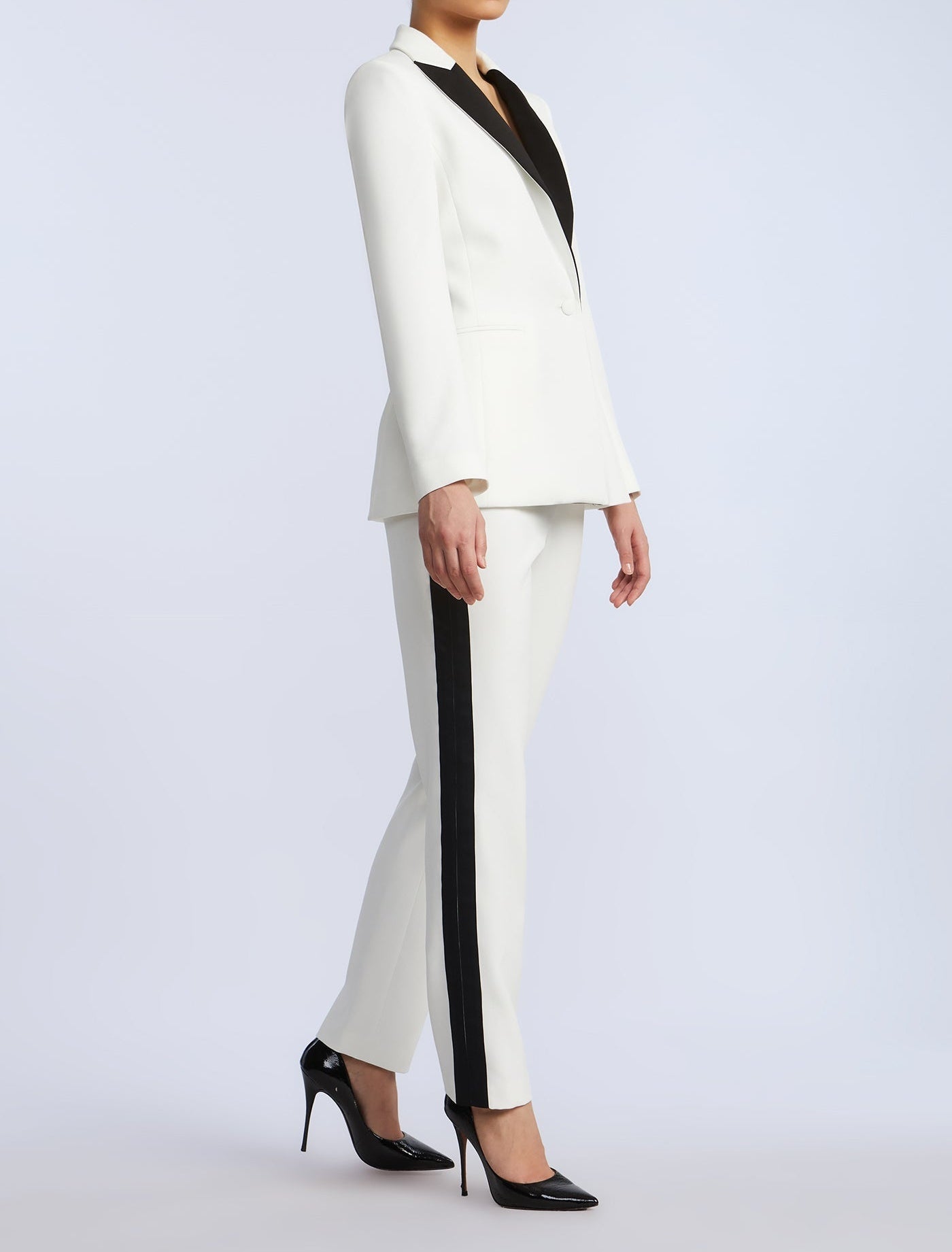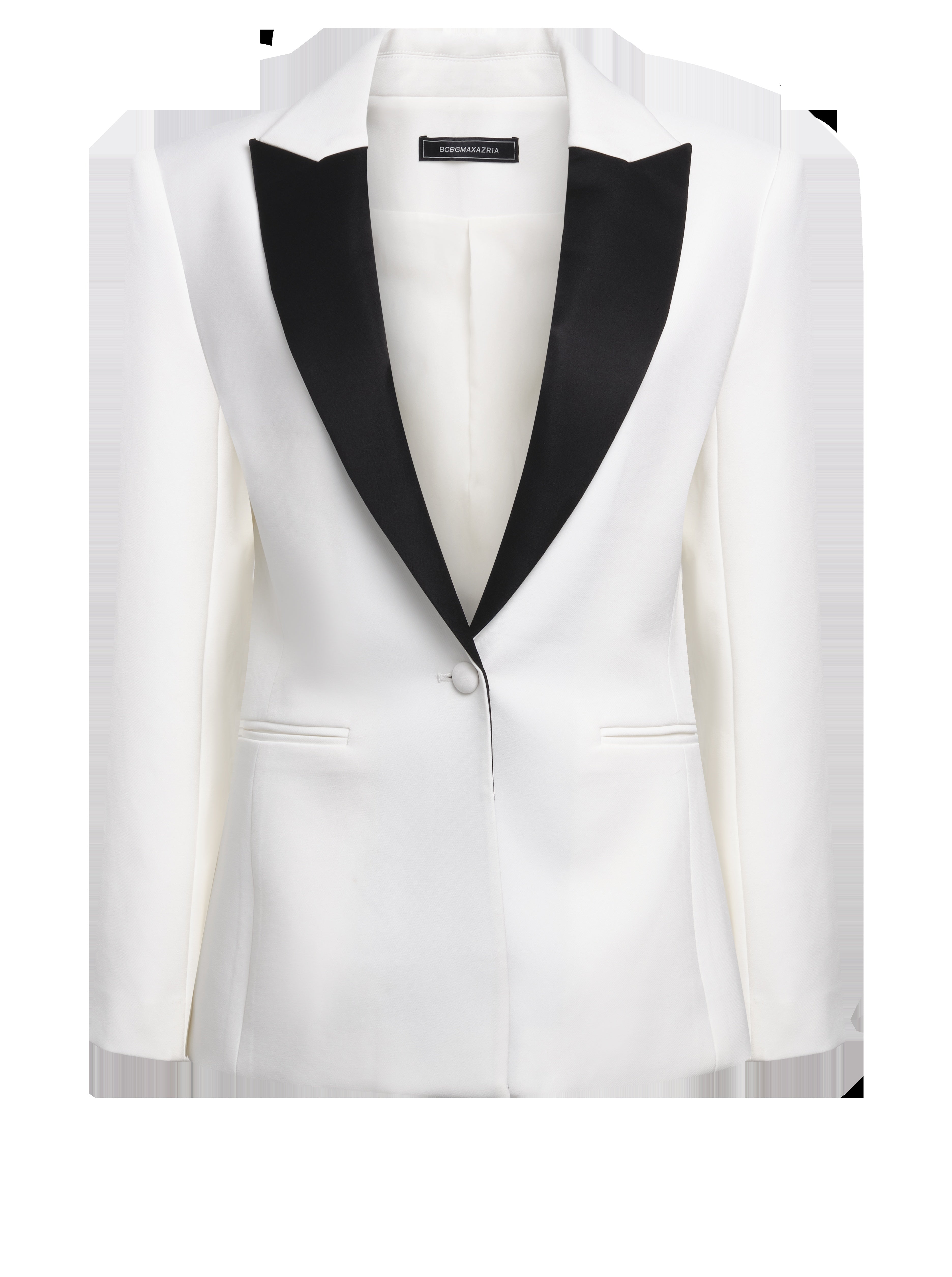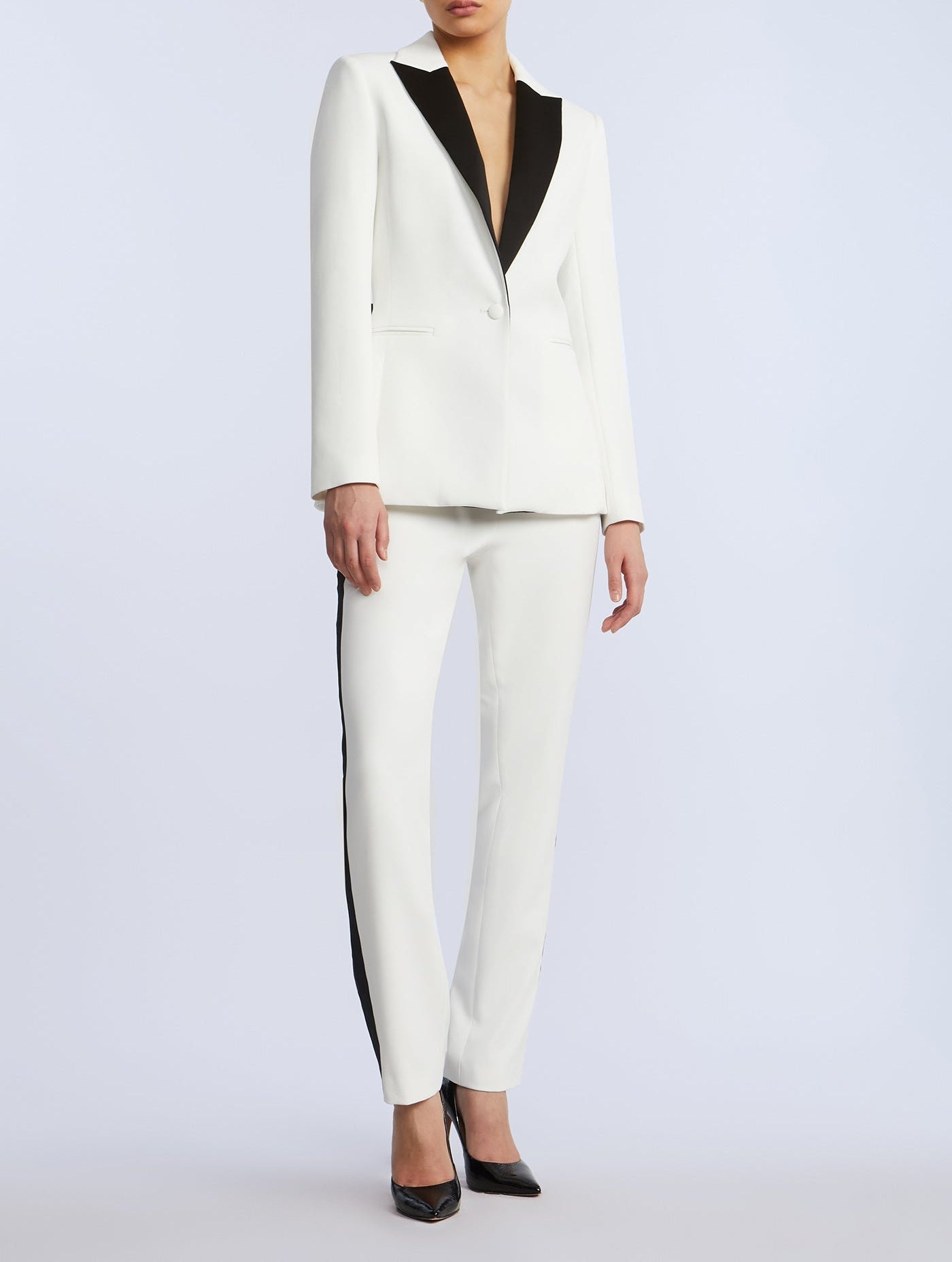 White suiting blazer with tonal satin lapels and a single button closure. Fully lined with soft shoulder structure and jet pockets. Sharp, clean, and designed to turn heads.