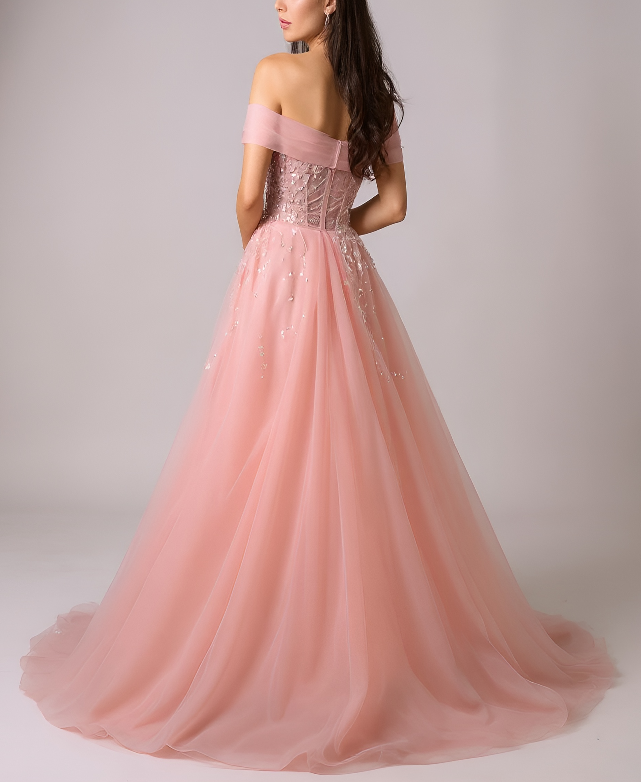 Pair with statement earrings and a sleek clutch to highlight the intricate embroidery. Opt for a high bun or soft waves to complement the off-shoulder neckline.