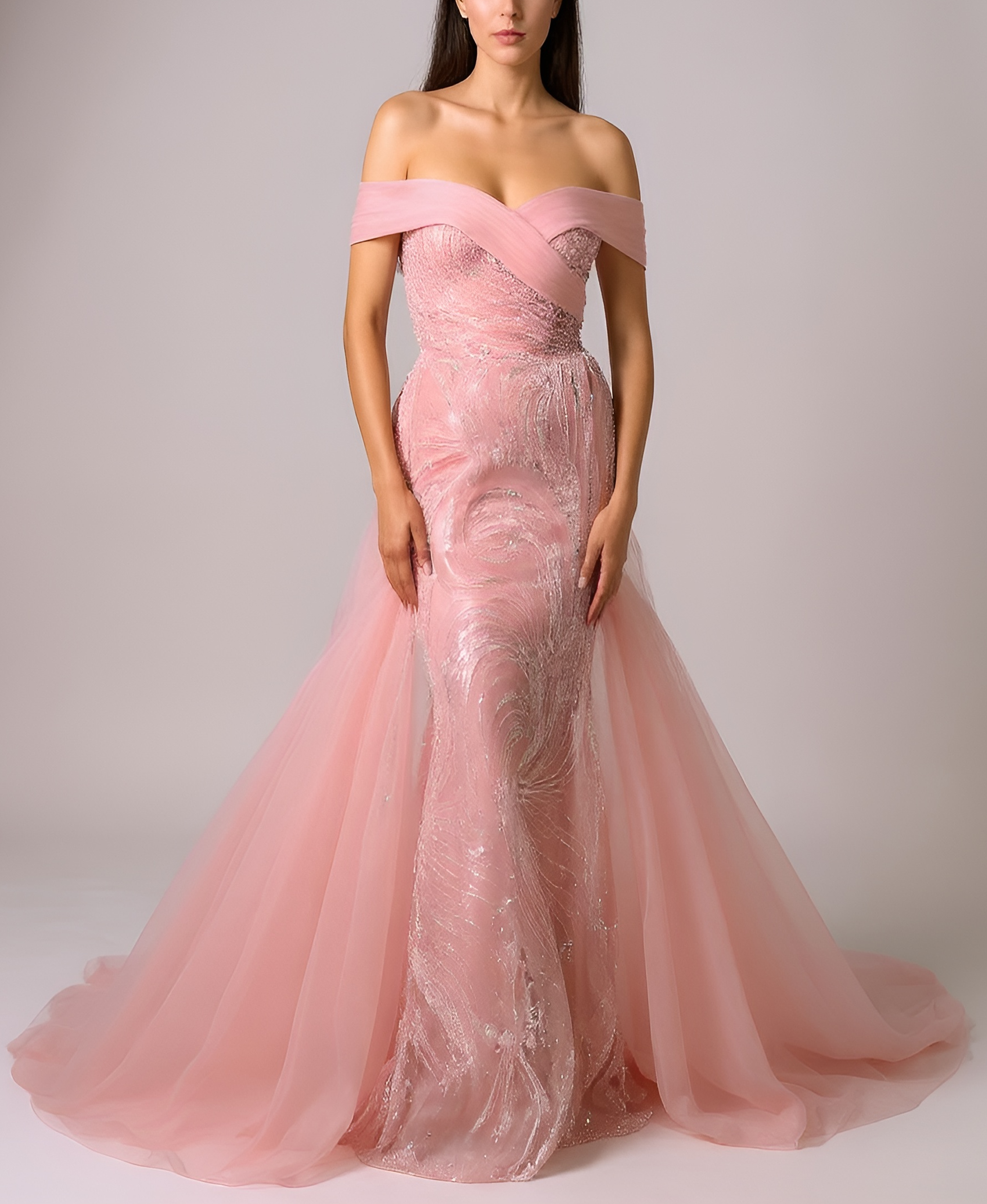 Off-shoulder Body-fitting Shimmering Floor-length Overskirt Dress