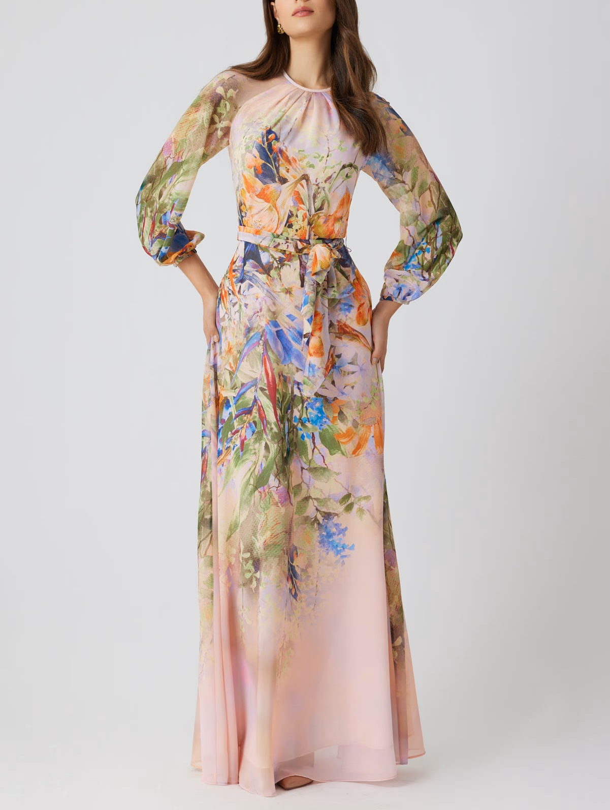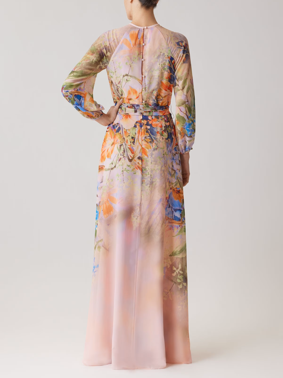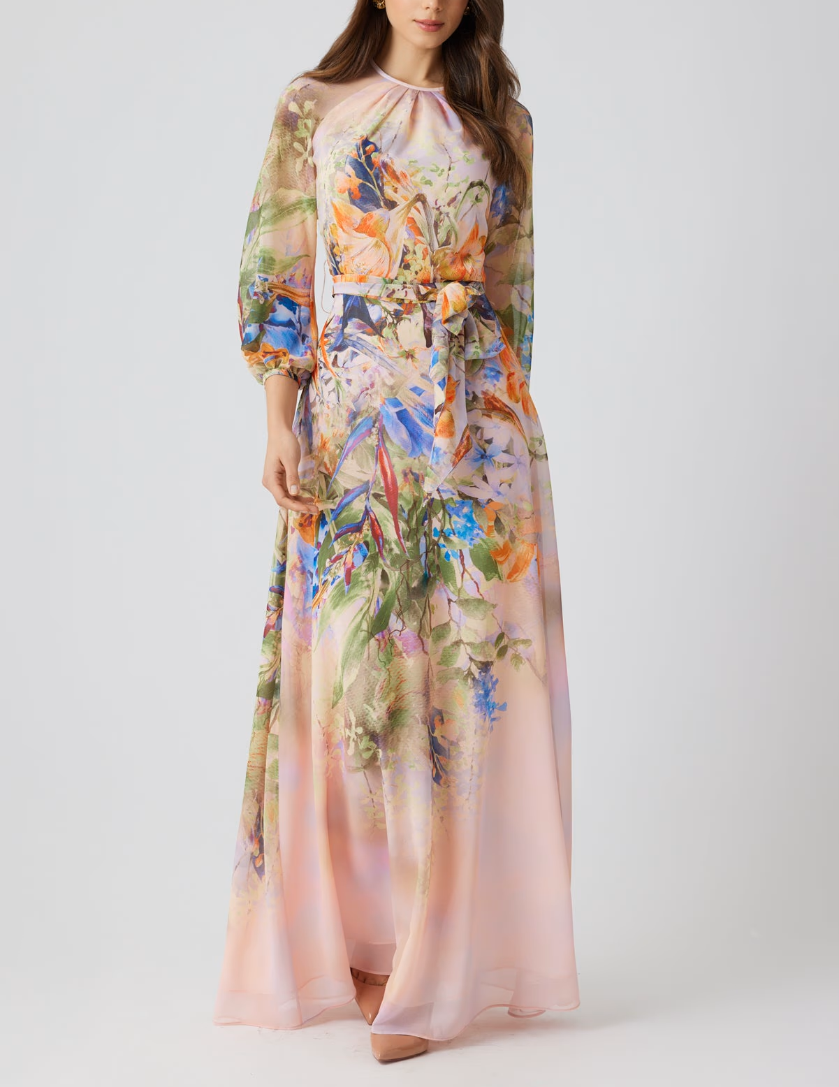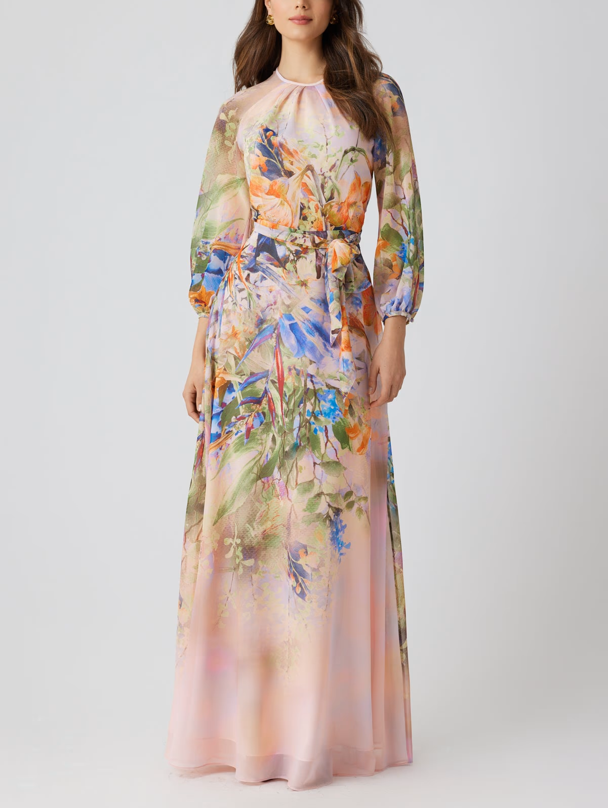 Style it with nude or metallic heels, delicate floral-inspired jewellery, and a soft updo or loose waves. Opt for dewy makeup with a subtle smokey eye and a nude lip to complement the gown’s romantic floral print.