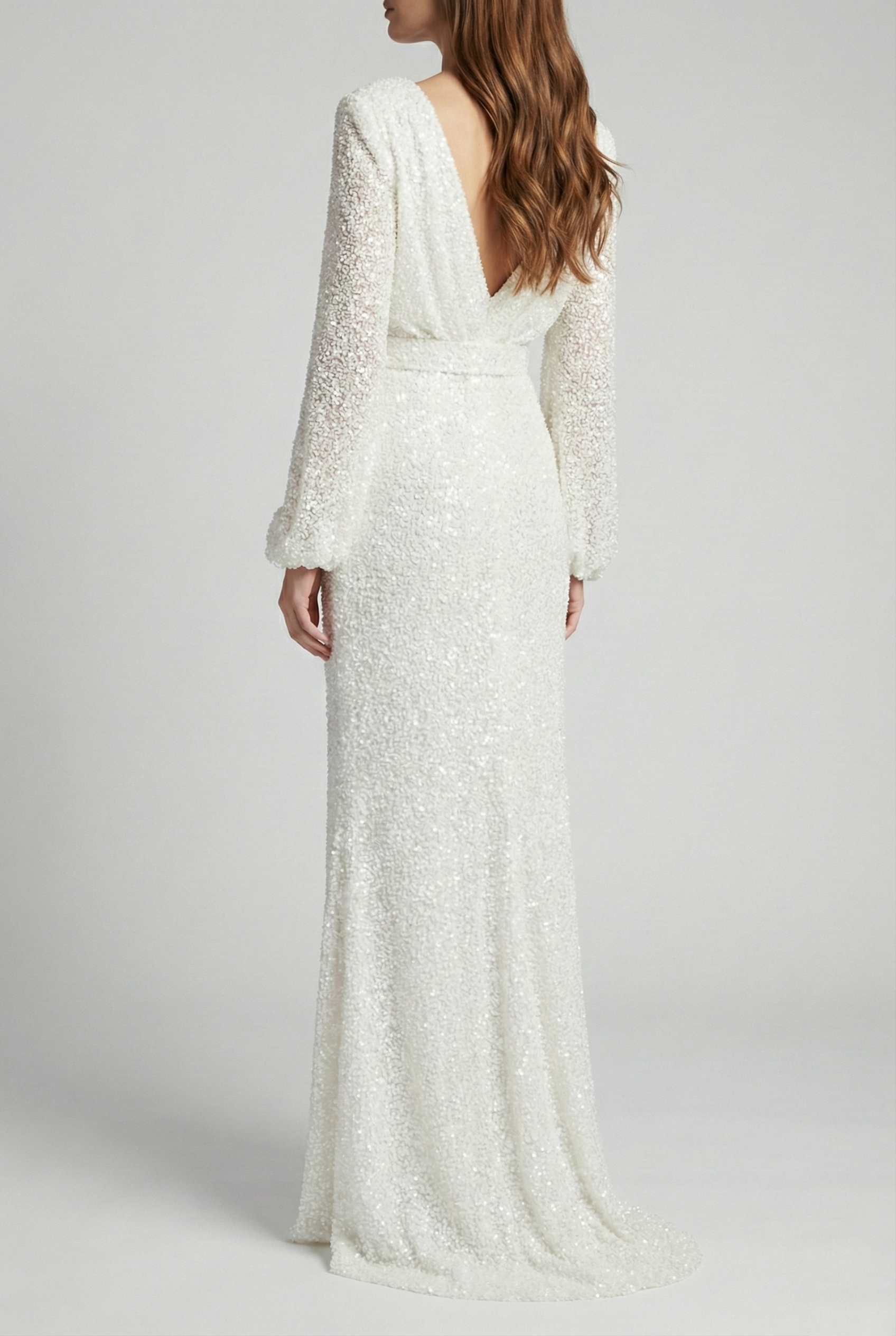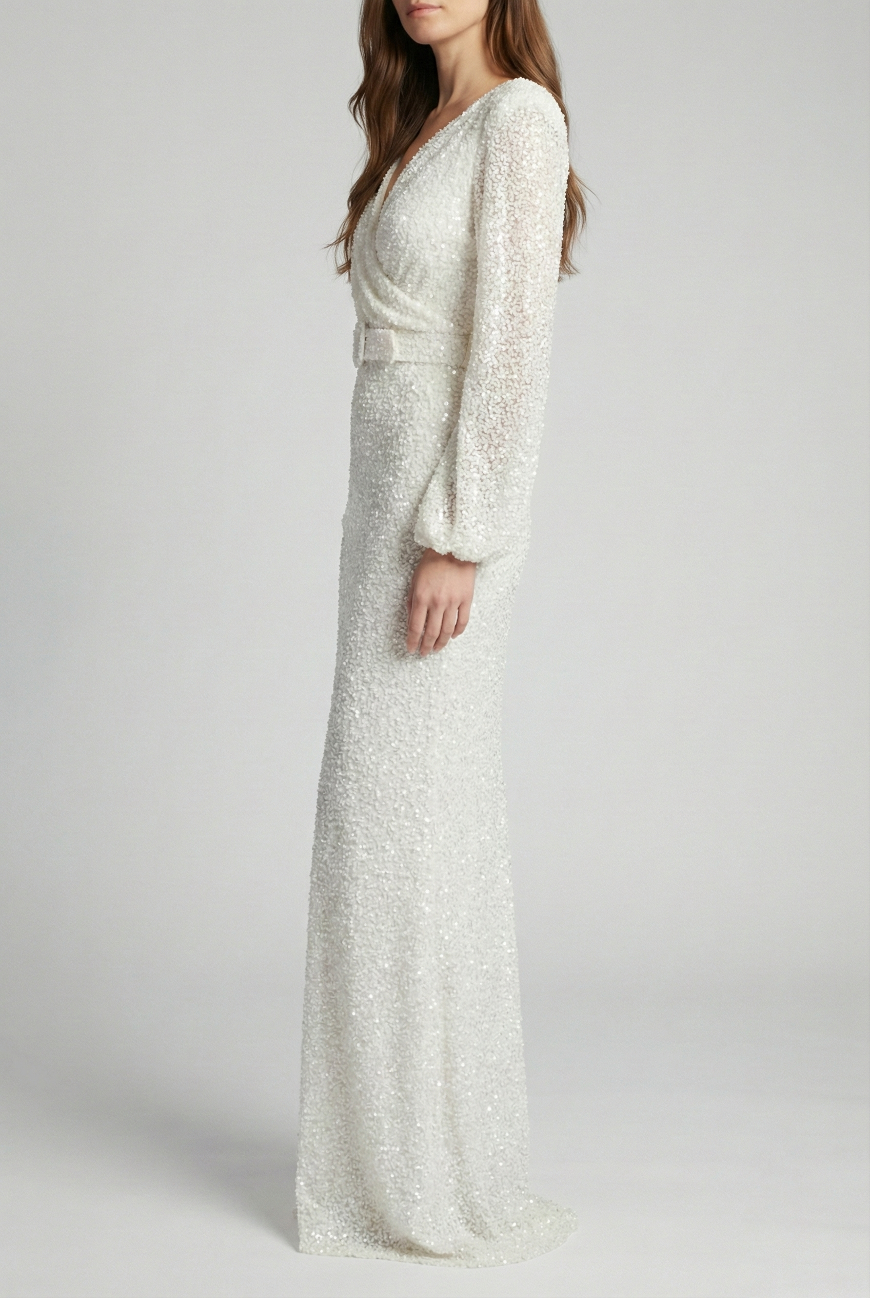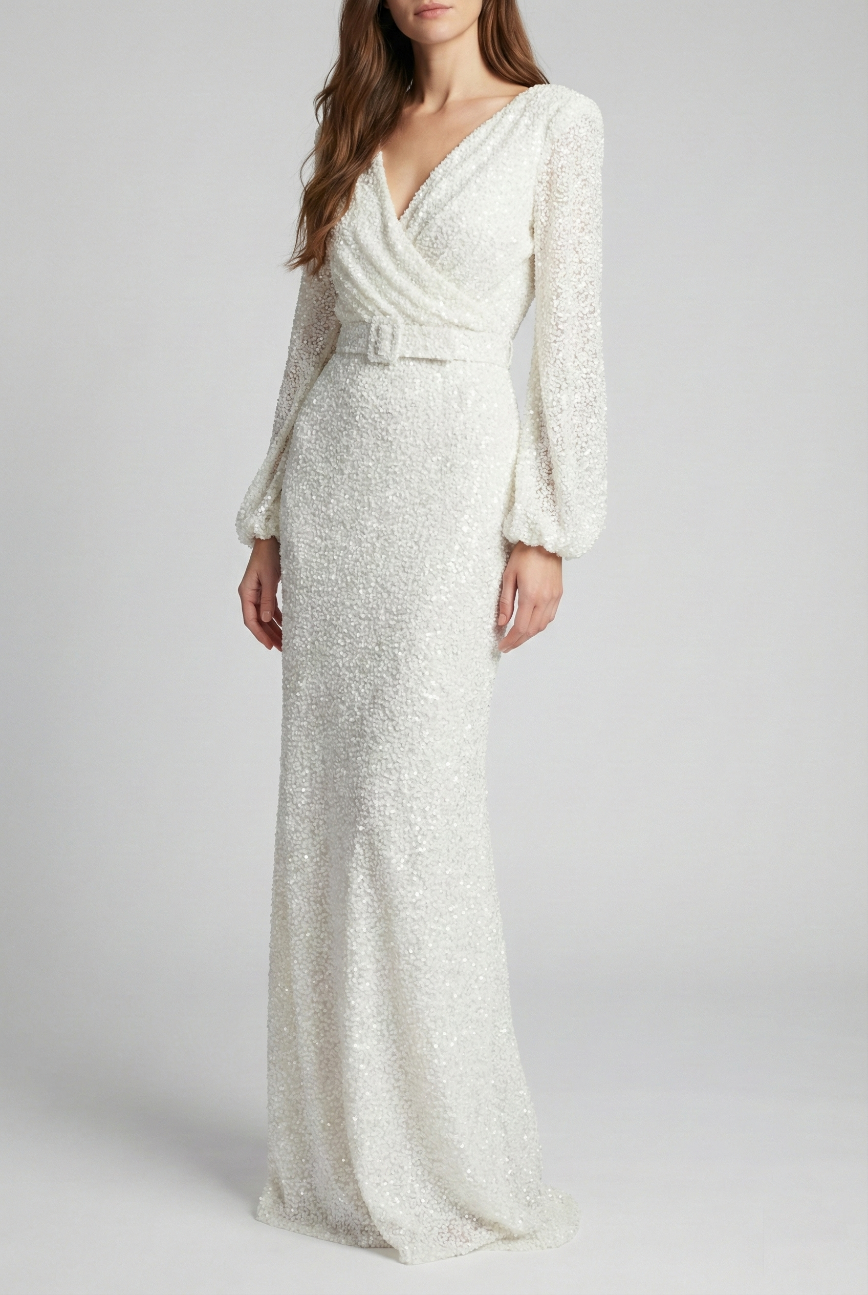 Long Sleeve Sequin Belted Evening Gown