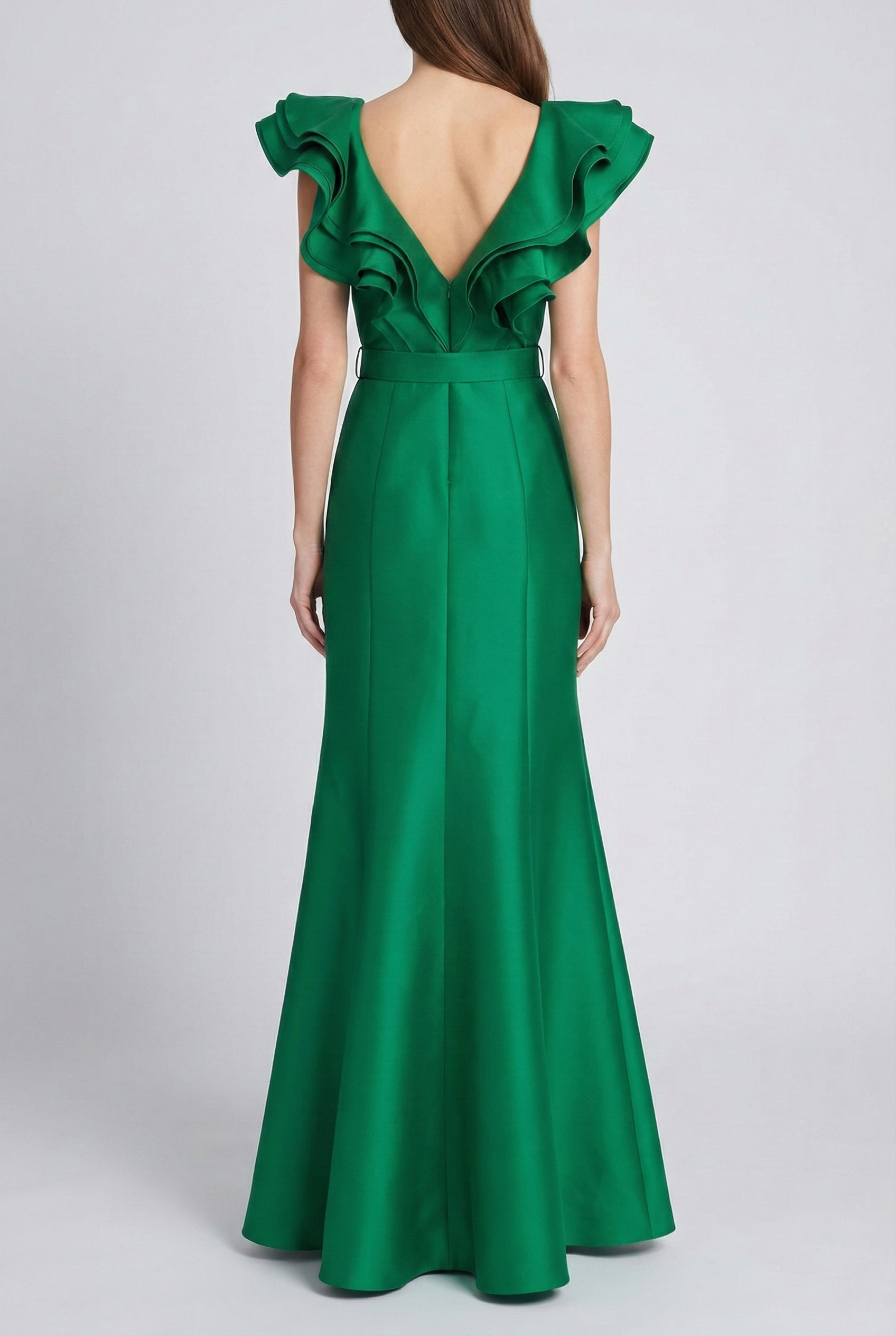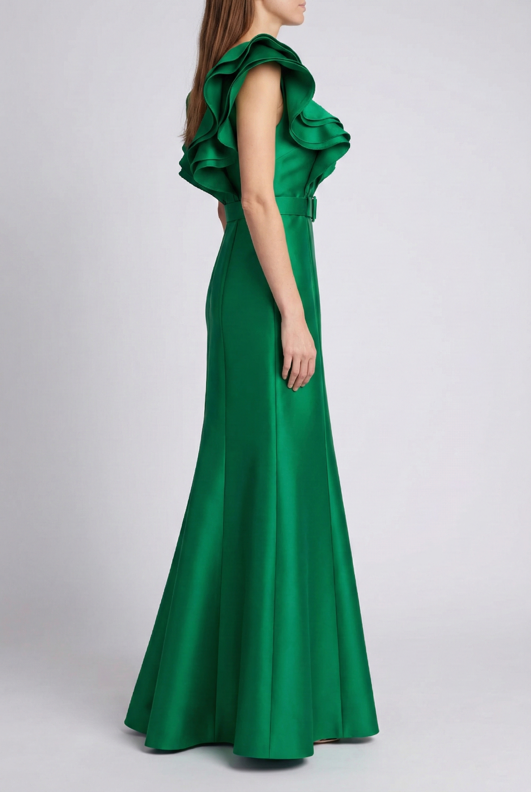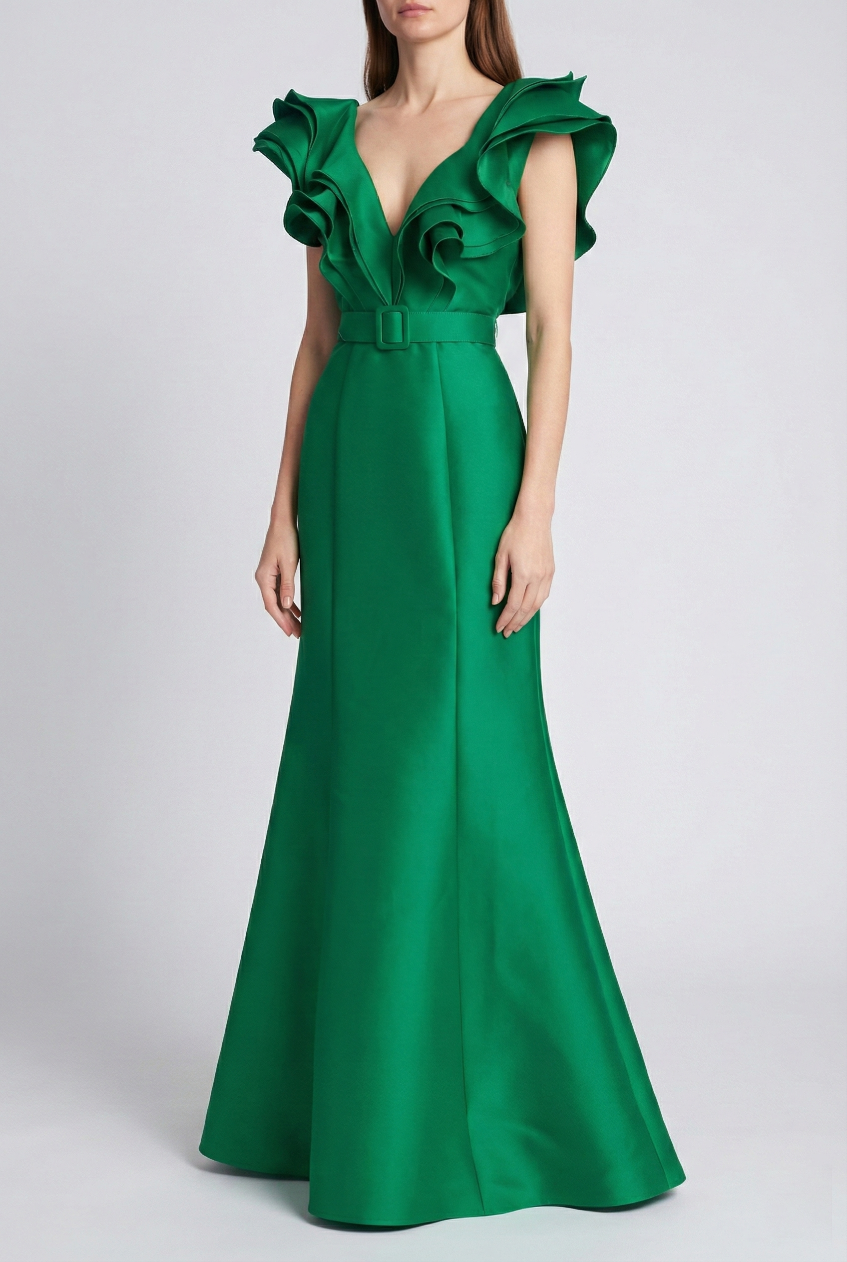 Ruffled Neckline Belted Trumpet Gown