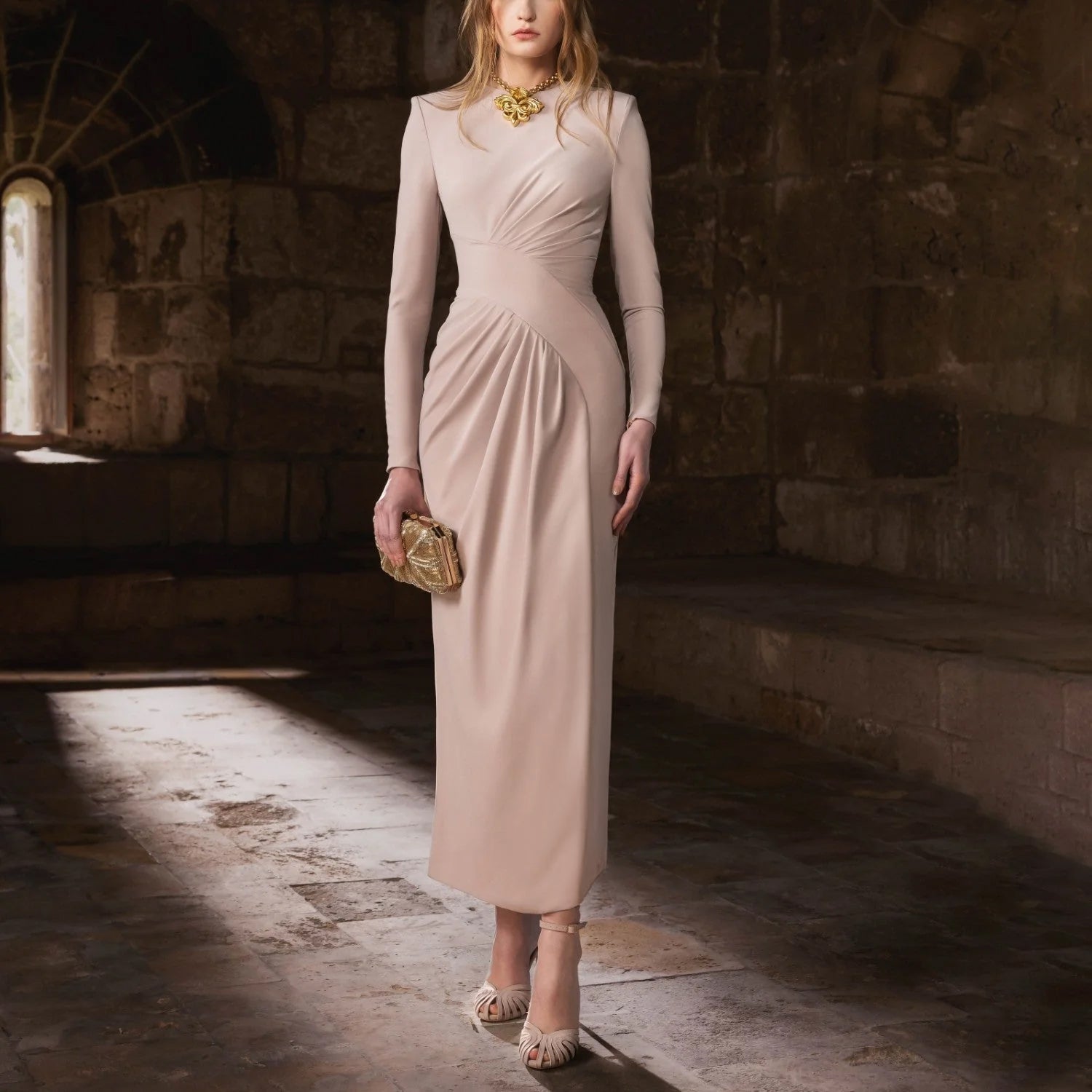 A warm grey crepe midi dress with a round neckline, long sleeves, waist draping, and a bold thigh-high slit, blending structure with movement.
