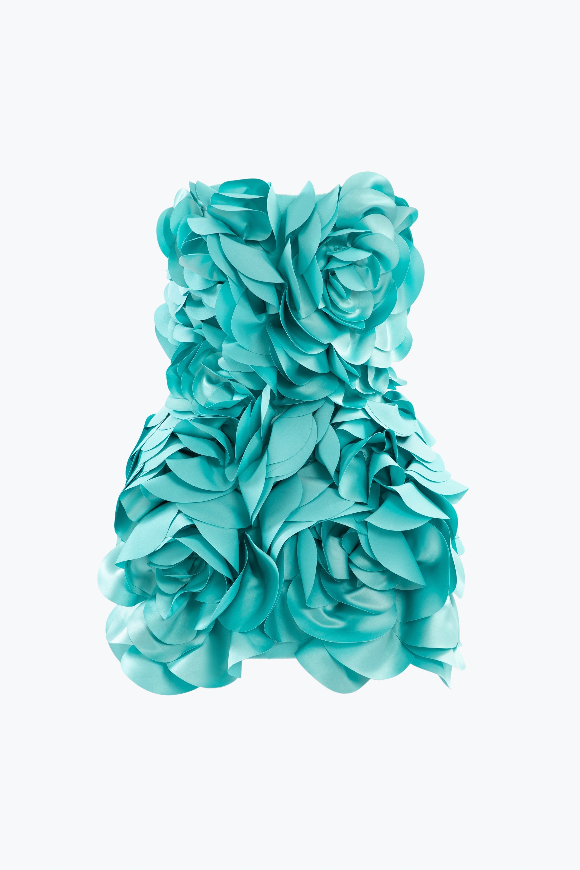 Aqua sky 3D floral mini strapless satin dress is fully adorned with flower petals, creating captivating 3D floral shapes.