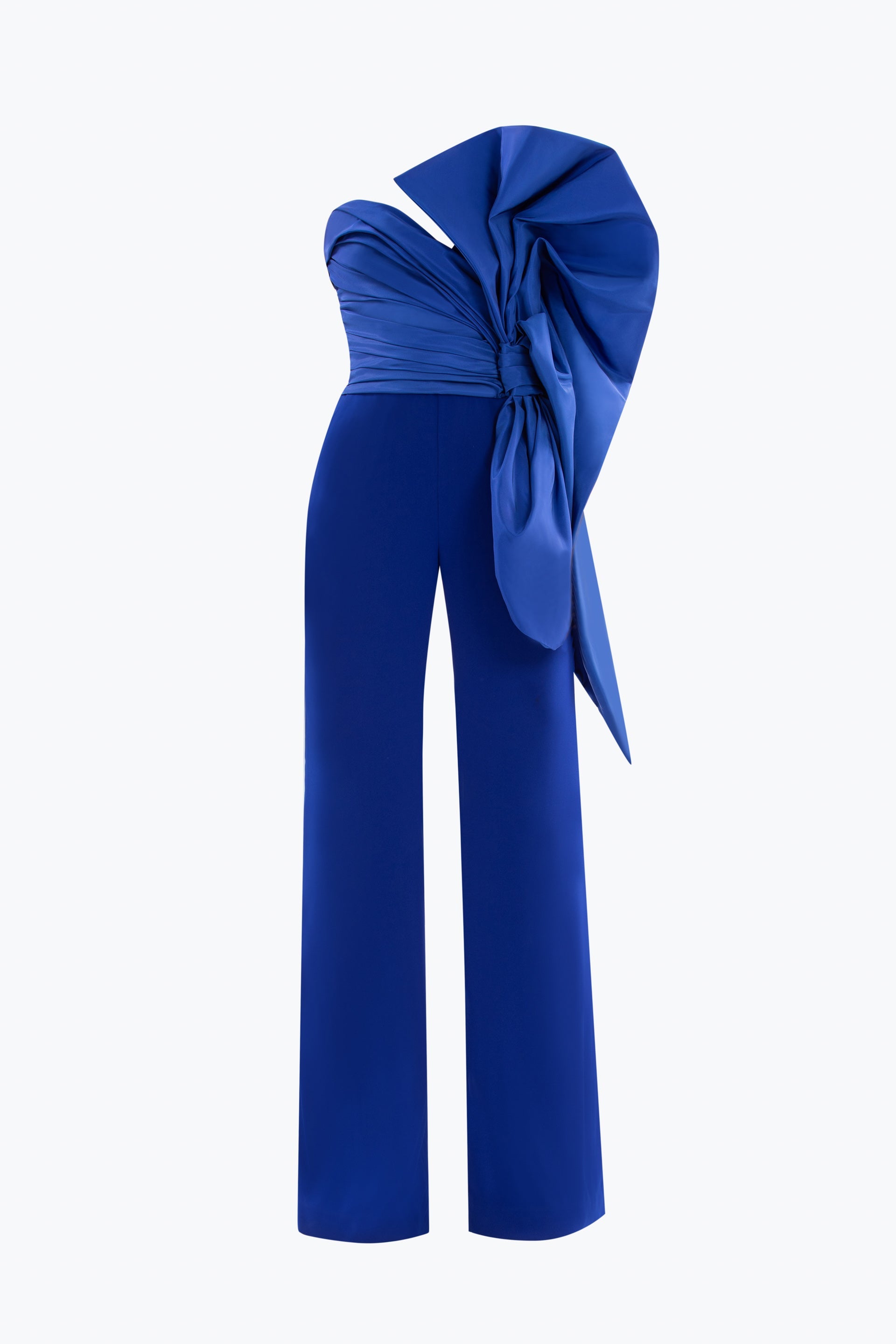 Spectrum Blue crepe strapless jumpsuit, featuring straight-cut pants and a draped taffeta moulage on the bodice. Accentuating the waist is a striking large gathered bow, adding a touch flair to the ensemble.
