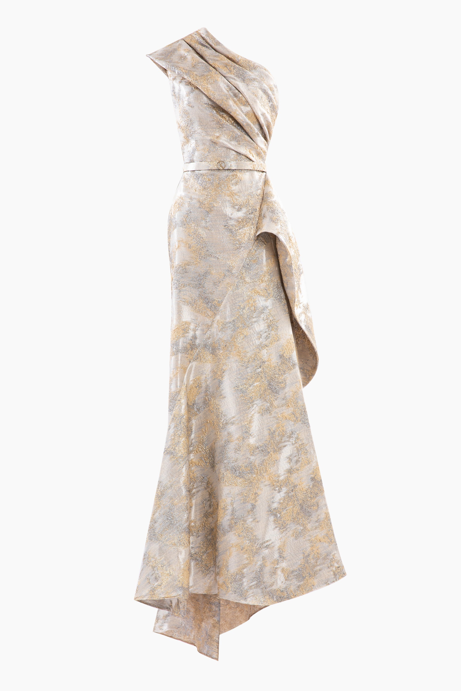 One-shoulder silver and yellow pear pleated brocade dress features a floor-length skirt with ruffles on one side and a stylish slit. It is paired with a matching SK belt