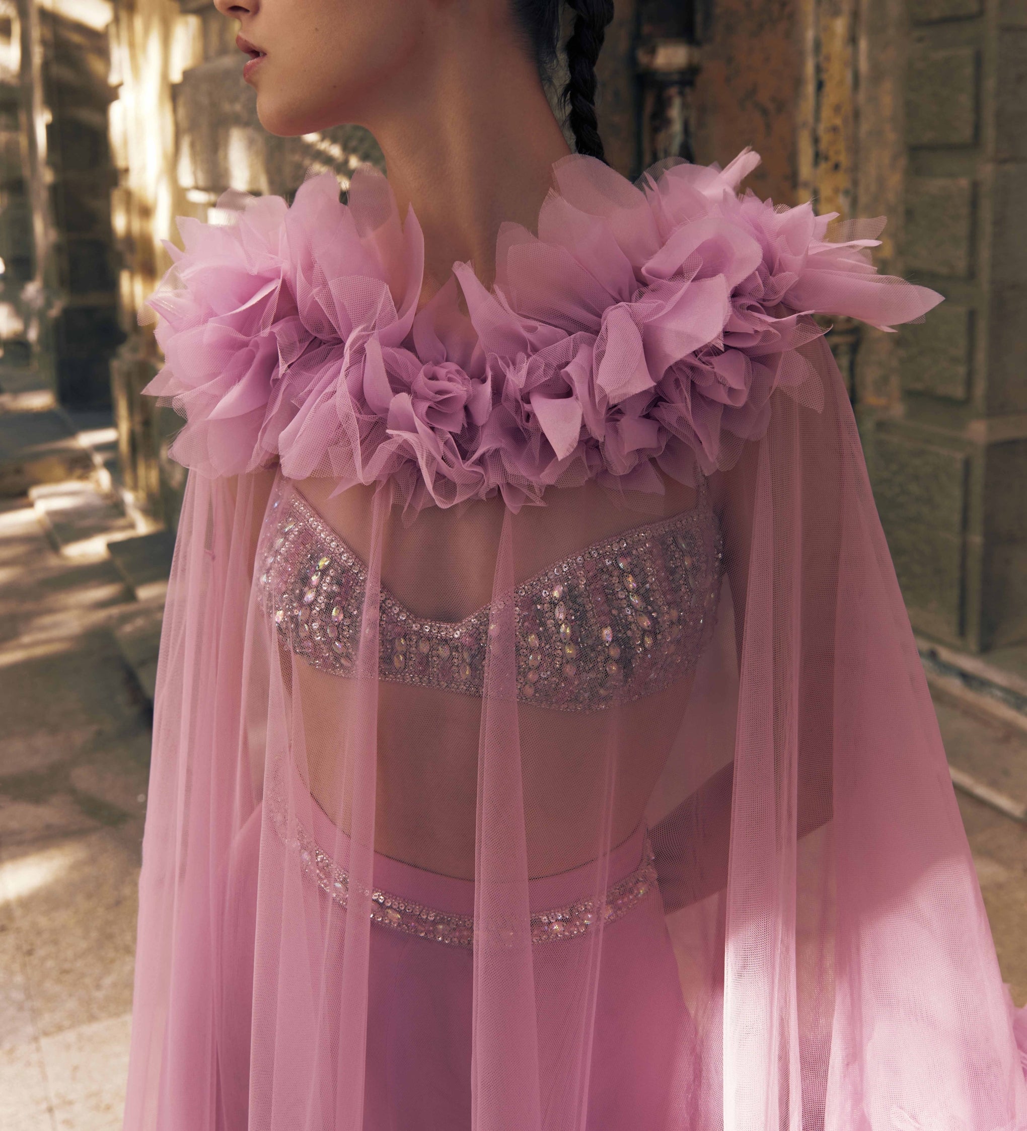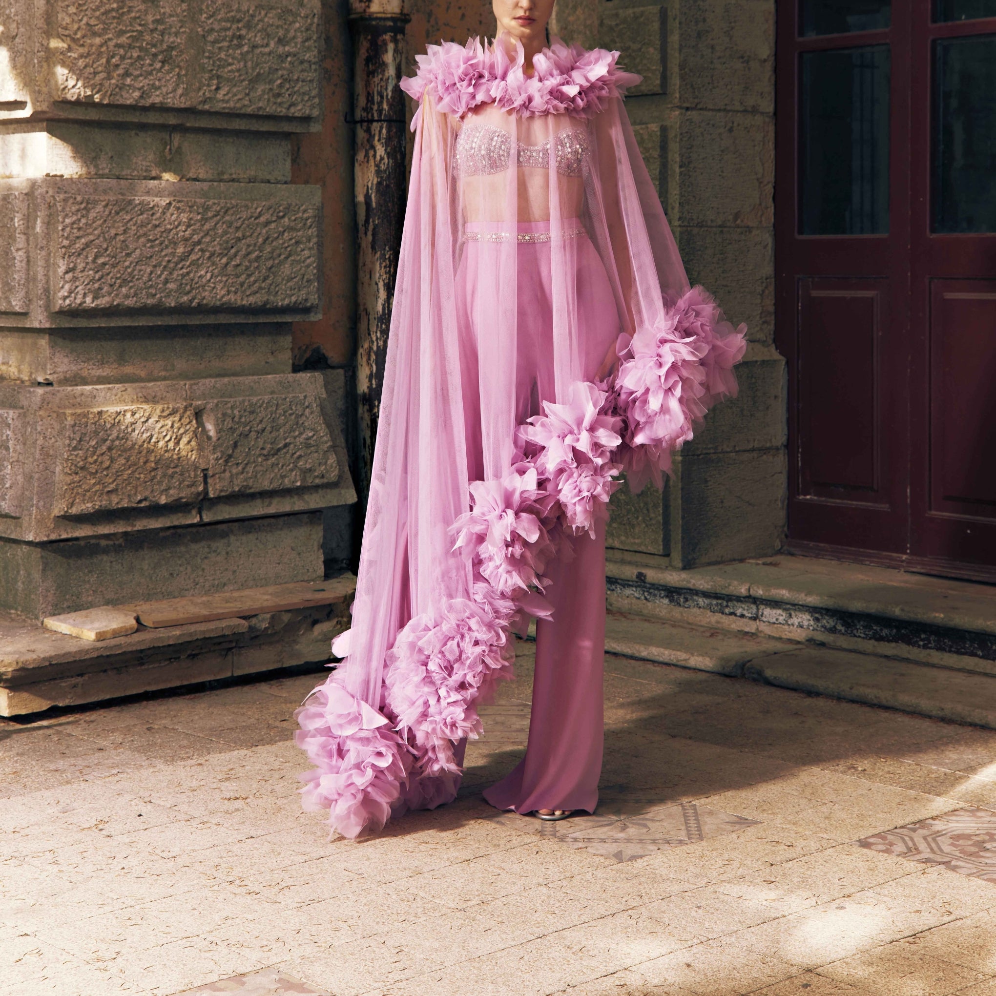 Silk Georgette Trousers with an embroidered bustier and an asymmetrical ruffled tulle cape